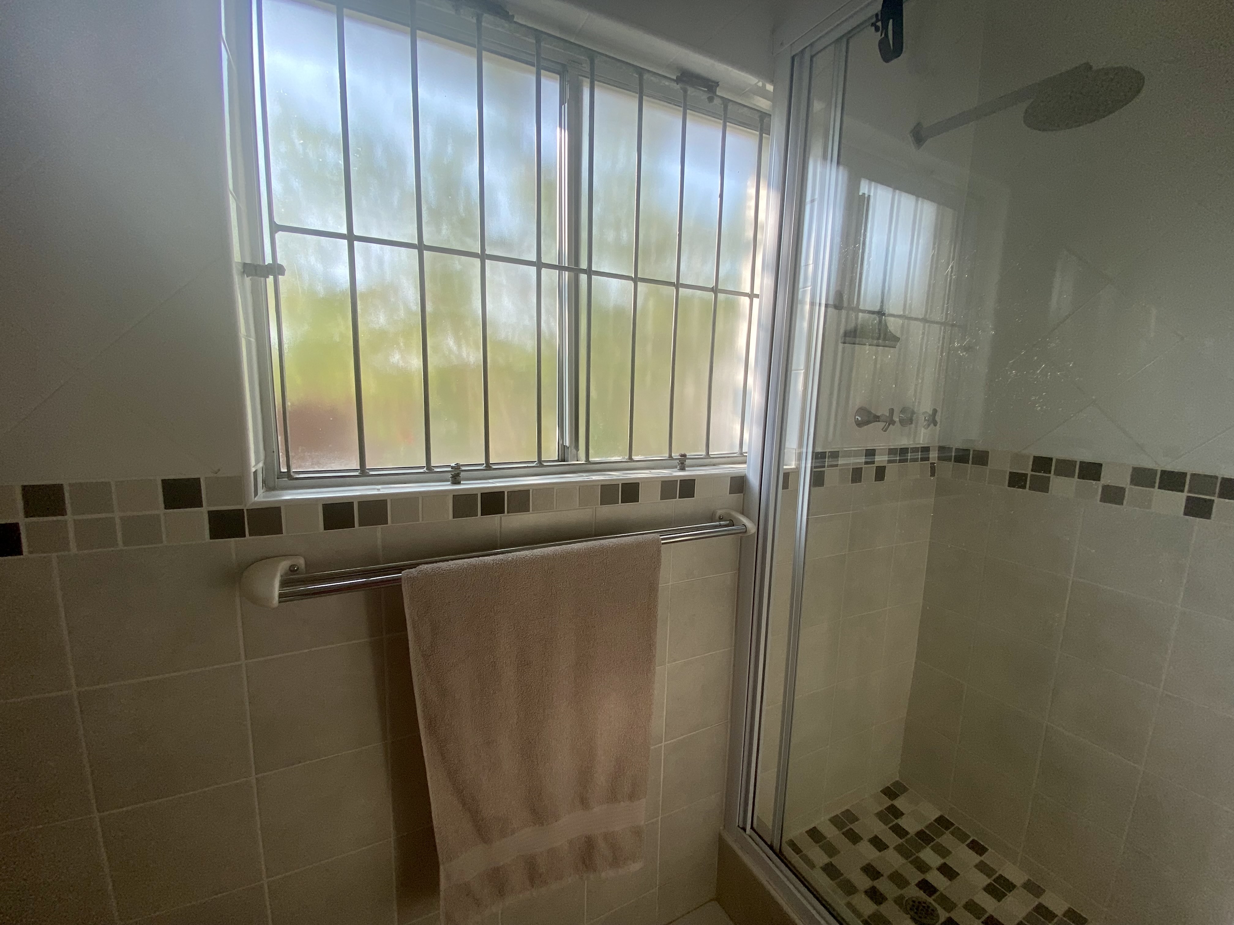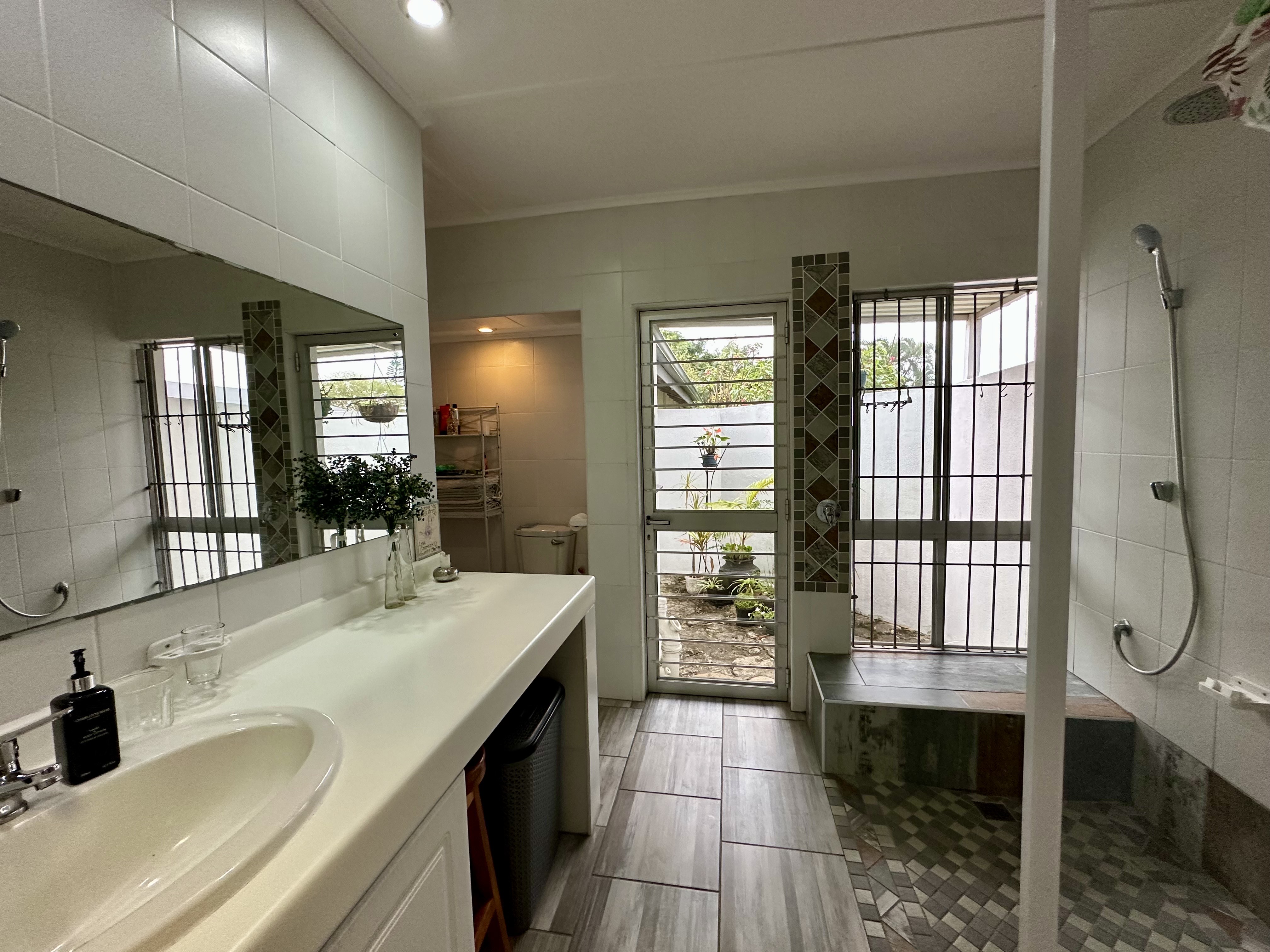 The home features four generously sized bedrooms, all with built-in cupboards. The family bathroom includes a shower, basin, and toilet, while the main en-suite offers a luxurious open shower with a private garden view – delivering a tranquil, spa-like experience.