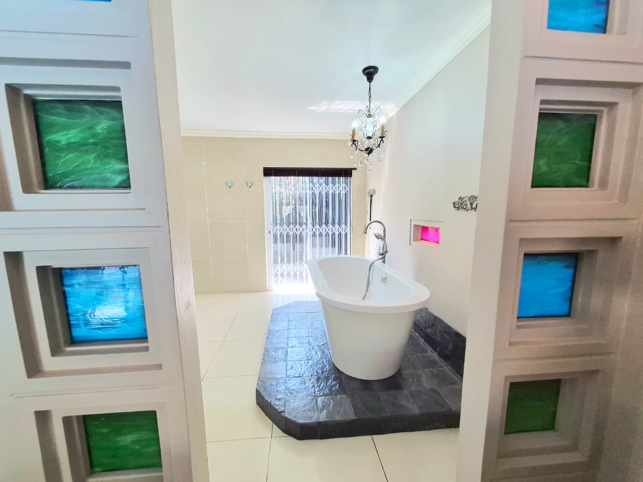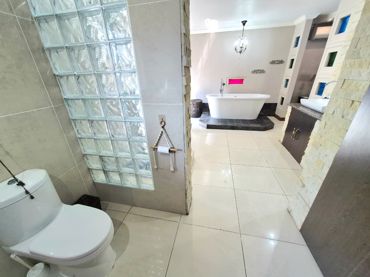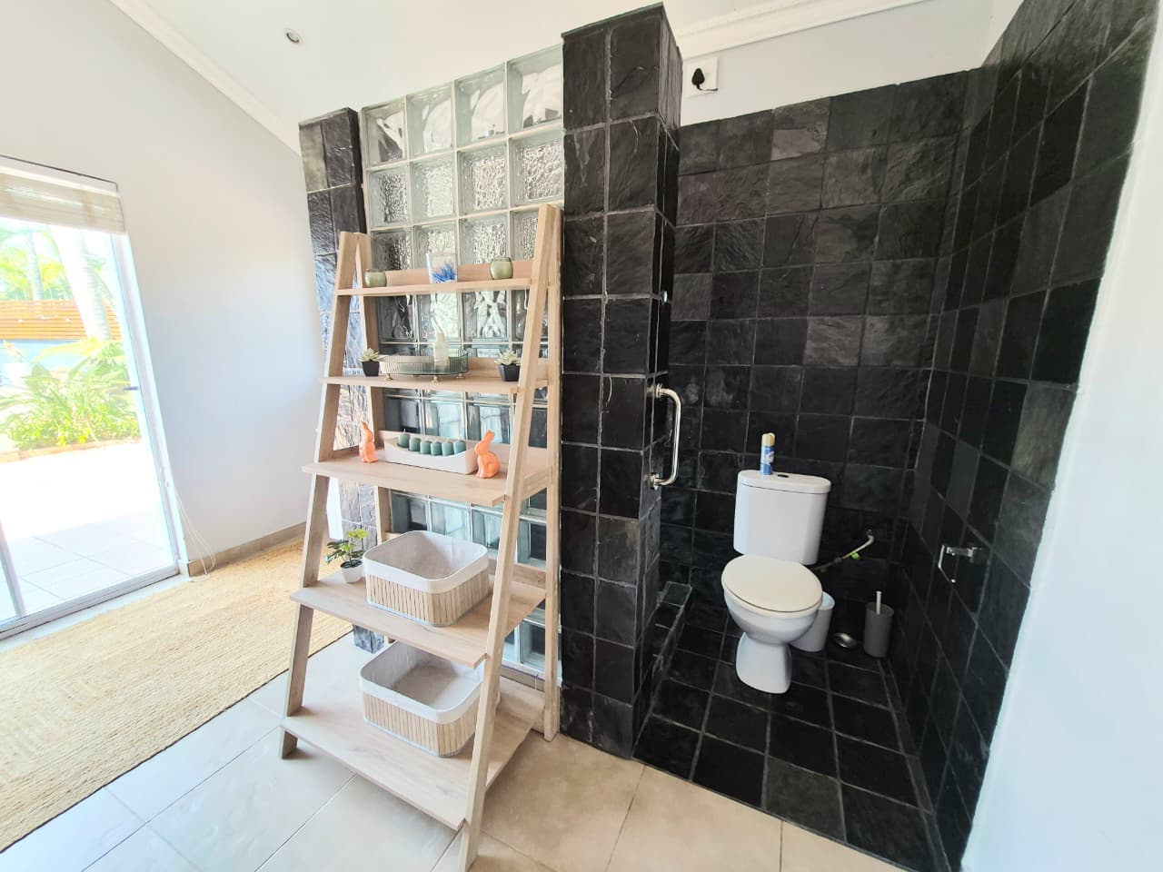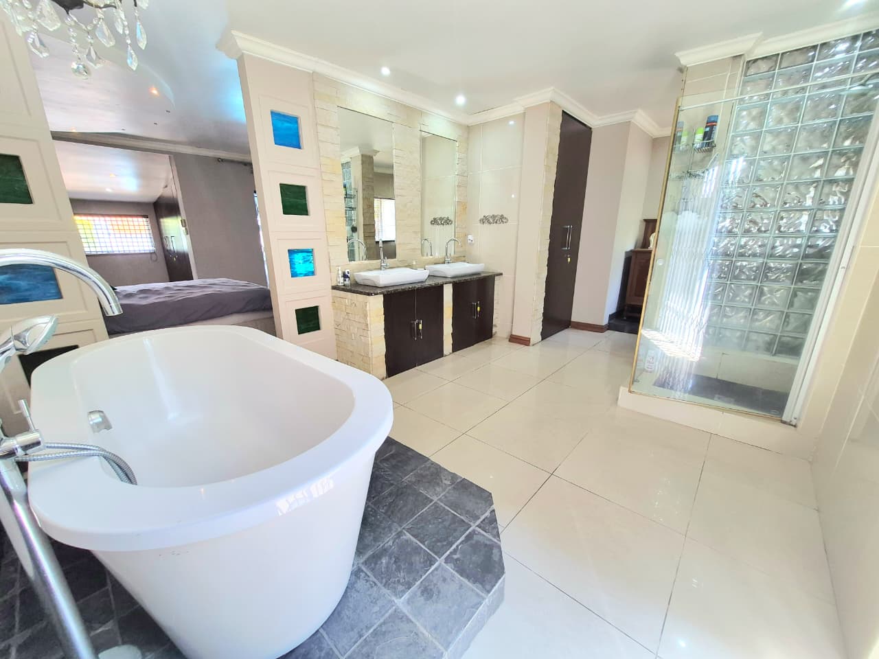 The luxurious master suite includes a spa-style en-suite with double vanities, freestanding bath, and indoor–outdoor shower. Two additional en-suite bedrooms and a private guest suite ensure comfort and privacy for family and visitors, while a separate upstairs home office with balcony completes the accommodation.