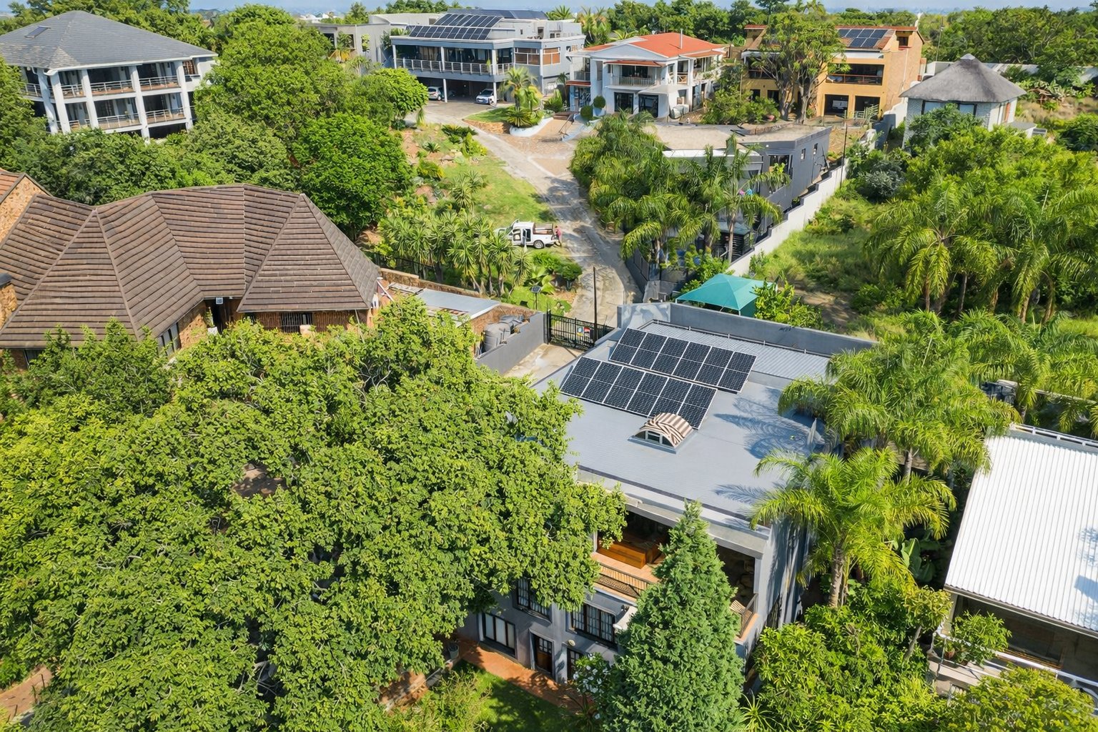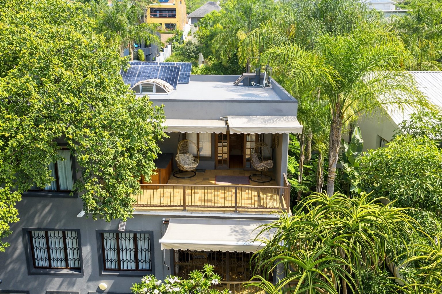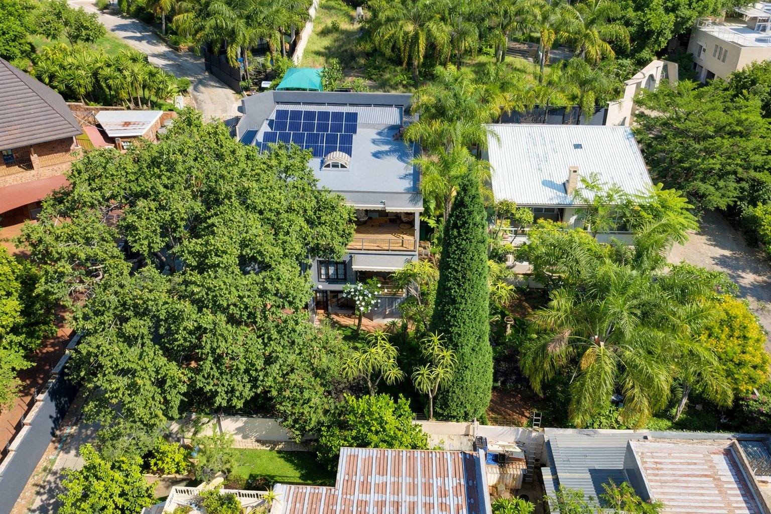 Designed for comfortable living, the home includes two lounges one downstairs and another on the top floor along with a spacious dining area on the ground level. Upstairs, you will also find a built-in bar and an additional lounge that opens onto a first-floor patio fitted with burglar bars and roll-up canvas blinds. Another patio features a relaxing jacuzzi, and the rooftop patio hosts the home's 8 solar panels, offering beautiful views and added utility.