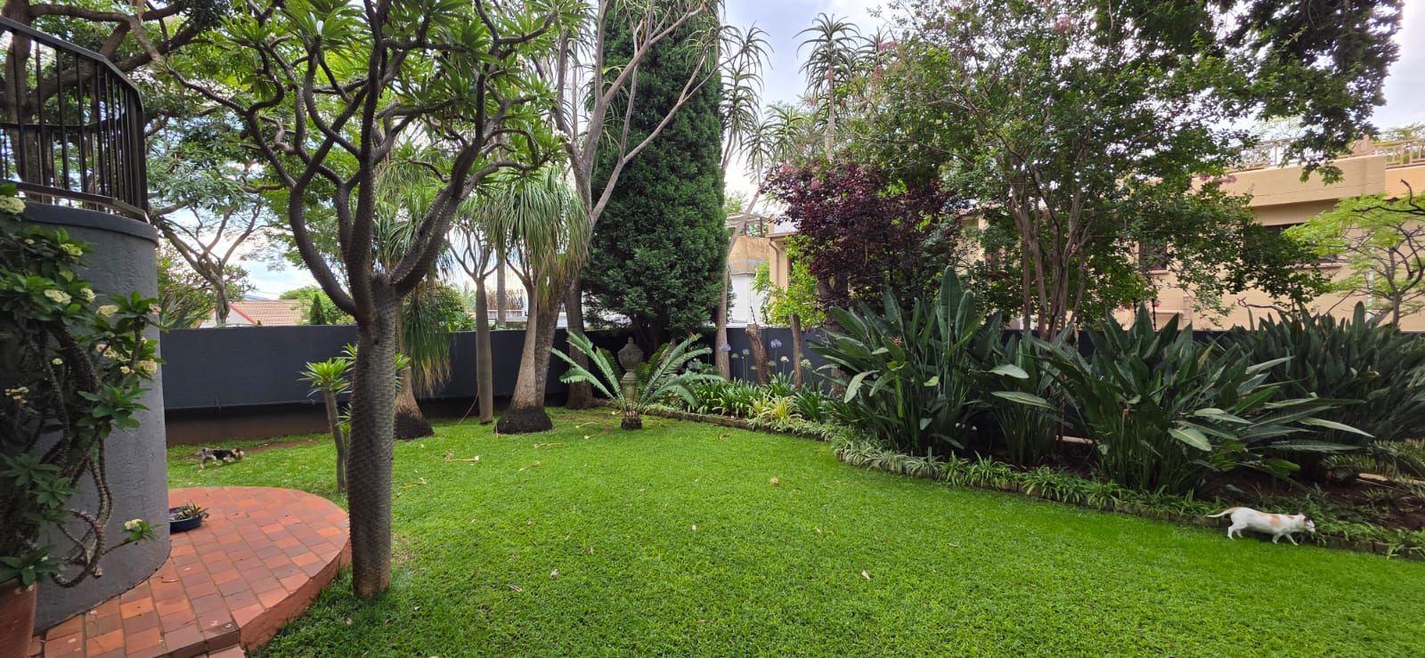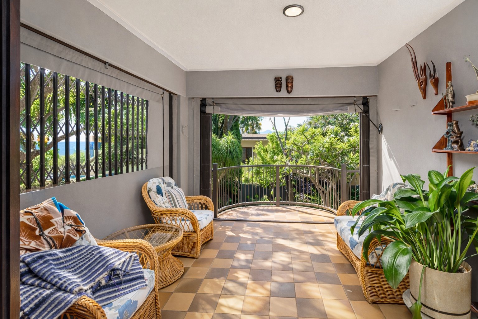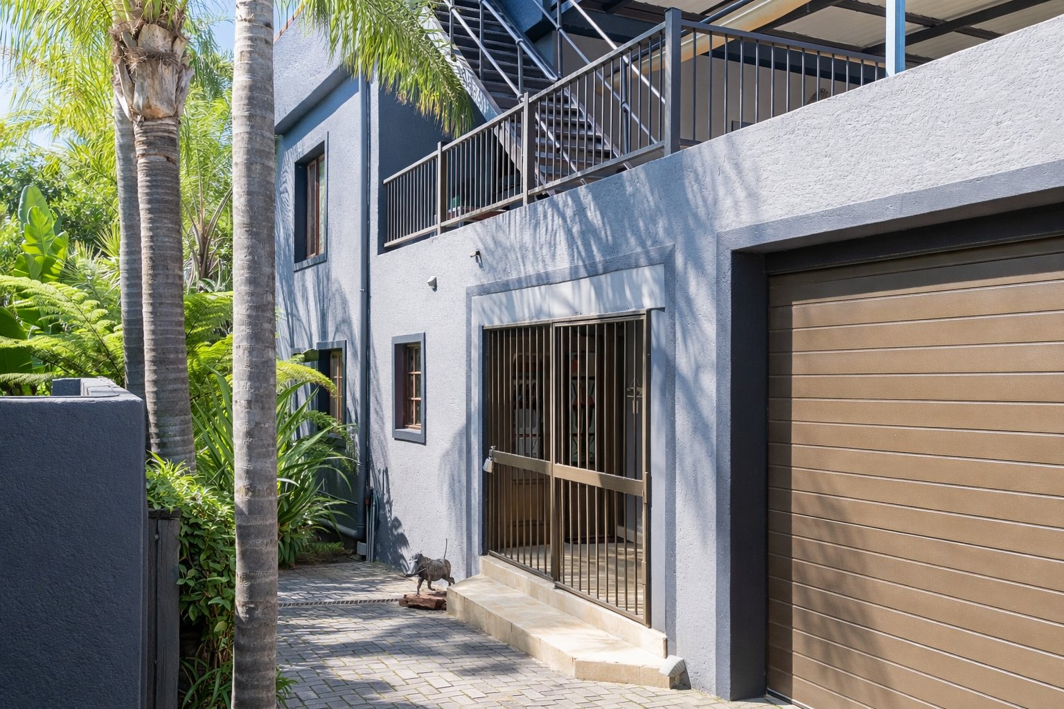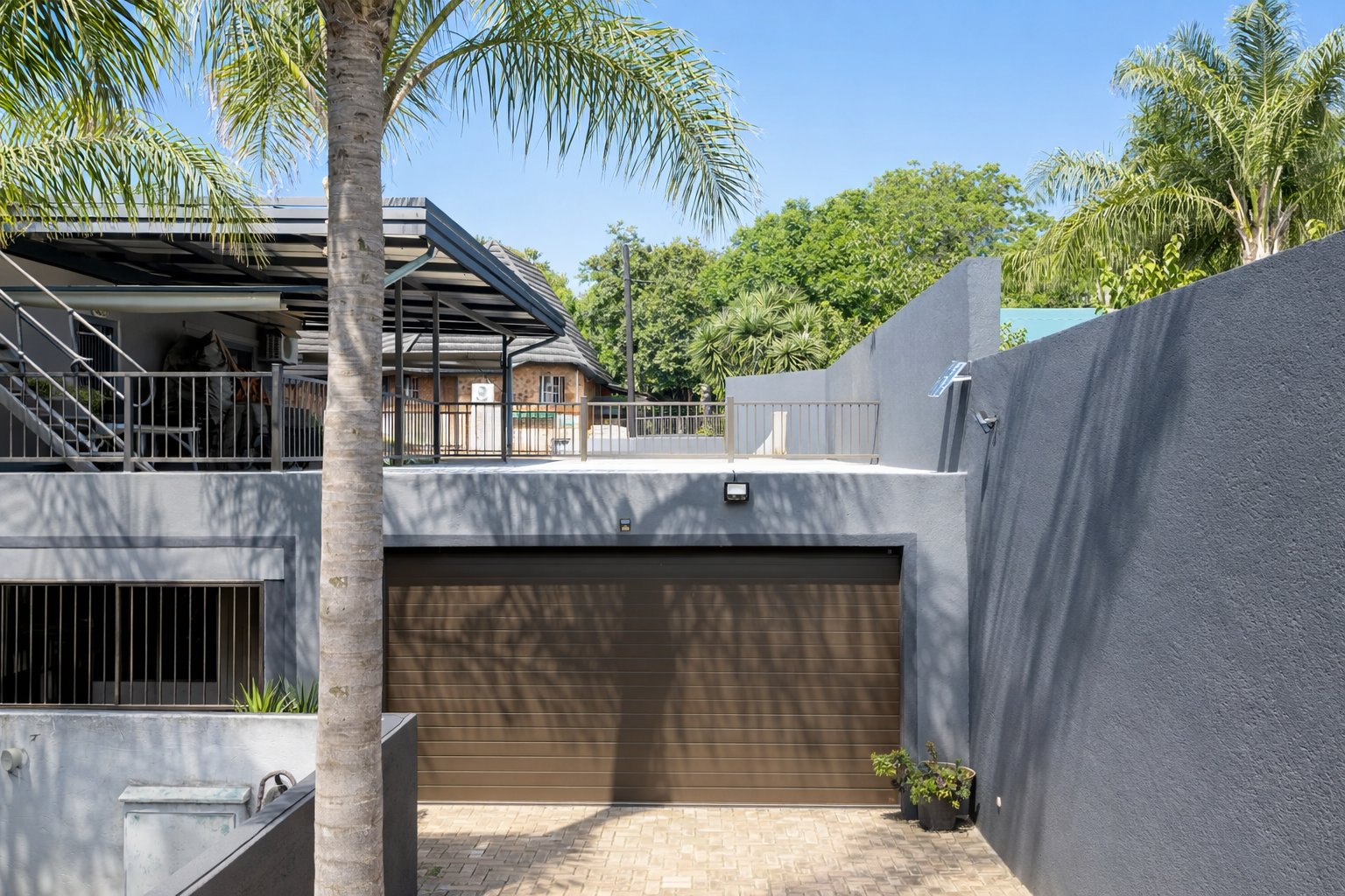 Designed for comfortable living, the home includes two lounges one downstairs and another on the top floor along with a spacious dining area on the ground level. Upstairs, you will also find a built-in bar and an additional lounge that opens onto a first-floor patio fitted with burglar bars and roll-up canvas blinds. Another patio features a relaxing jacuzzi, and the rooftop patio hosts the home's 8 solar panels, offering beautiful views and added utility.