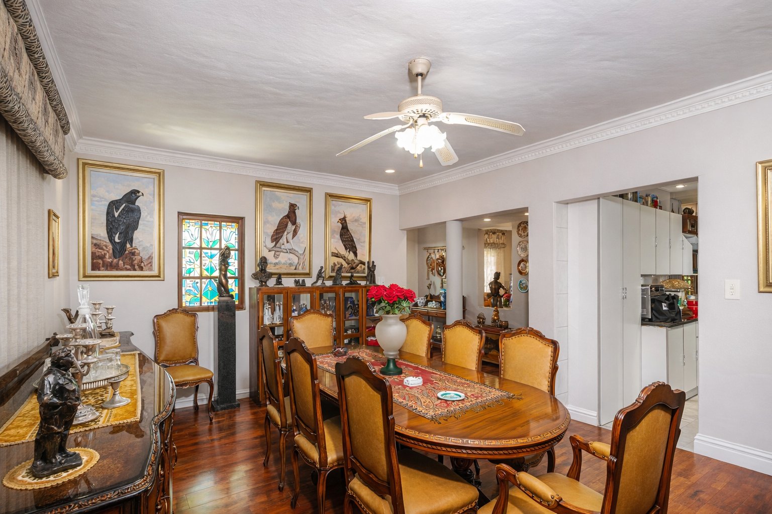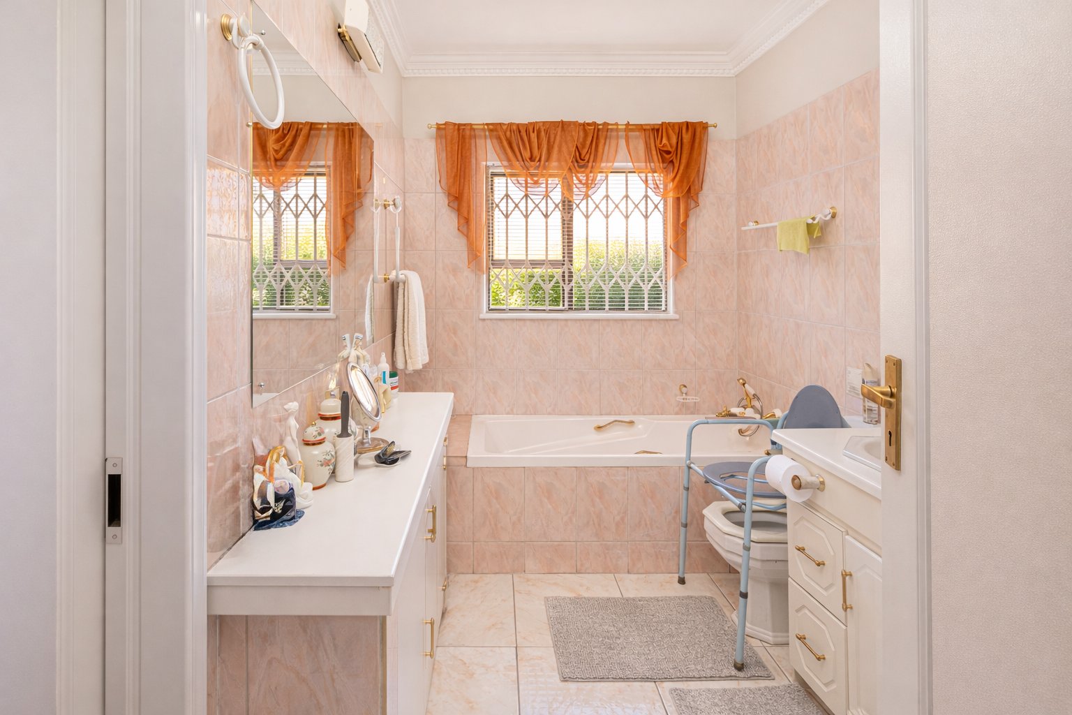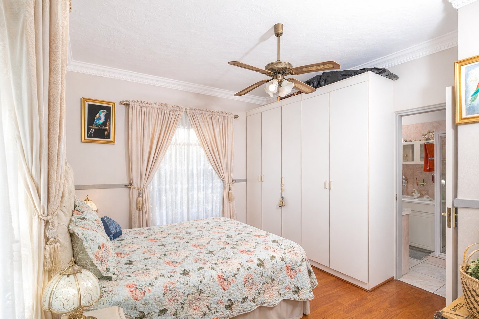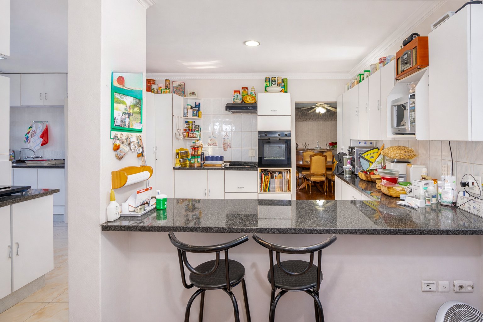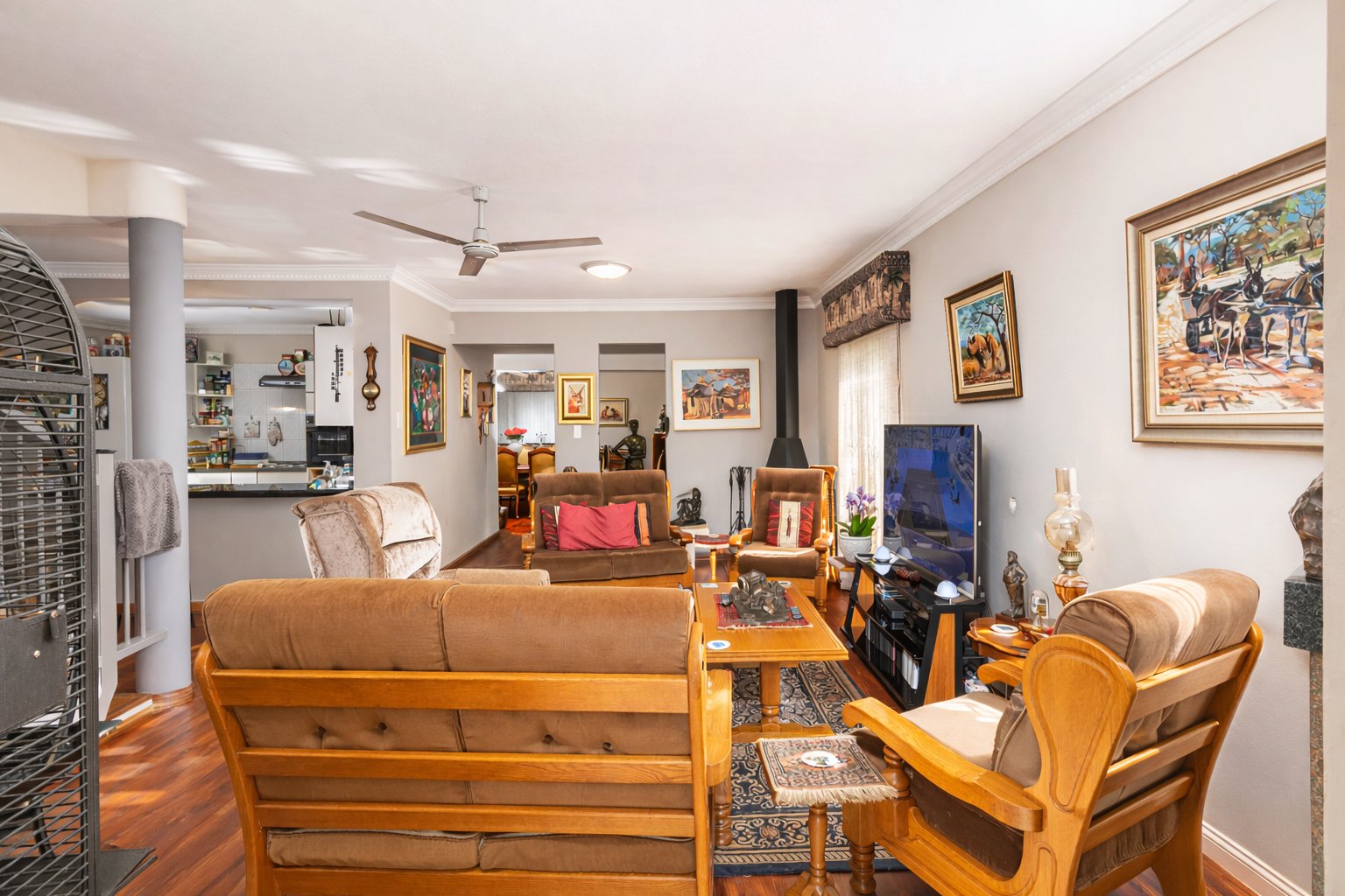 The property features 2.5 bathrooms as well as an outside toilet for added convenience. The large open-plan kitchen includes a scullery, while a separate outside laundry room provides ample cupboard space and keeps daily chores neatly tucked away.