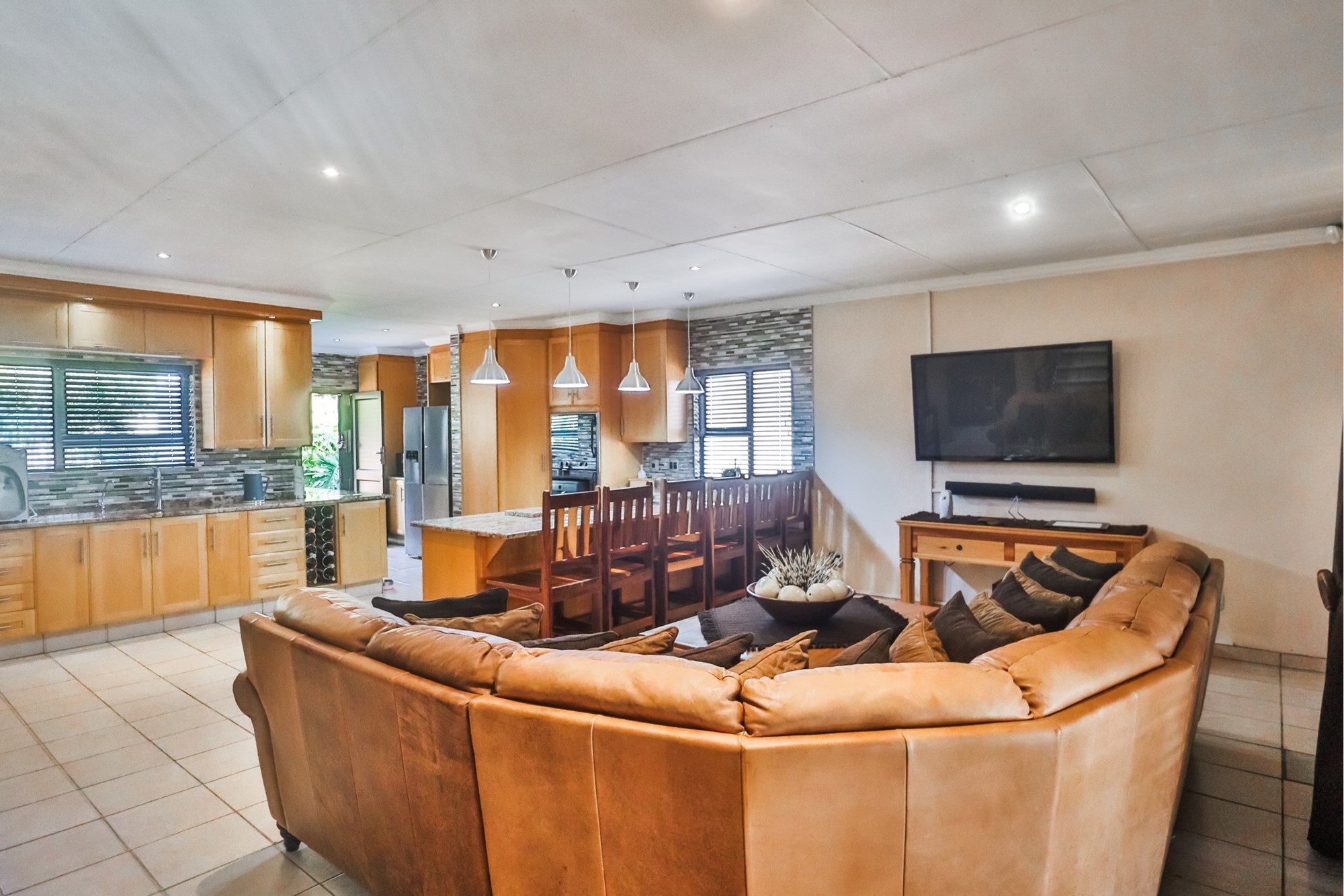 Ascend the staircase to discover a beautiful, expansive open plan living area. This floor seamlessly integrates the living room and dining area as well as the open plan kitchen, creating a perfect space for both relaxation and entertaining. - *Stoop with Built-in Braai:* Step out onto the stoop to find a built-in braai (barbecue) and a spacious lounging area, perfect for outdoor gatherings and enjoying the serene views.