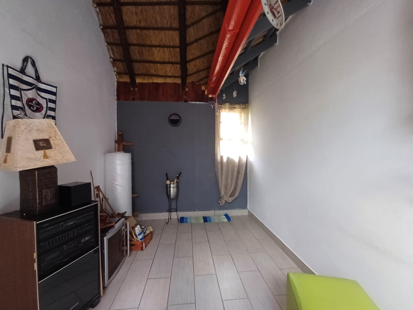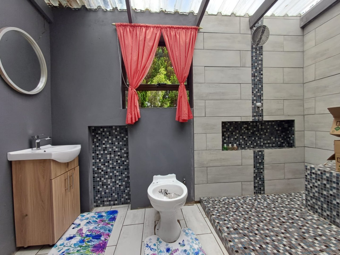 The main house boasts three spacious bedrooms, all equipped with ceiling fans. The main bedroom includes an en-suite bathroom with a shower and toilet, while a full bathroom serves the rest of the home. A welcoming entryway leads into a cozy living room with a fireplace, a dining room, and a well-equipped kitchen featuring built-in cupboards, a scullery, and a modern gas stove. Built-in cupboards in the hallway provide additional storage, and three internal safety gates enhance security.