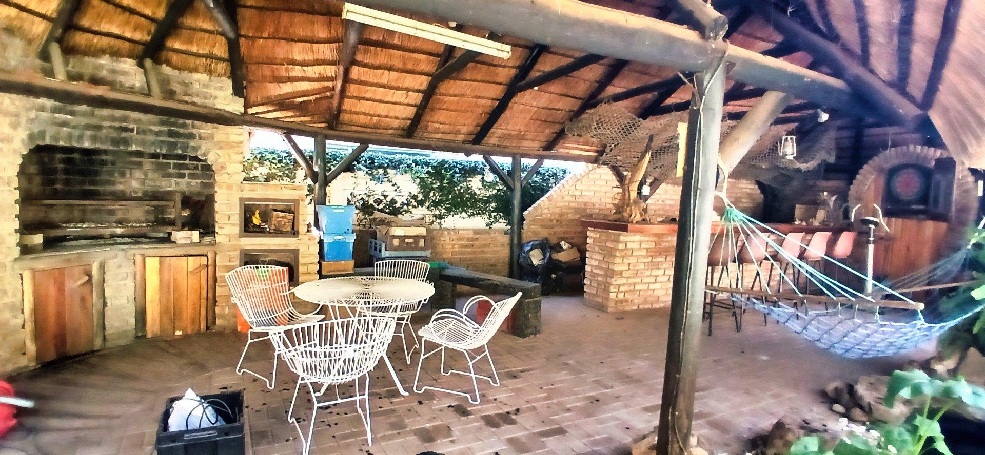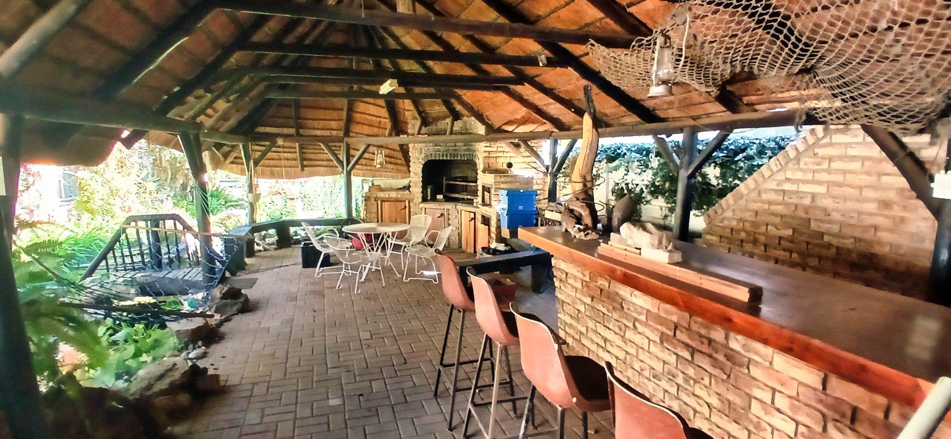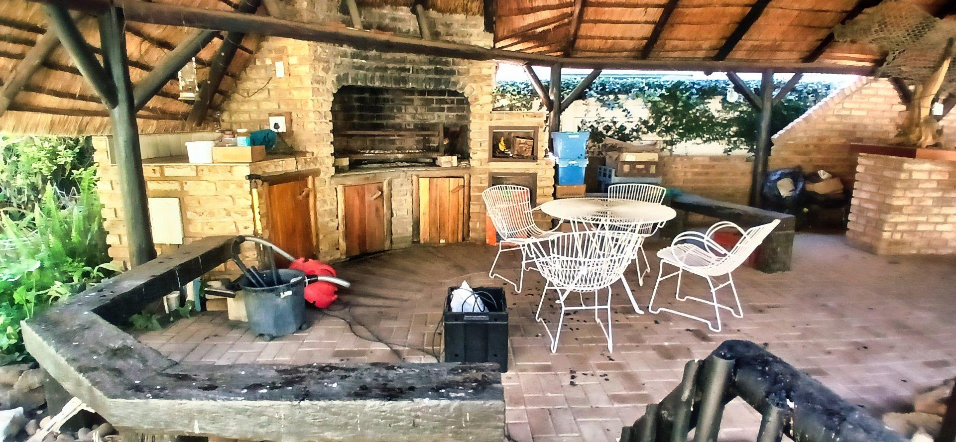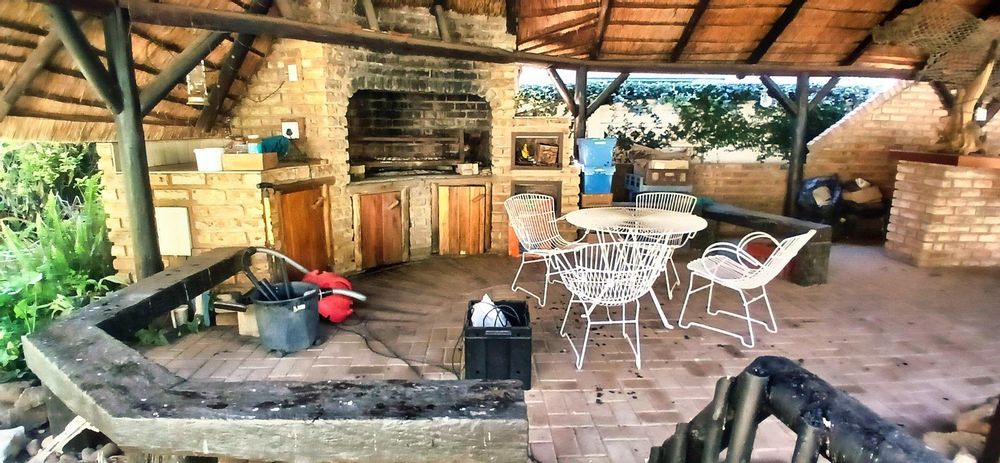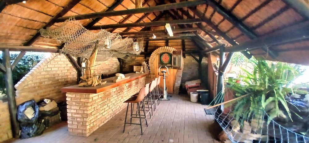Outdoors, the property shines with entertainment and lifestyle appeal—boasting a large lapa with a built-in braai, a sparkling swimming pool, and a beautifully maintained garden supported by a borehole and irrigation system. Additional features include a double garage, double carport, workshop, remote access gate, electric fencing, and outdoor beams for peace of mind.