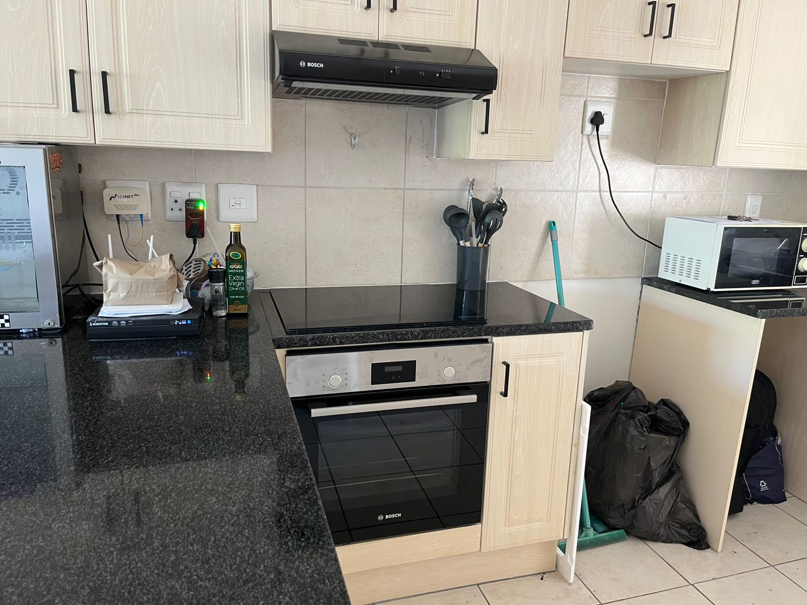 -Kitchen with light oak veneer cupboards with black granite tops – Brand new Bosch oven with 4 plate induction hob – space for fridge / freezer and one water appliance (washing machine or dishwasher). Tiled flooring