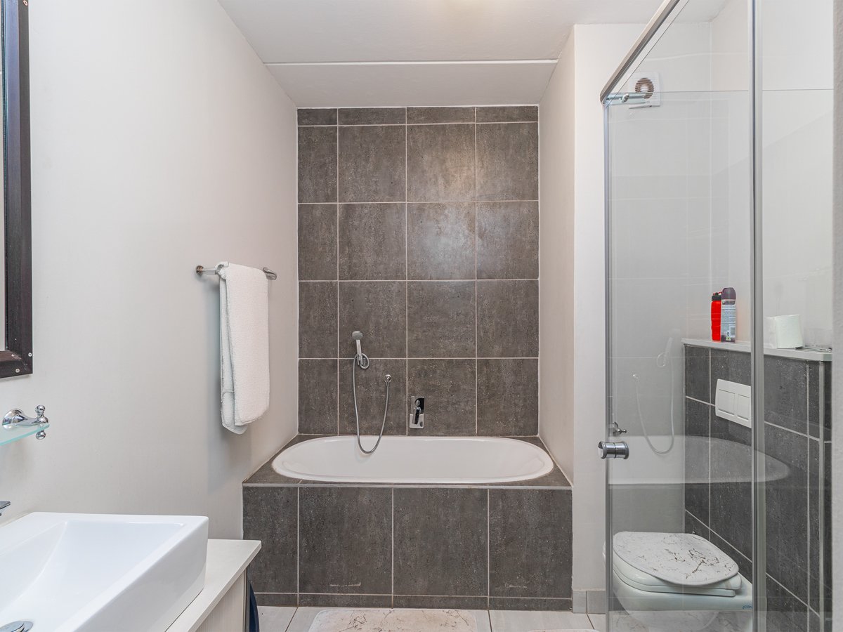 The spacious main bedroom features ample cupboard space and a full ensuite bathroom for ultimate comfort. The second bedroom is well-sized and serviced by a modern bathroom fitted with a shower.