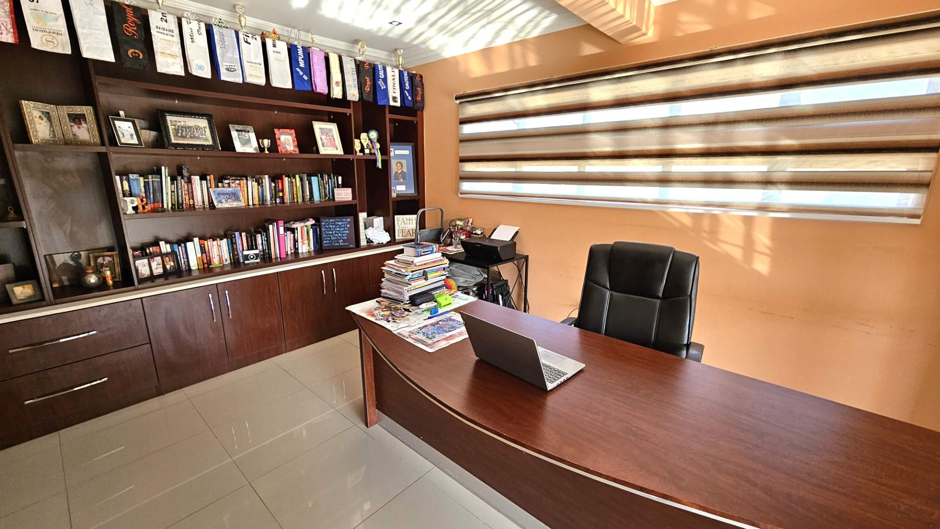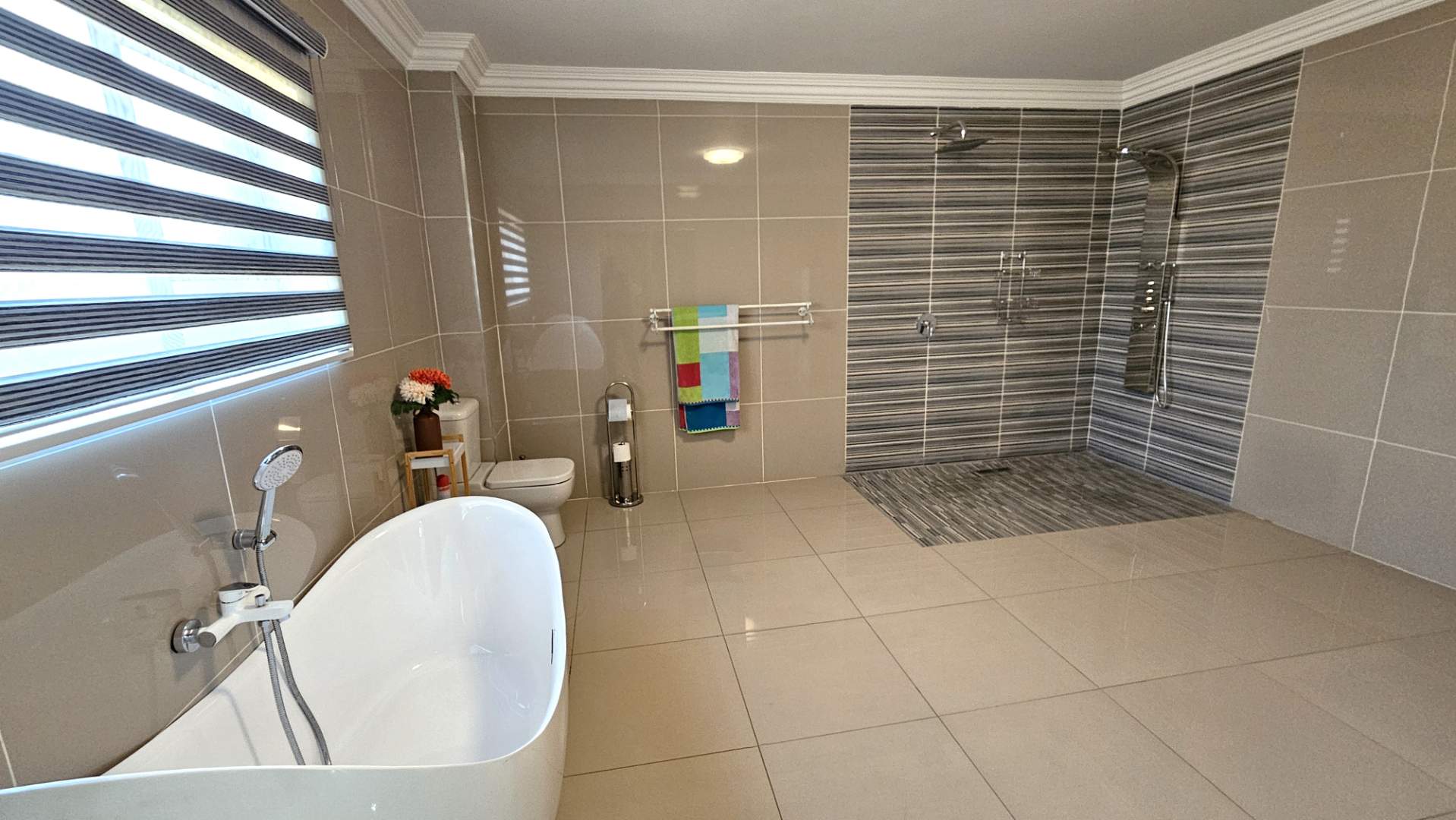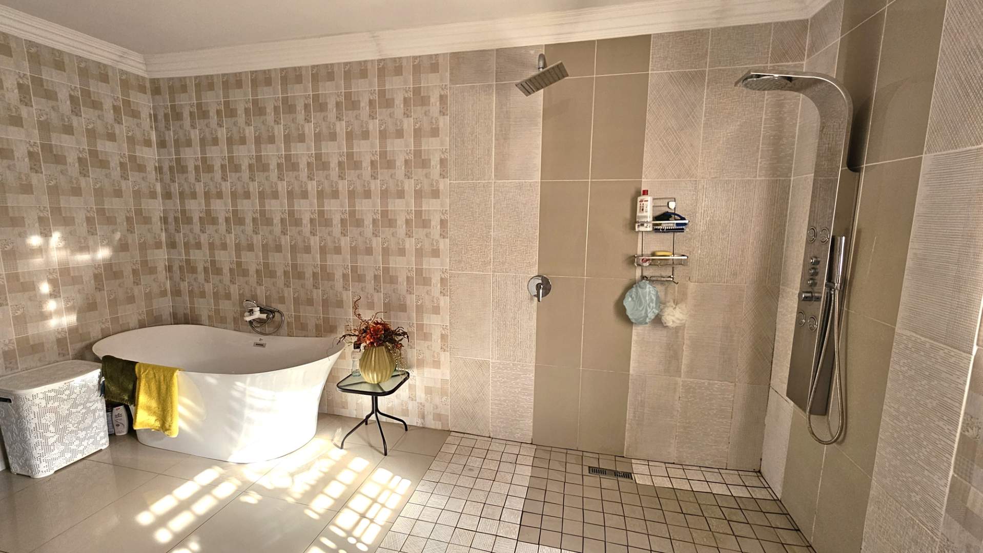 Main bedroom with walk in dressing room, exquisite full bathroom, sliding door leading to the outside, 2 bedrooms and full bathrooms on the ground floor. Leading upstairs with a grandeur stairwell with crystal chandeliers into a 2nd lounge with cozy fire place, fully fitted study with balcony, kitchenette to serve late night coffees. 3 spacious bedrooms, 2 with full en suite bathrooms, and walk in dressing rooms and balconies, 1 bedroom with shower basin and toilet. All the windows and doors leading to the outside are fitted with trellis security gates.