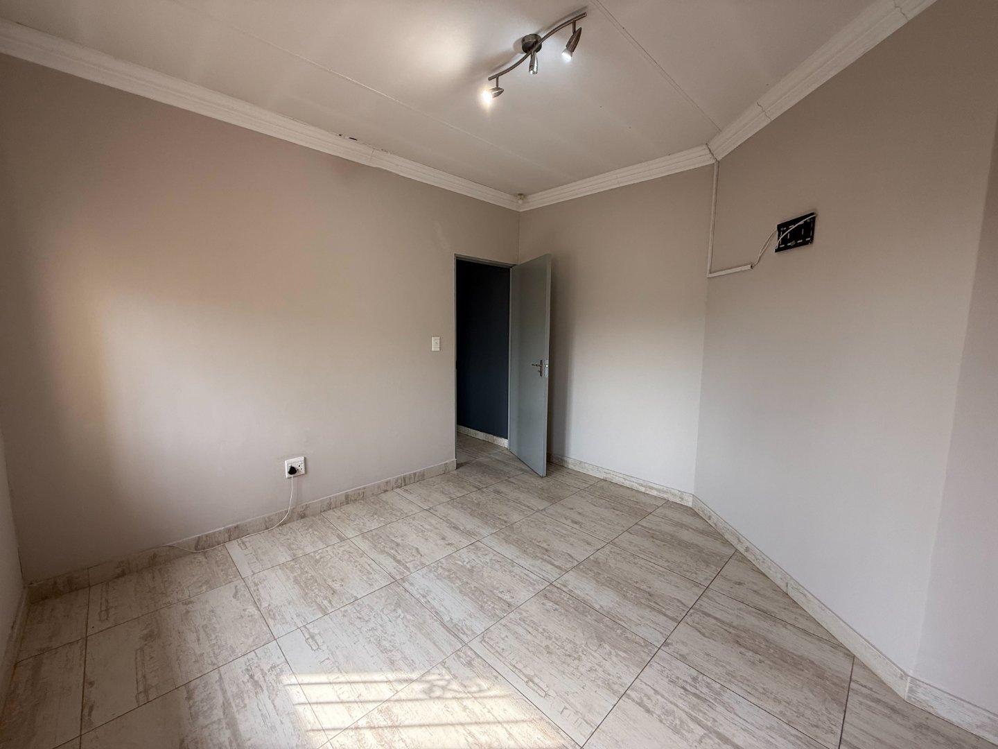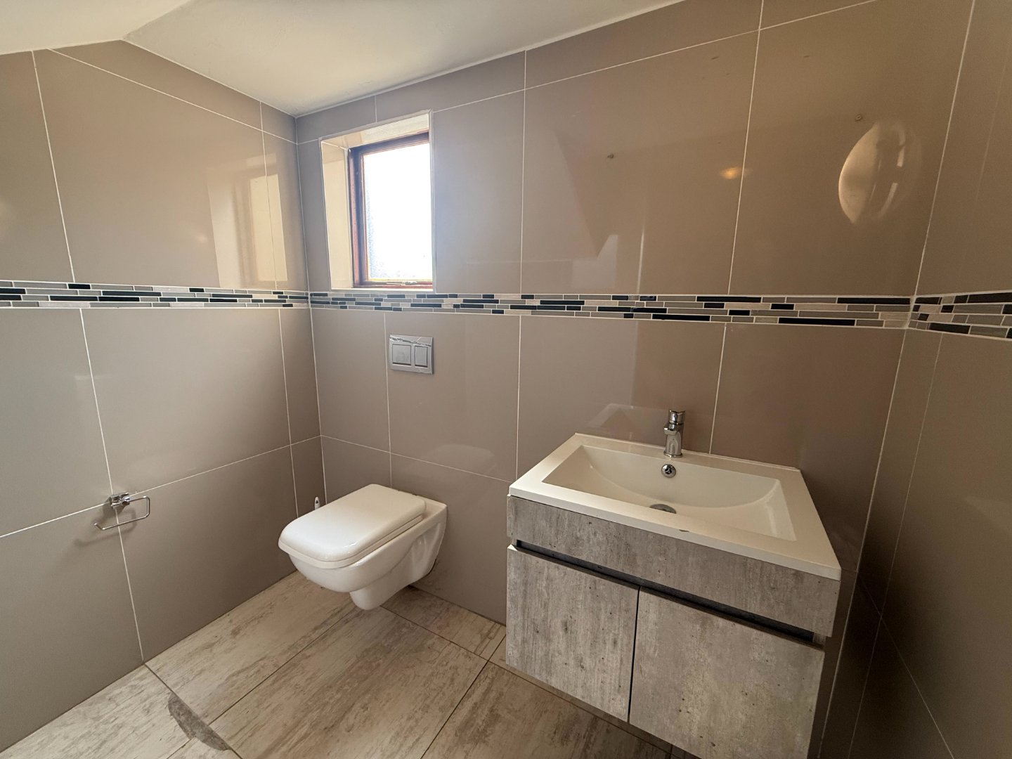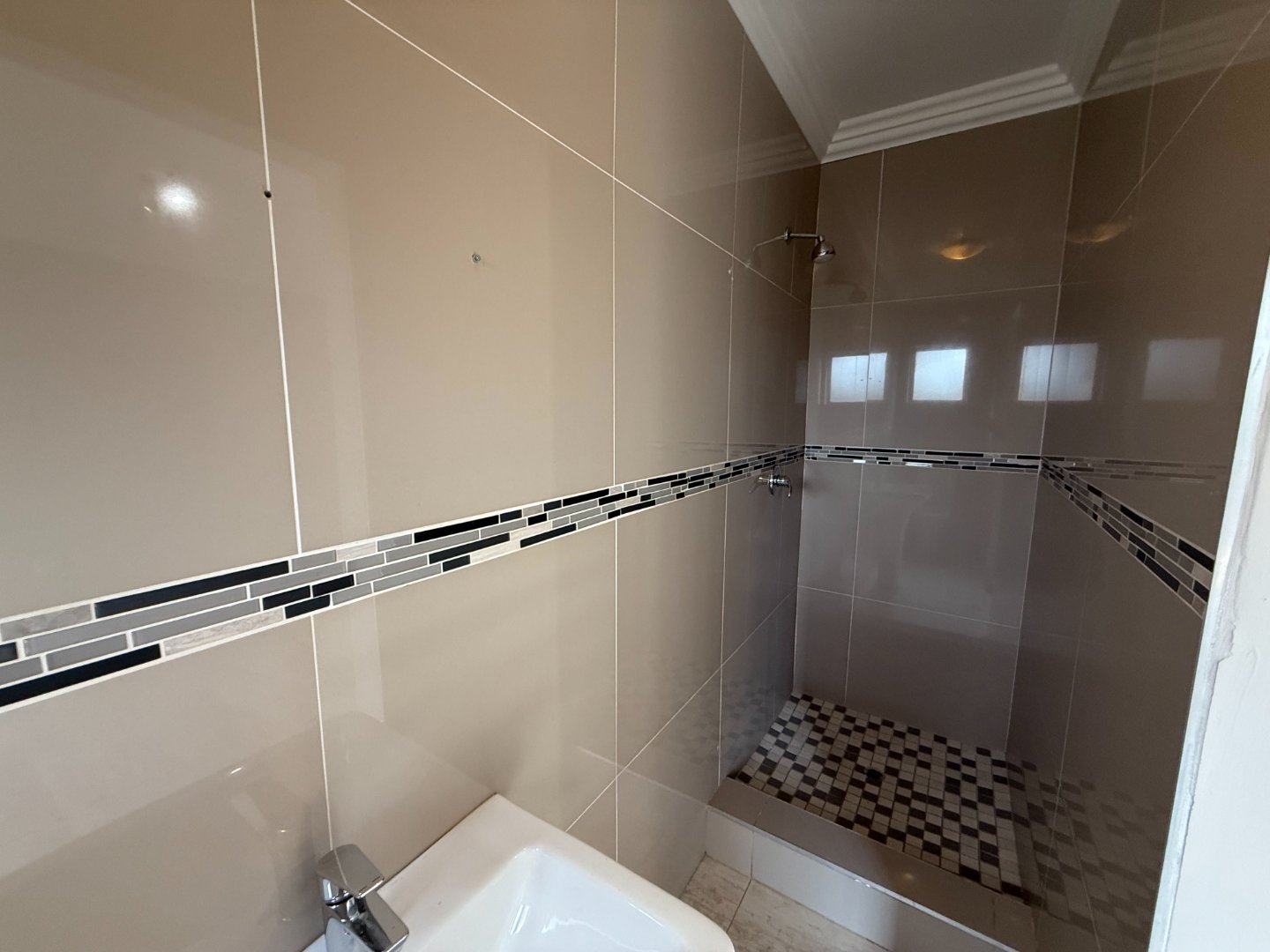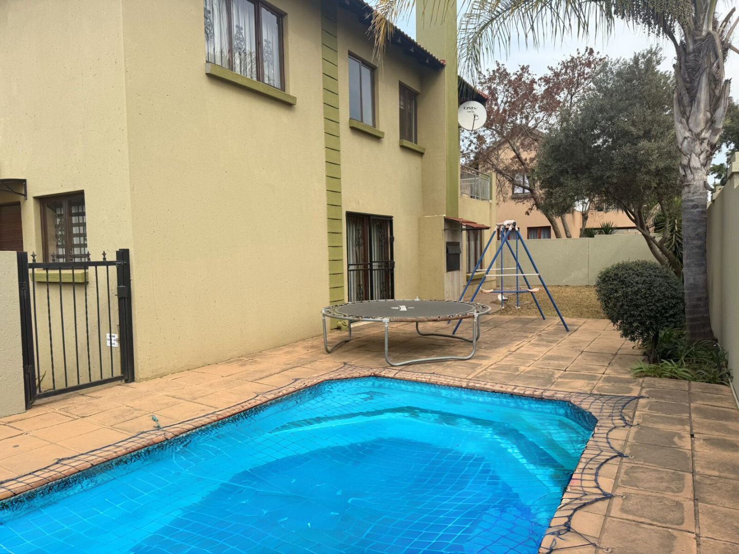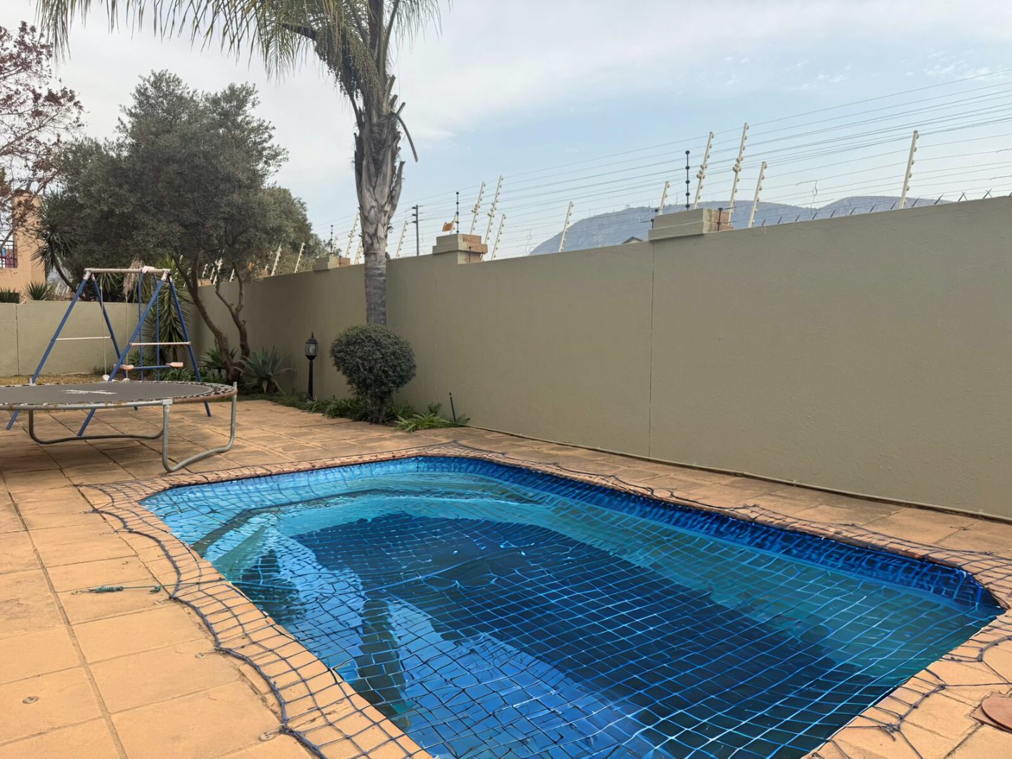 The ground floor also offers a well-sized bedroom with its own bathroom (shower, basin, and toilet). From the entertainment area, glass doors lead you out to a sparkling blue pool and a small, easy-to-maintain erf, perfect for relaxed outdoor living.