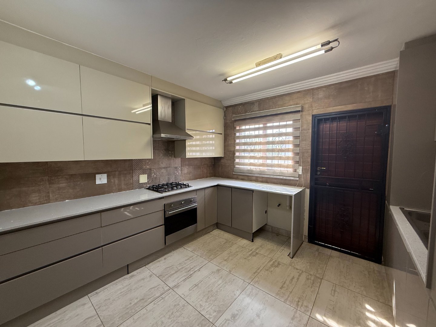 As you enter the front door, a convenient guest bathroom is located to your right. The home then opens up into a spacious open-plan living area, featuring a dining room, entertainment room, living room, and a stylish modern kitchen—ideal for family living and entertaining.