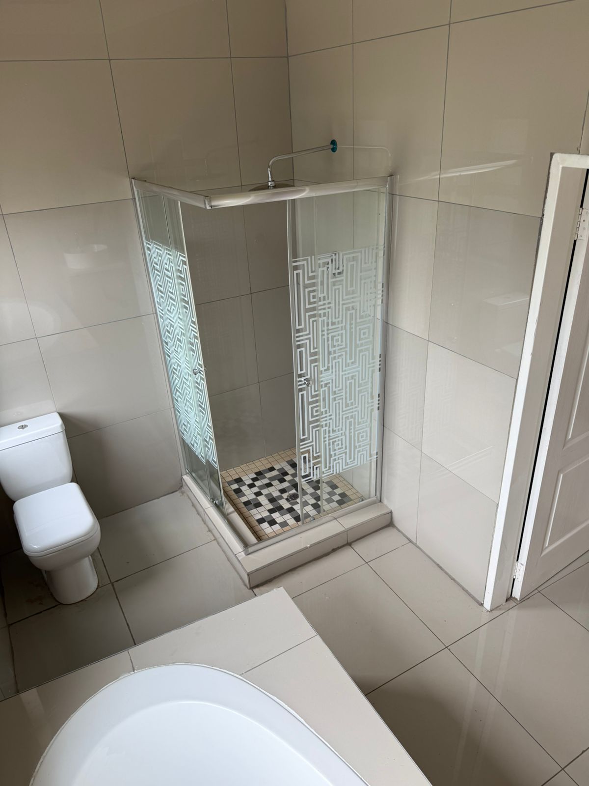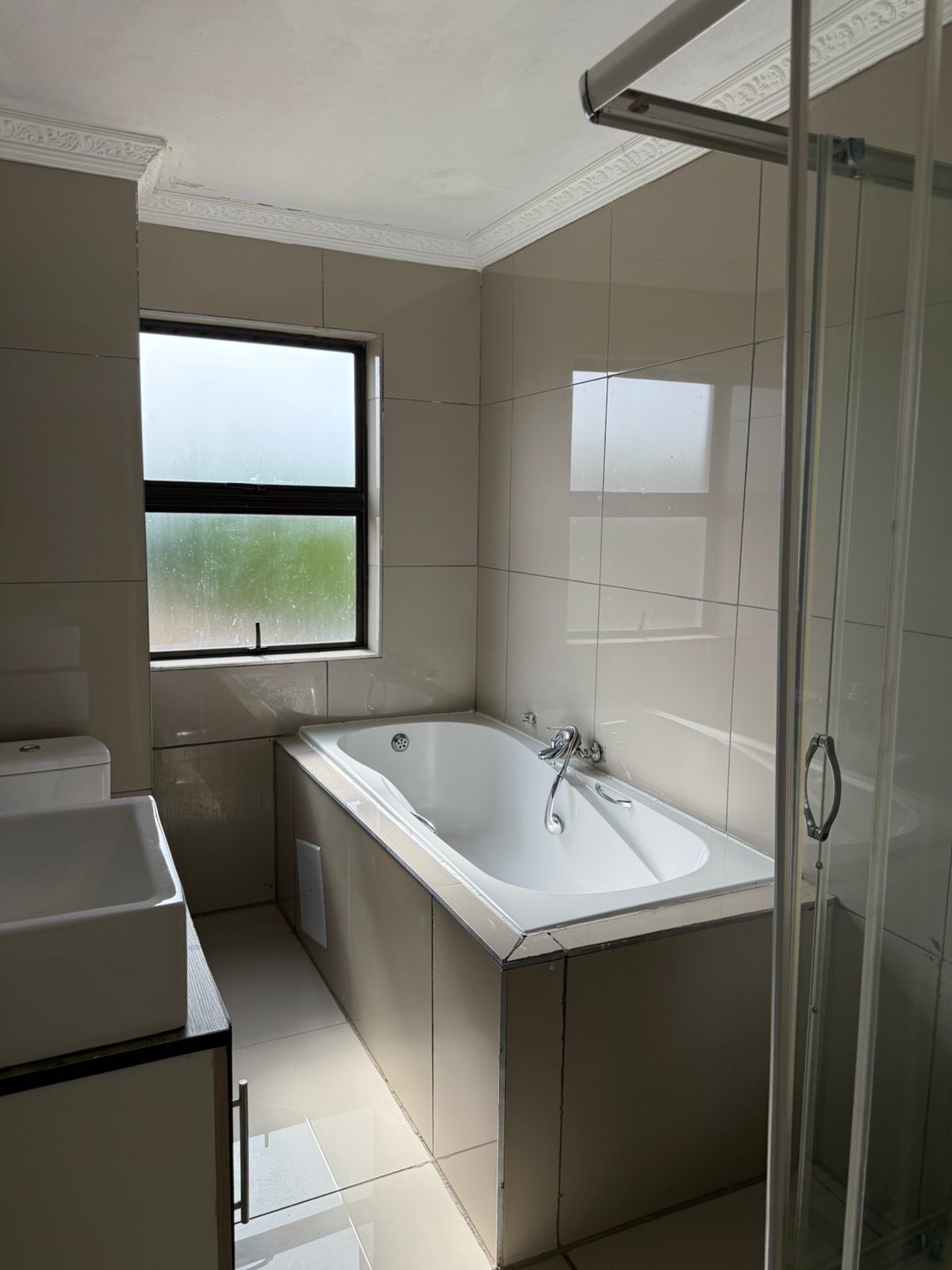 The open-plan kitchen is well-appointed with an electric stove and extractor fan, ample cupboard space, and a separate scullery for added convenience and functionality.