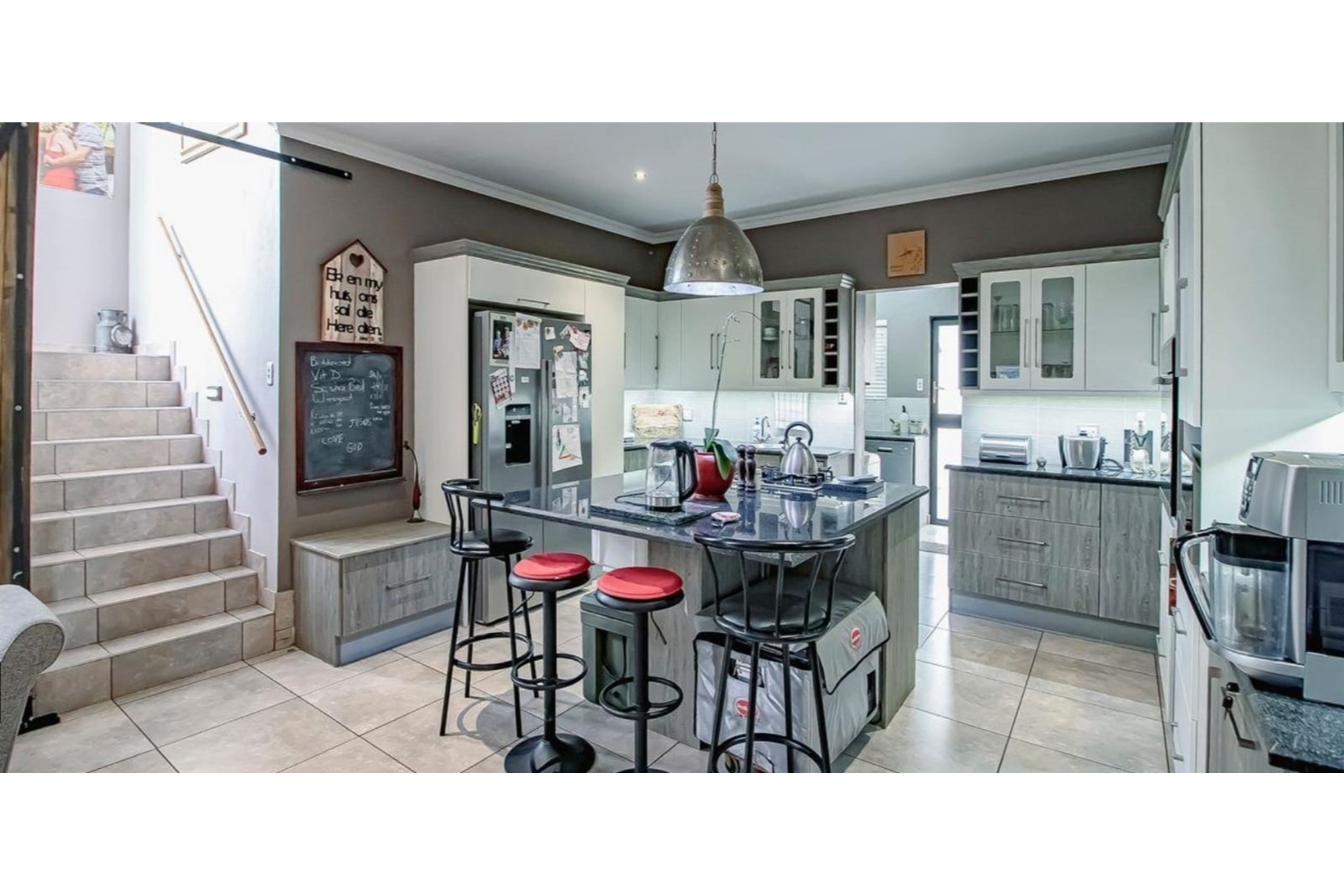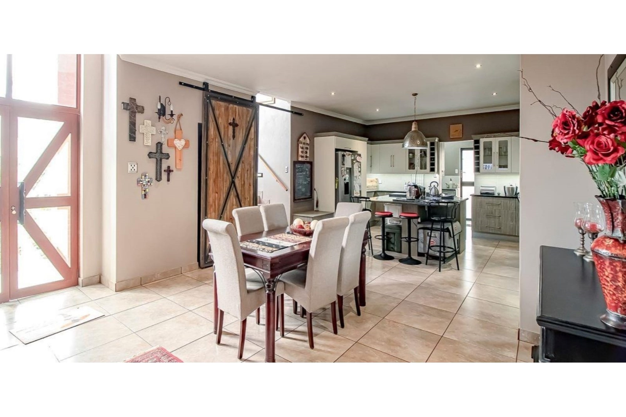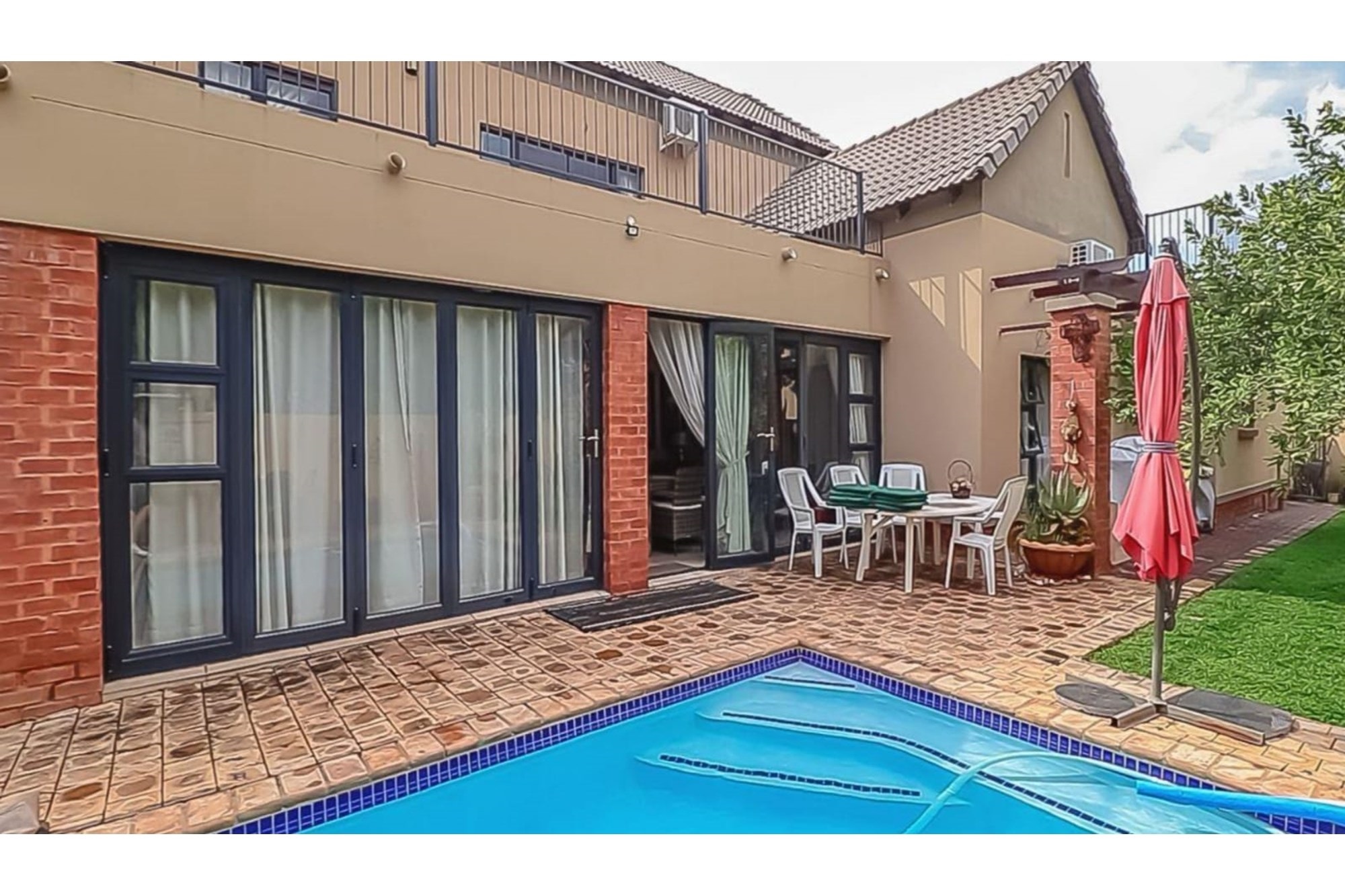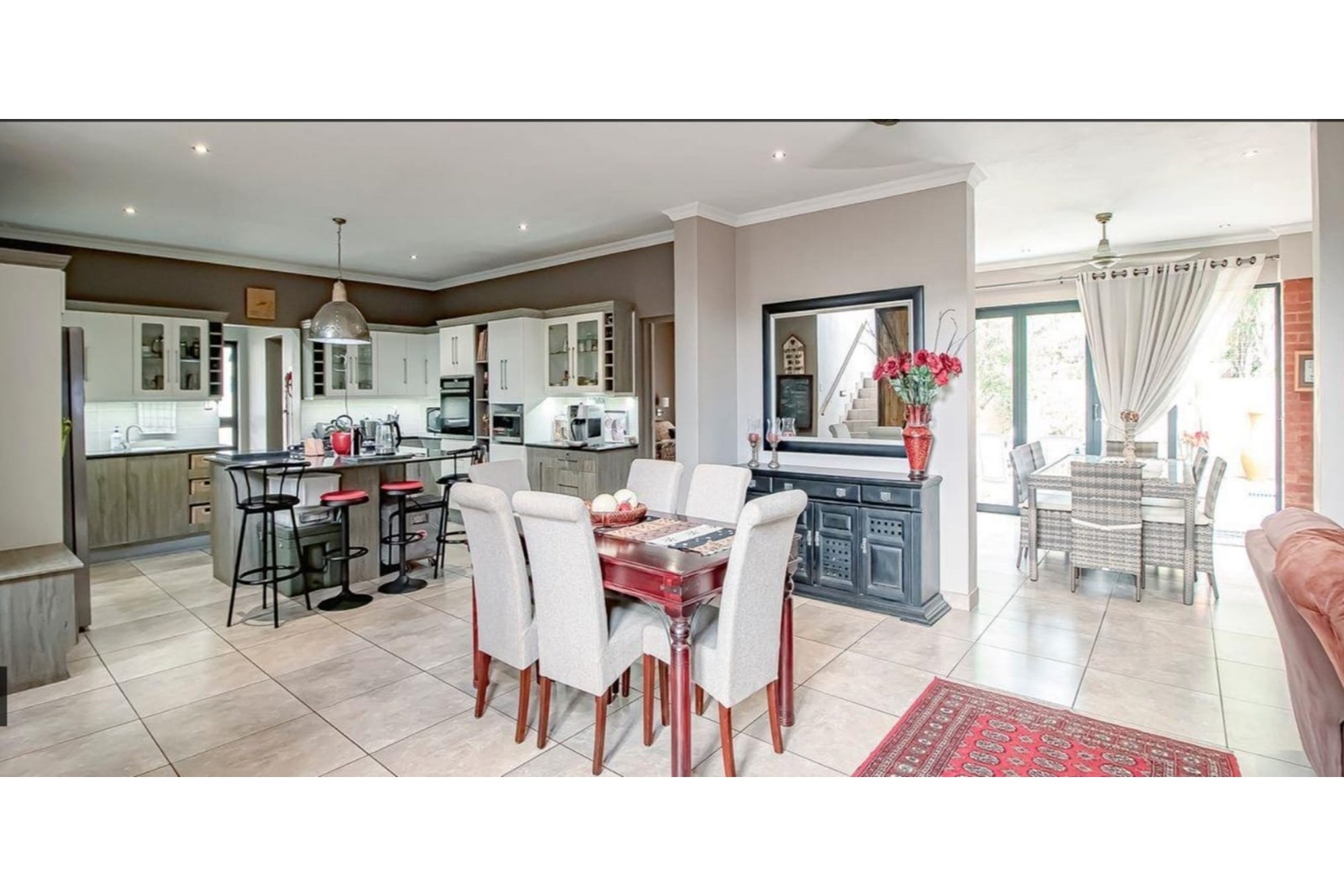 This beautifully designed home offers an open-plan layout on the ground floor, perfect for family living and entertaining. The space includes a welcoming family room, a modern kitchen with a scullery, walk-in pantry, ample cupboard space, granite centre island, and a gas hob. The kitchen seamlessly flows into a stylish lounge and dining area, with an entertainment space featuring a built-in braai. Stacking doors open onto a lush, beautifully maintained garden and a sparkling swimming pool, creating the perfect indoor-outdoor lifestyle.