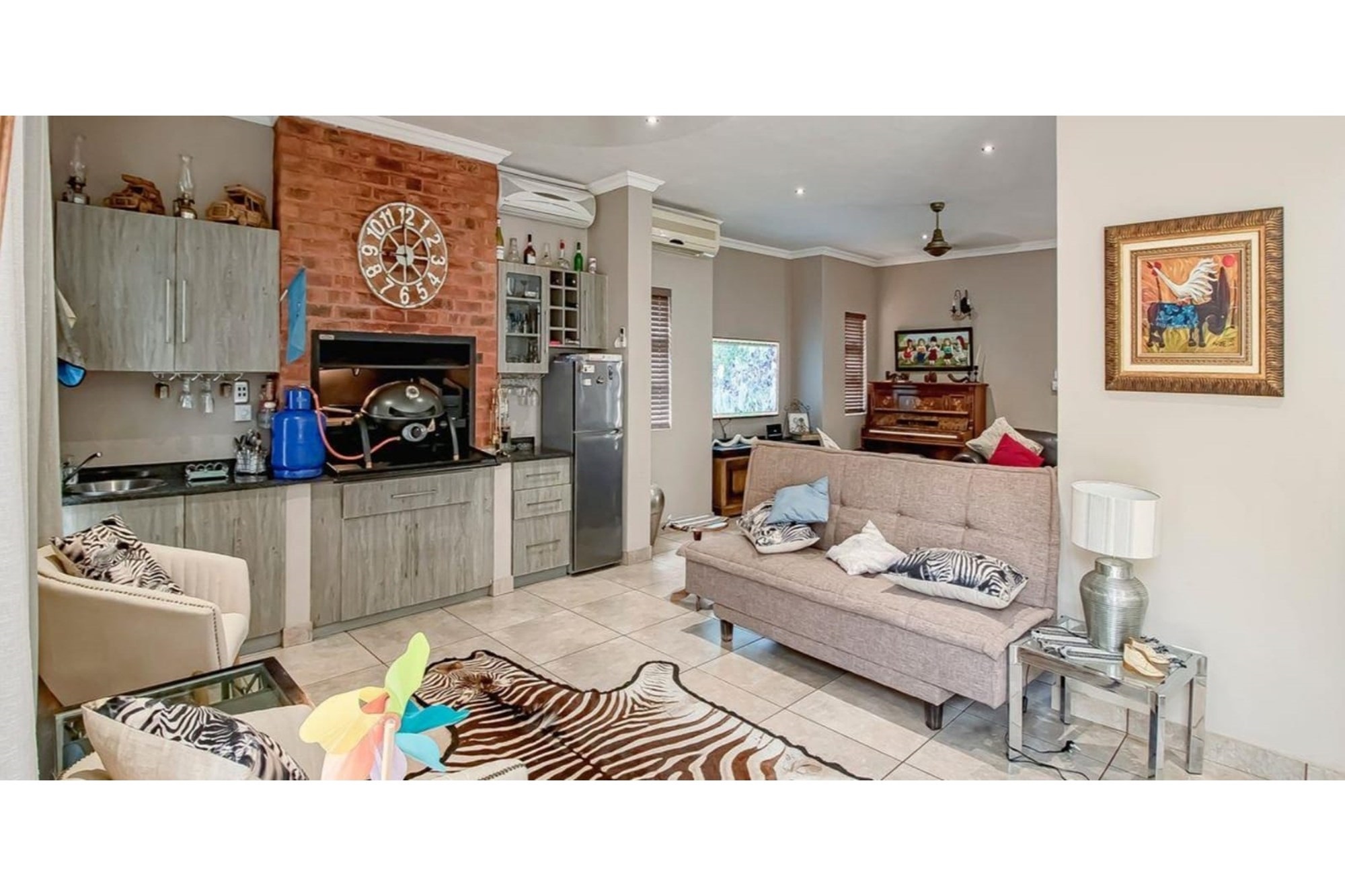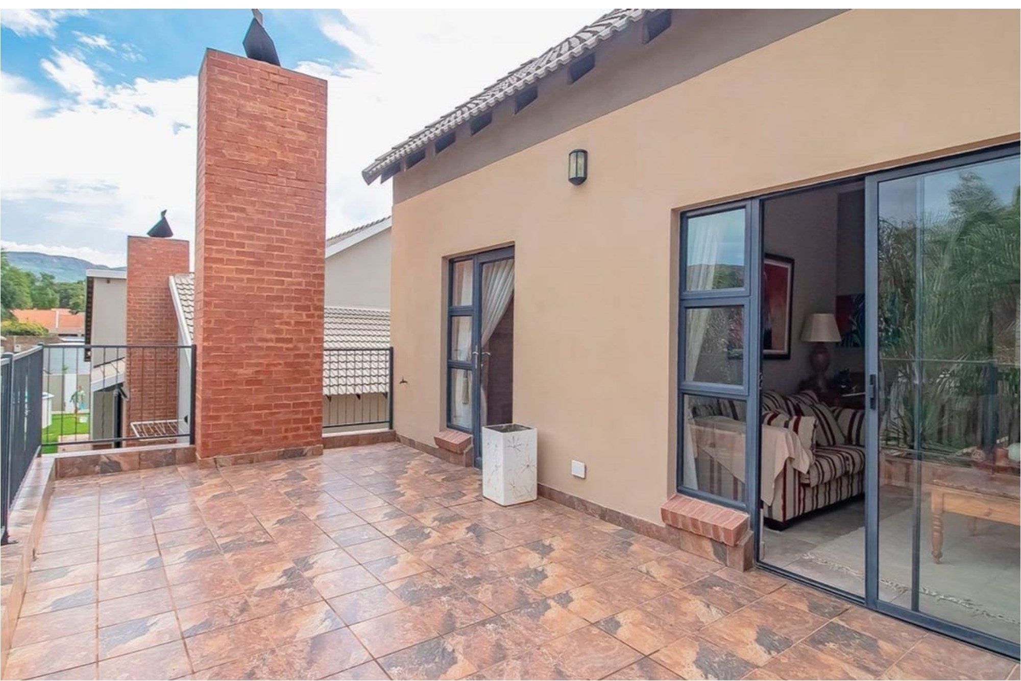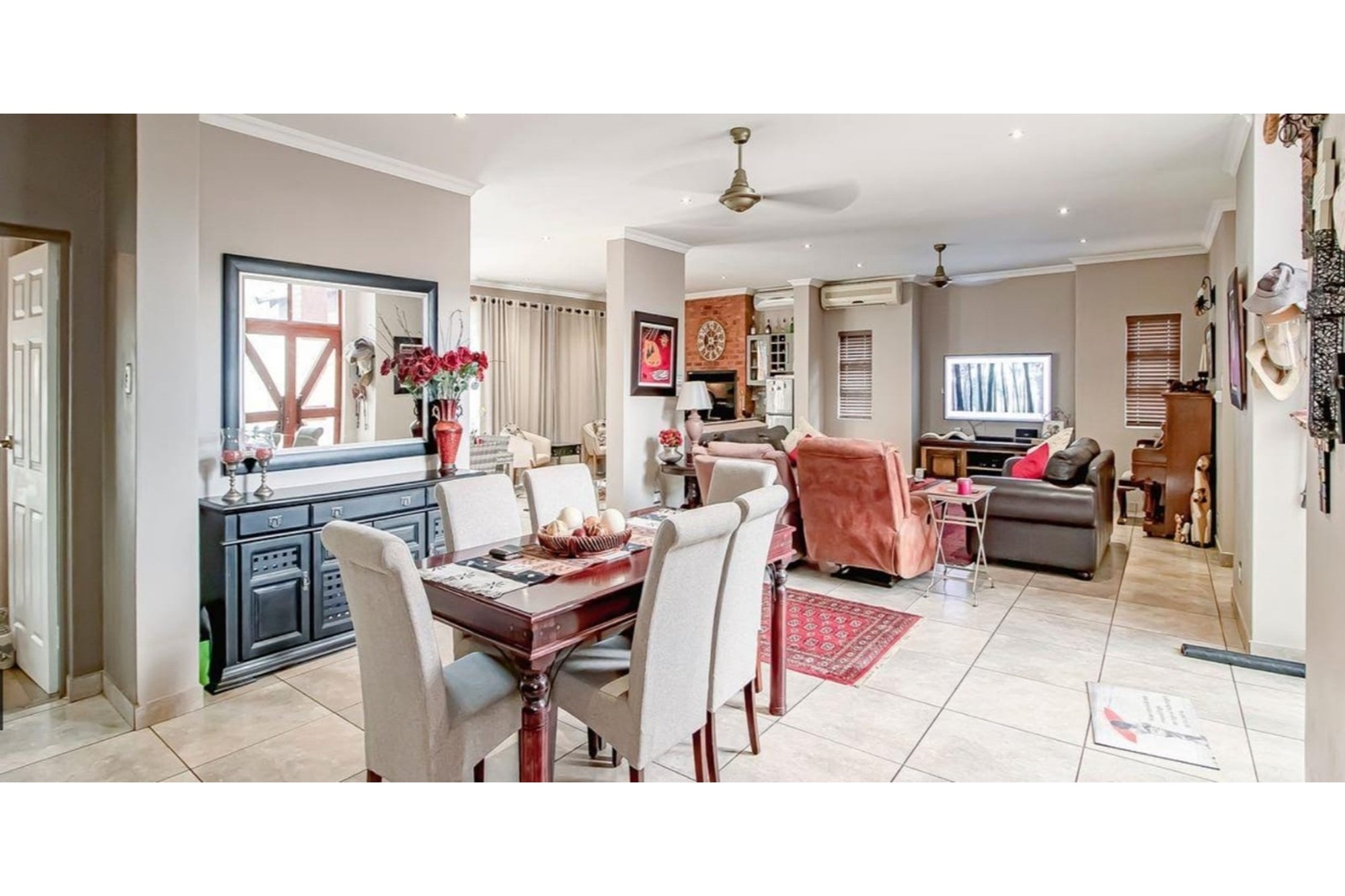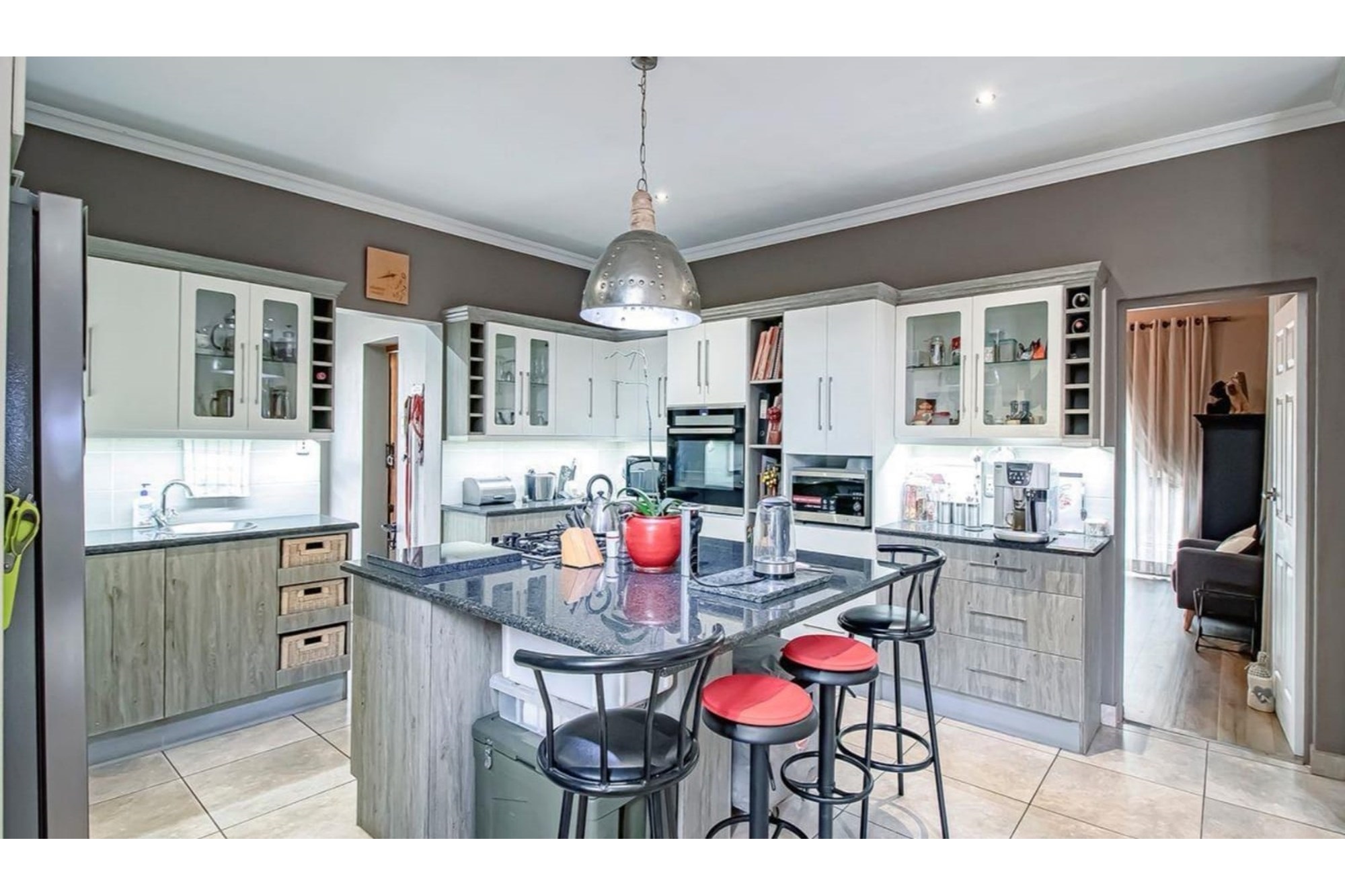 This beautifully designed home offers an open-plan layout on the ground floor, perfect for family living and entertaining. The space includes a welcoming family room, a modern kitchen with a scullery, walk-in pantry, ample cupboard space, granite centre island, and a gas hob. The kitchen seamlessly flows into a stylish lounge and dining area, with an entertainment space featuring a built-in braai. Stacking doors open onto a lush, beautifully maintained garden and a sparkling swimming pool, creating the perfect indoor-outdoor lifestyle.