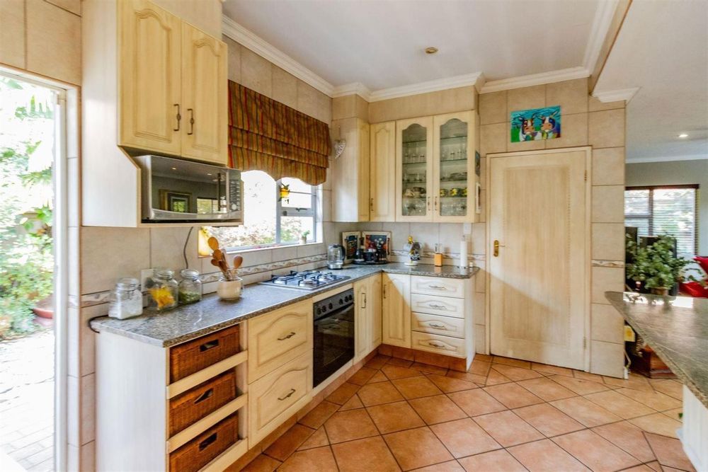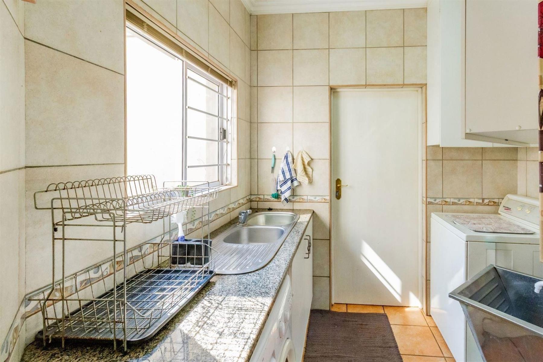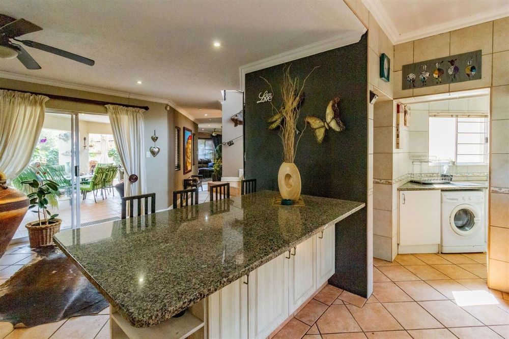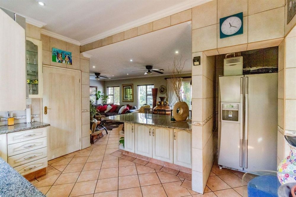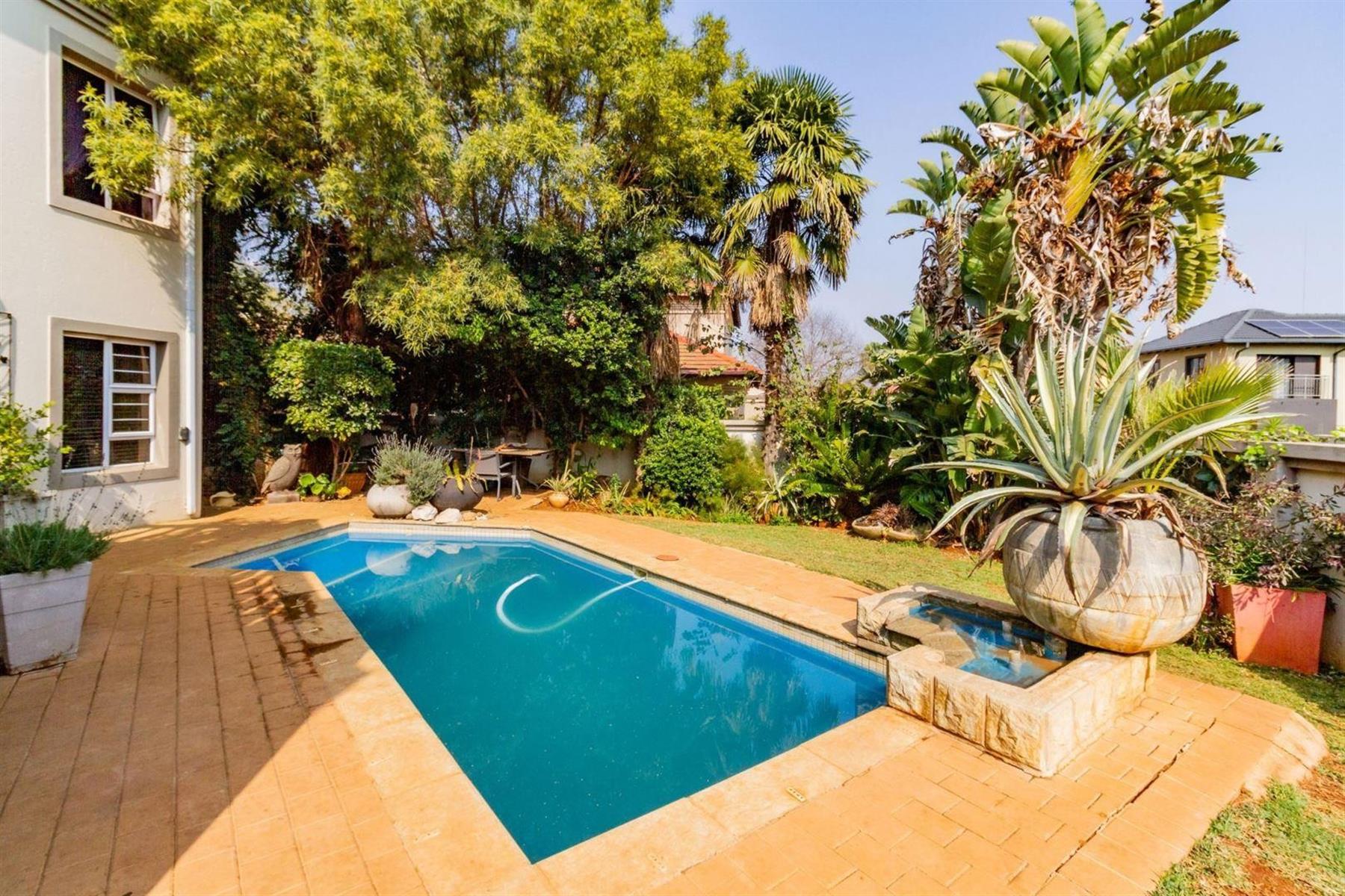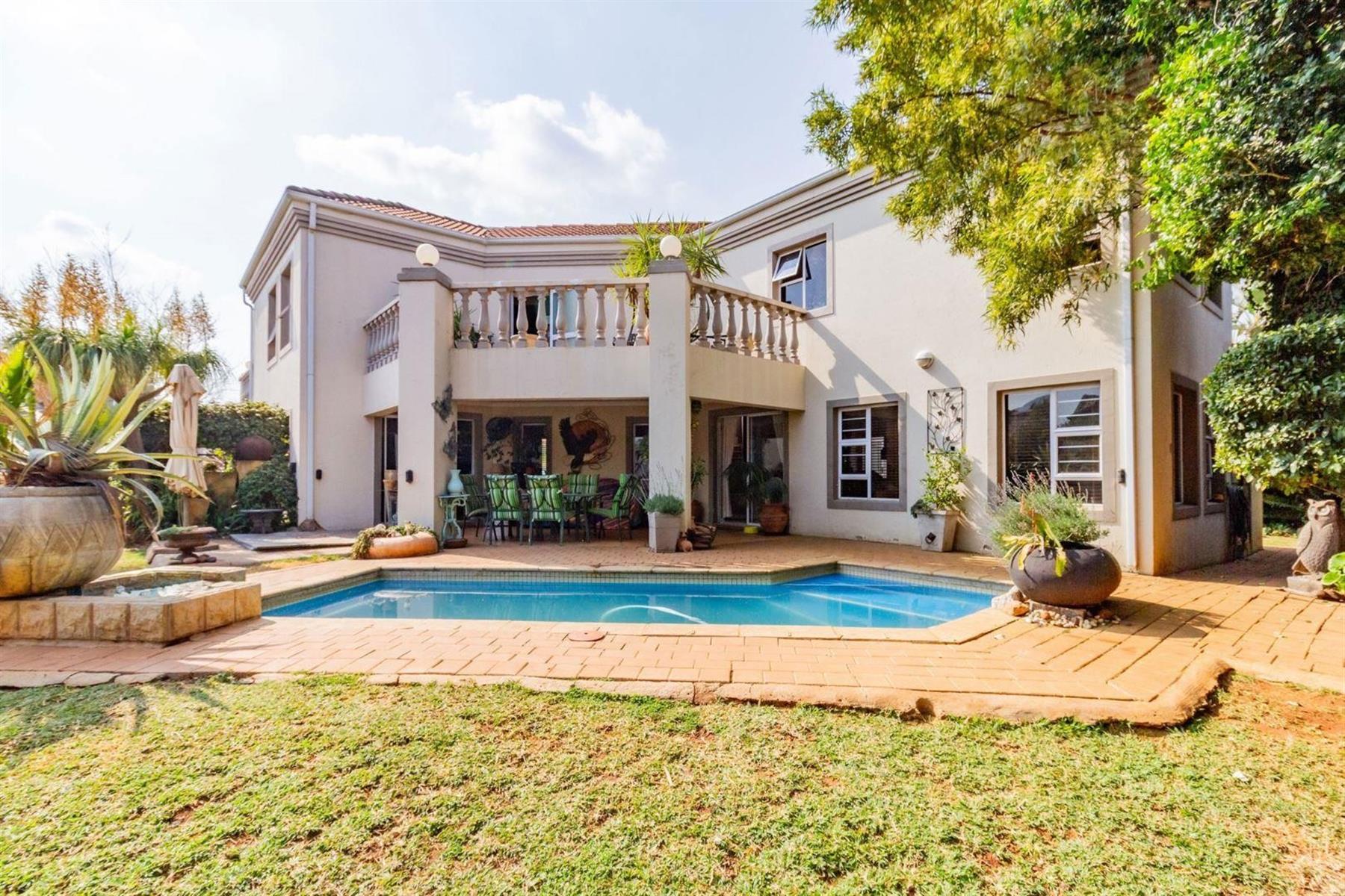 The kitchen is thoughtfully appointed with a gas hob, designated fridge space, walk-in pantry, and a laundry area designed for a top-loader washing machine. A separate staff room with its own exterior access enhances the home’s functionality. The patio, overlooking a lush landscaped garden and shimmering swimming pool, offers an inviting setting for serene outdoor living.