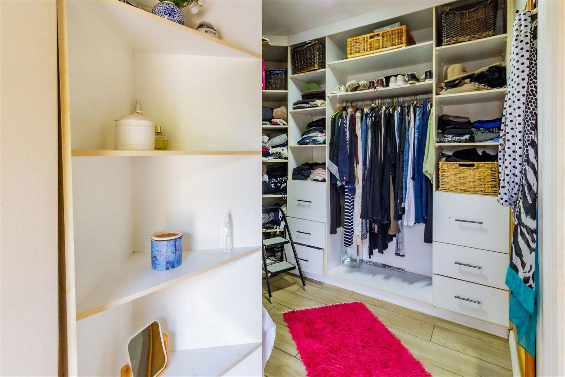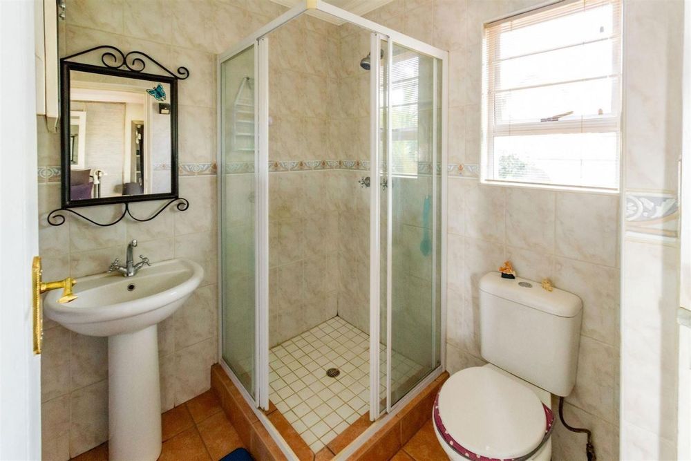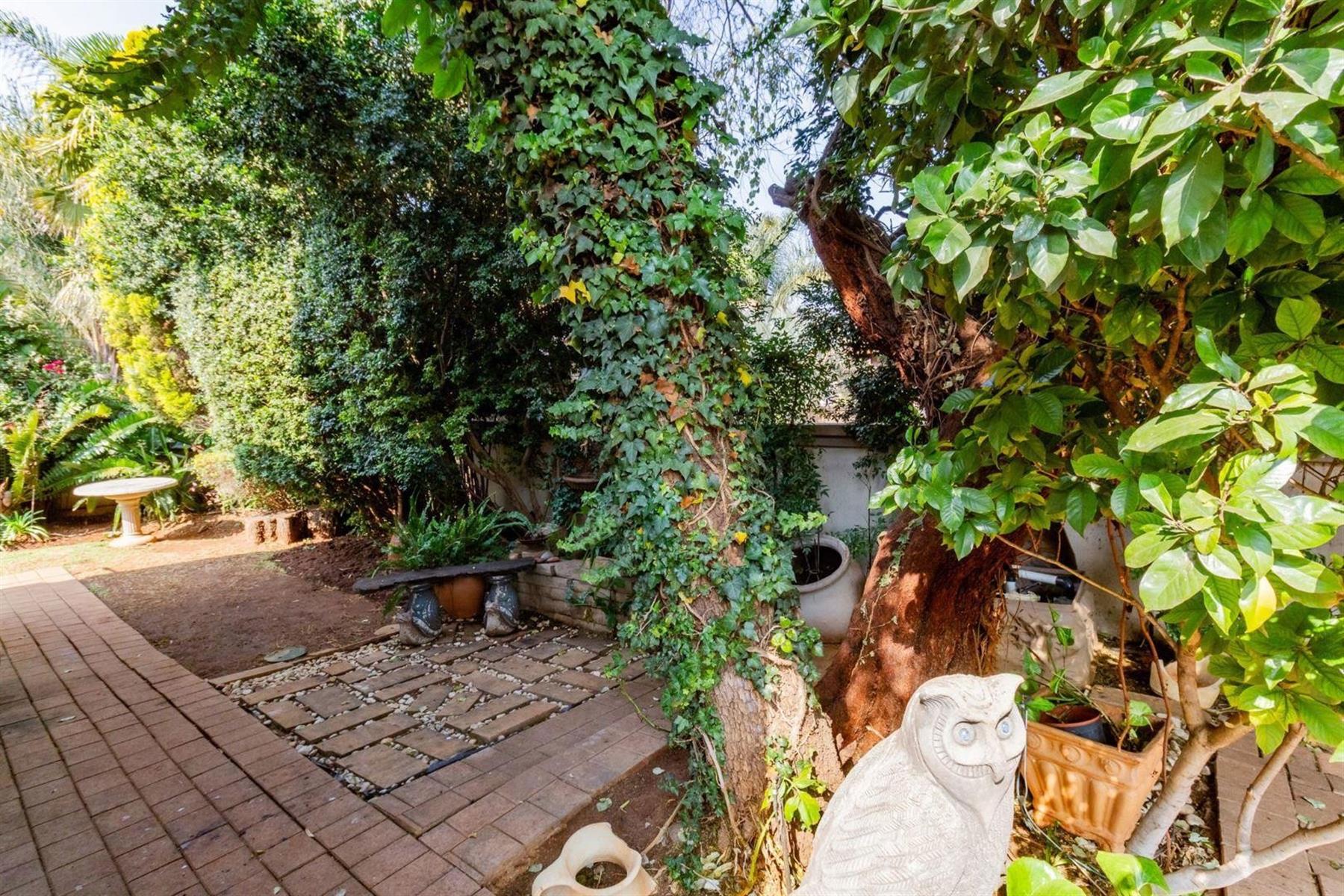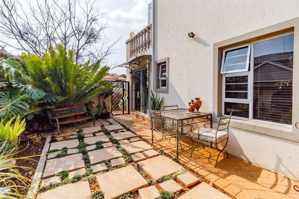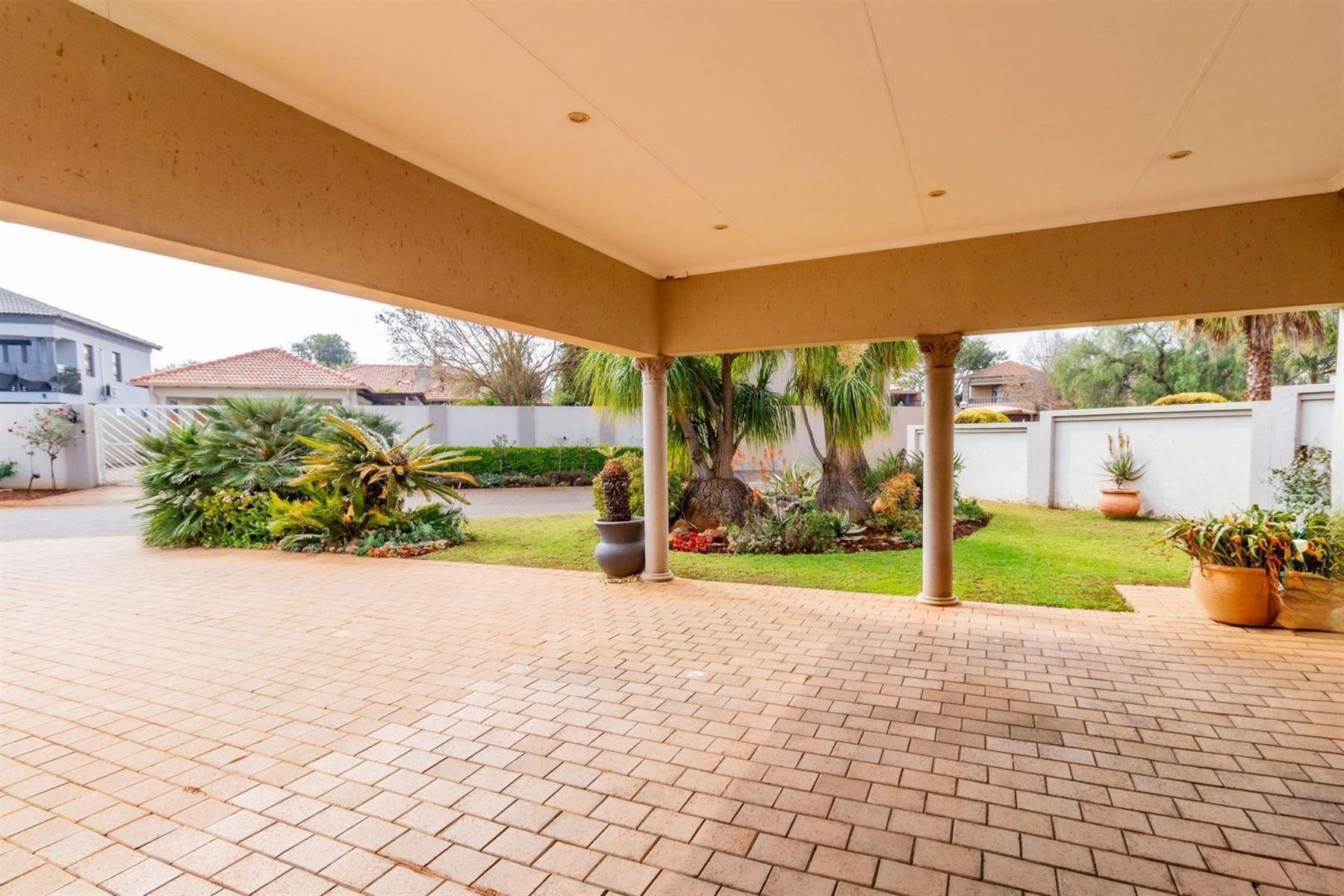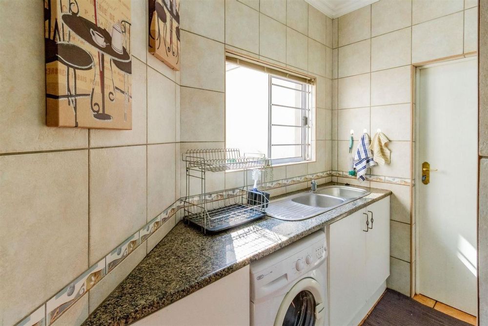 The kitchen is thoughtfully appointed with a gas hob, designated fridge space, walk-in pantry, and a laundry area designed for a top-loader washing machine. A separate staff room with its own exterior access enhances the home’s functionality. The patio, overlooking a lush landscaped garden and shimmering swimming pool, offers an inviting setting for serene outdoor living.