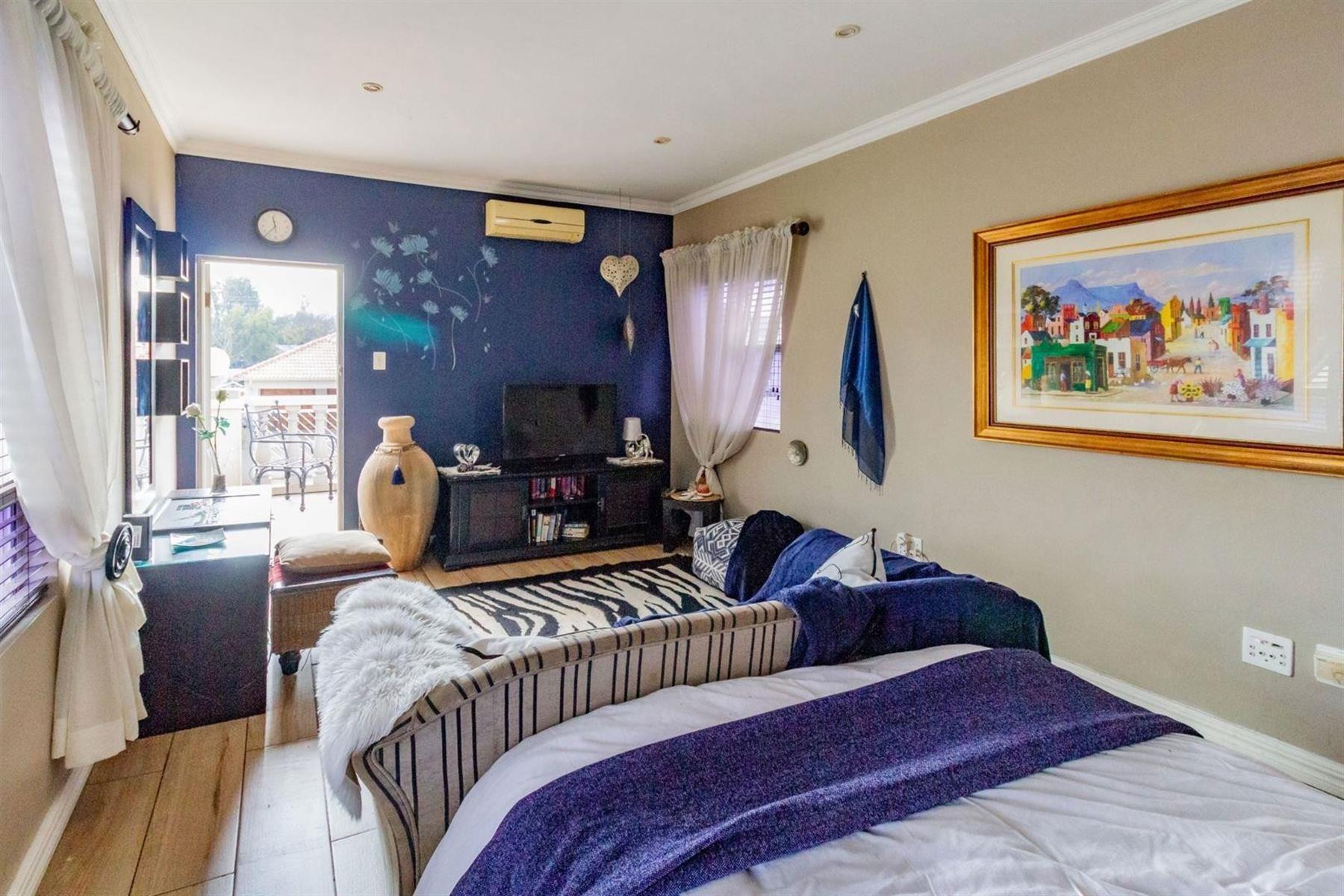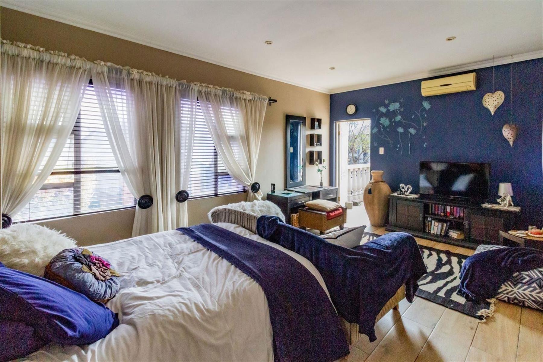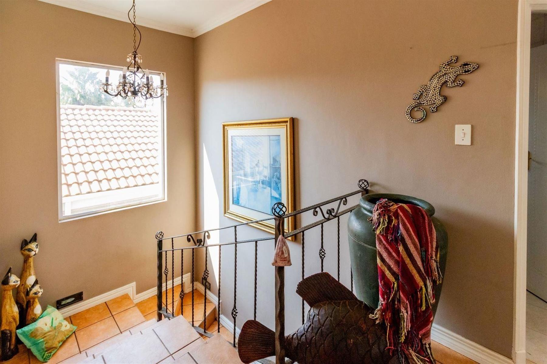 Upstairs, the home opens onto an expansive balcony with sweeping views of the Magaliesberg mountains and tranquil glimpses of the dam—an idyllic retreat for relaxation. The main bedroom serves as a luxurious sanctuary, boasting its own private balcony, ample space for a seating area, a walk-in wardrobe, and a full en-suite bathroom. Two additional bedrooms, each with built-in cupboards and plush carpeting, share a spacious full bathroom.