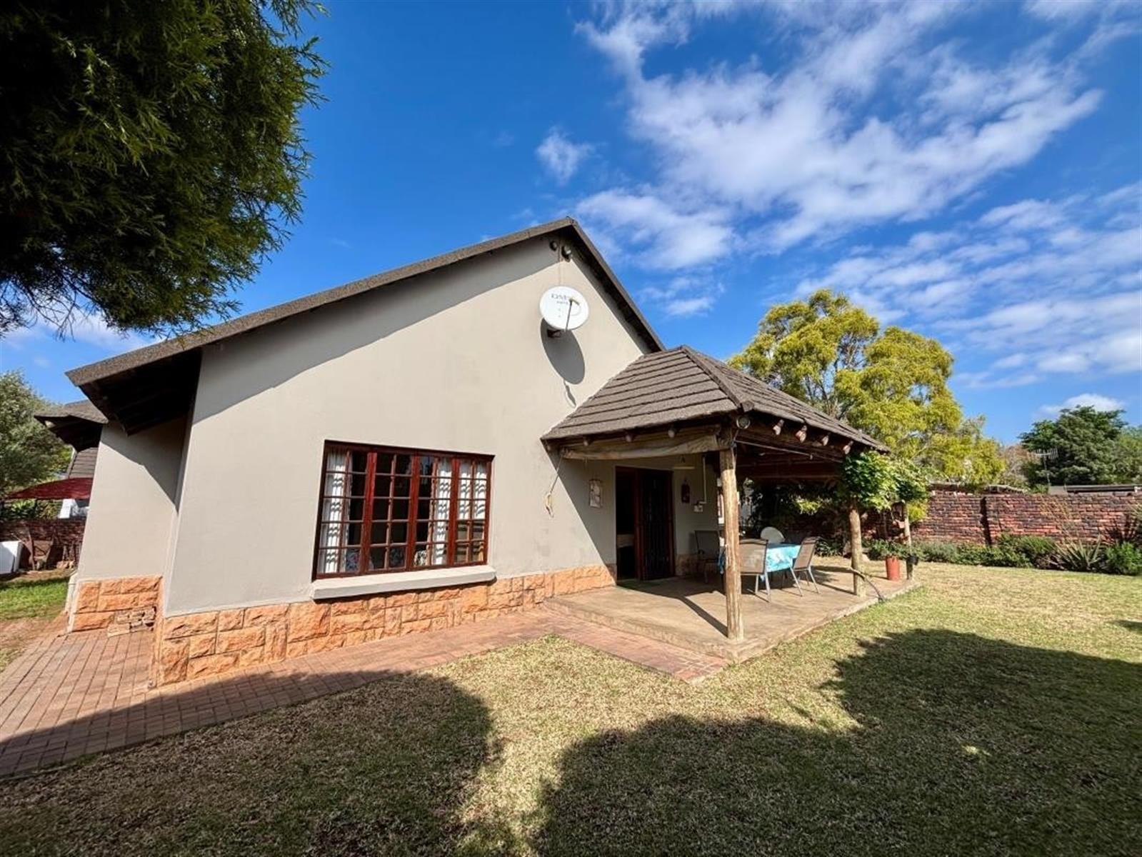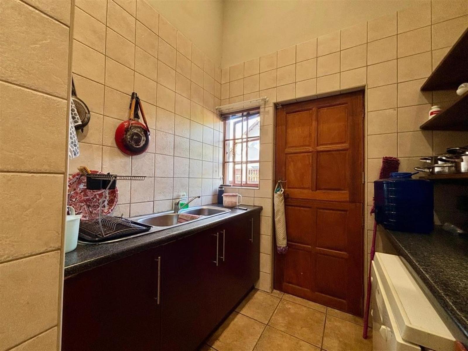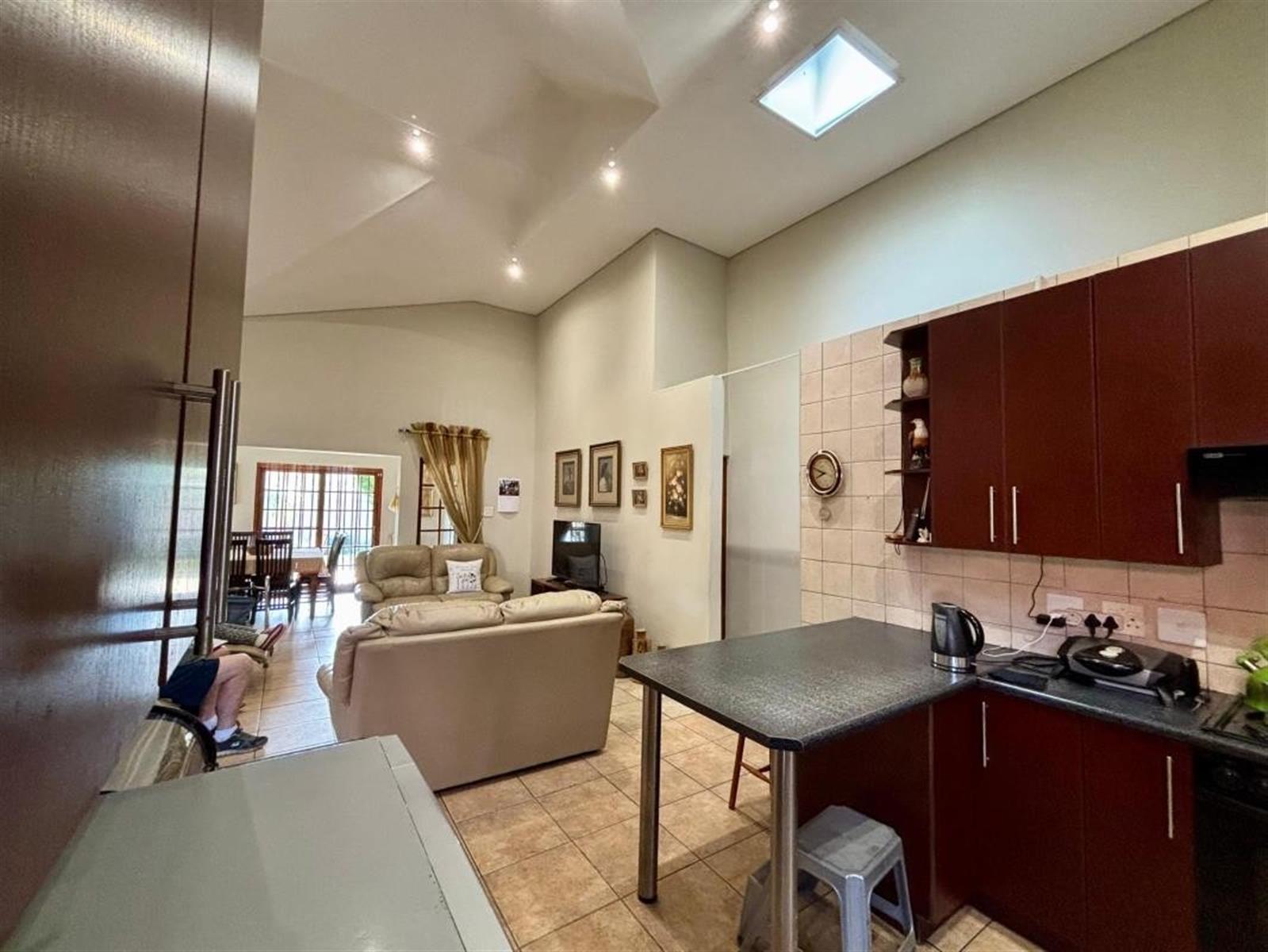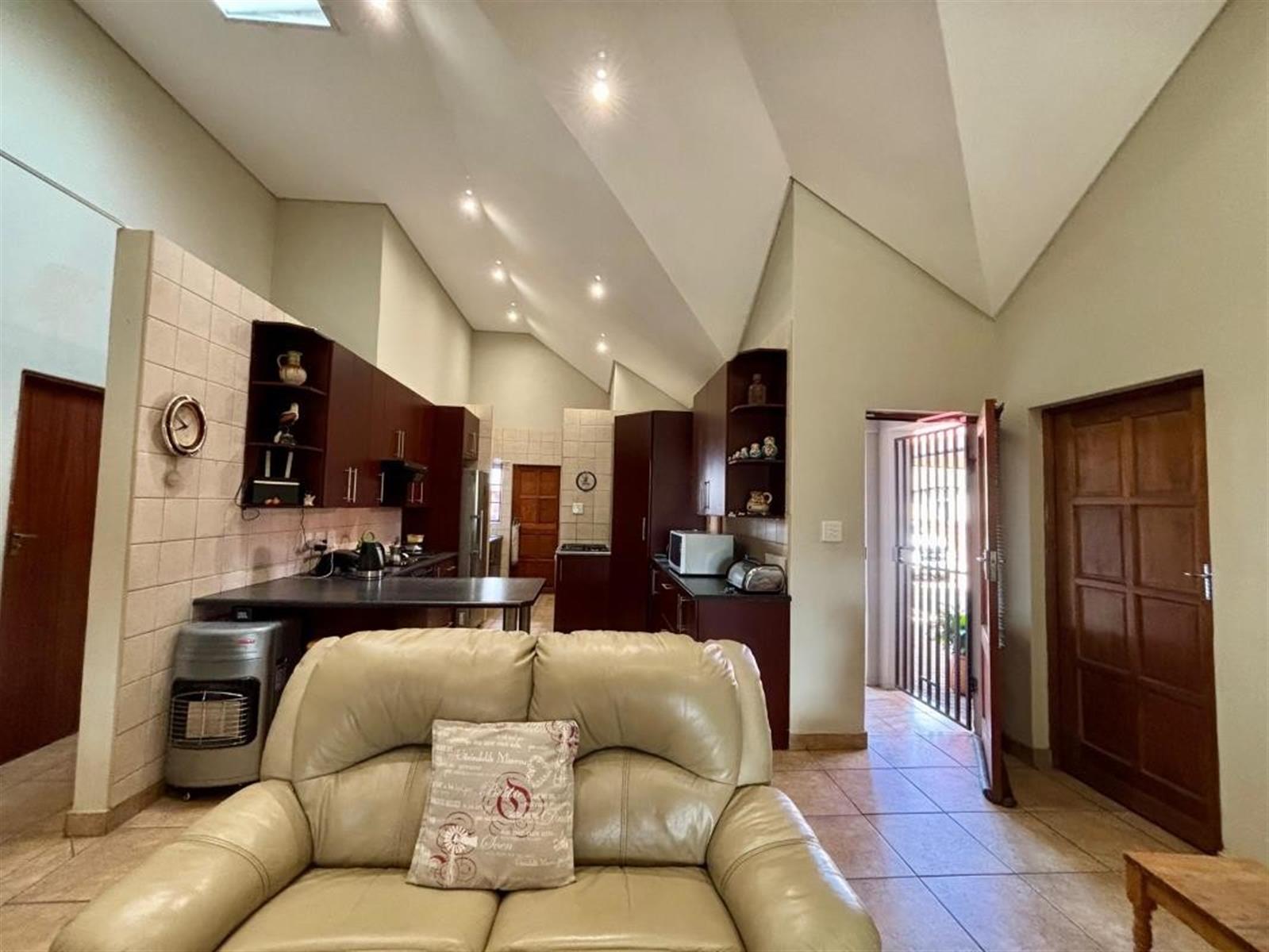 Inside, a generous open-plan design seamlessly connects the kitchen, dining, and living areas. The kitchen is both functional and stylish, boasting abundant cupboard space, a full undercounter oven, a hob, and an additional gas hob conveniently located near the pantry. A separate scullery allows for effortless access to the backyard. The air-conditioned living area opens through elegant French doors into a versatile dining zone or an enclosed, sunlit patio. This bright patio flows onto a thatch-covered stoop, leading to a private, pet-friendly garden complete with a built-in braai—perfect for relaxed outdoor gatherings.