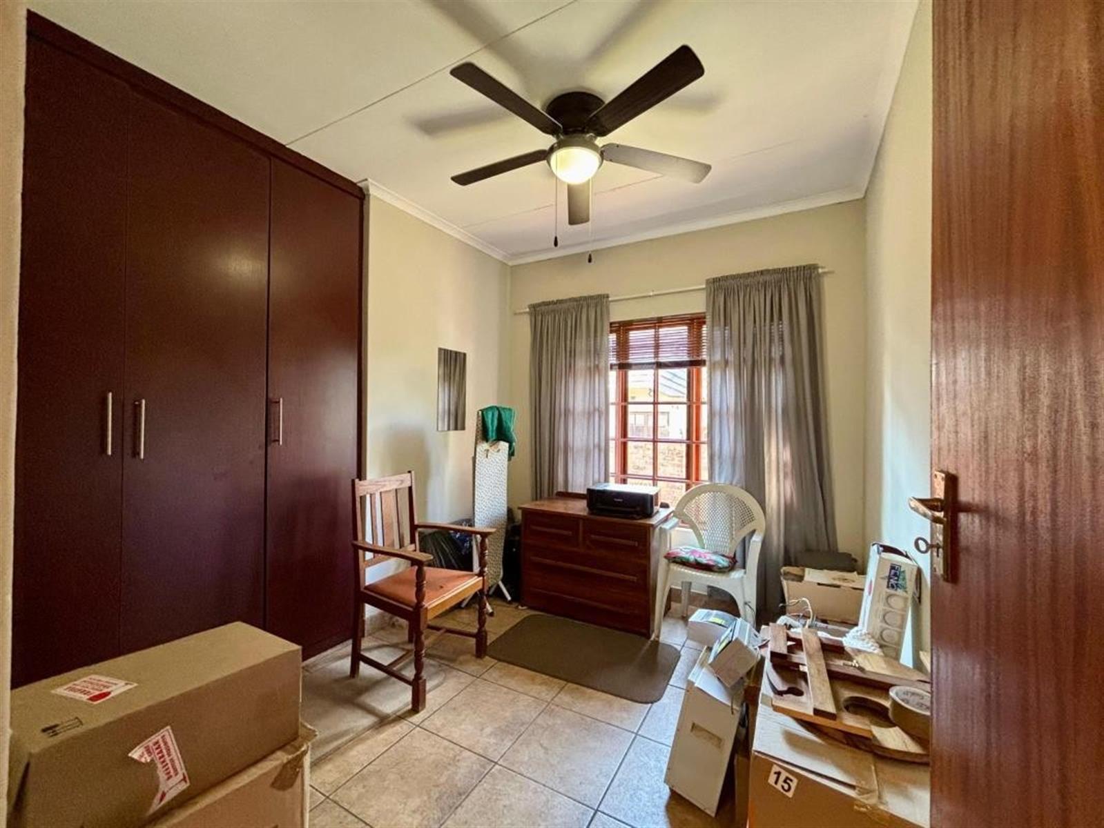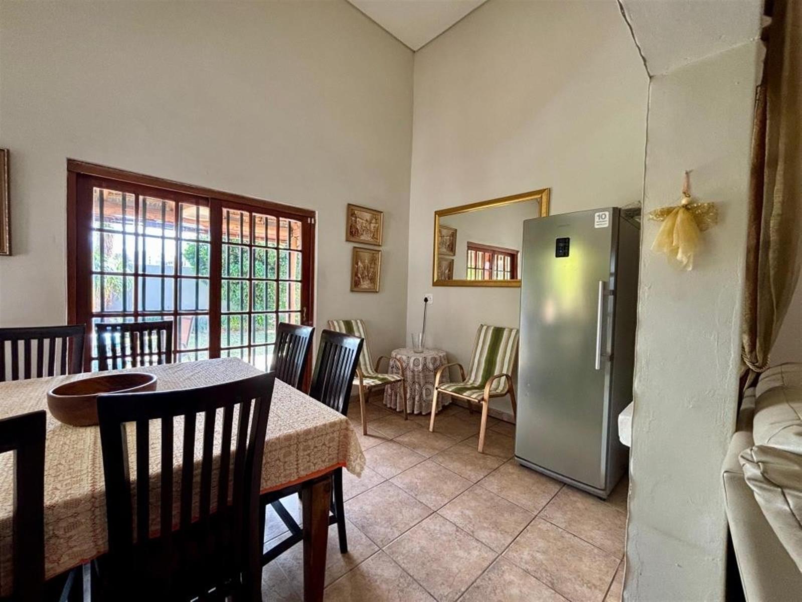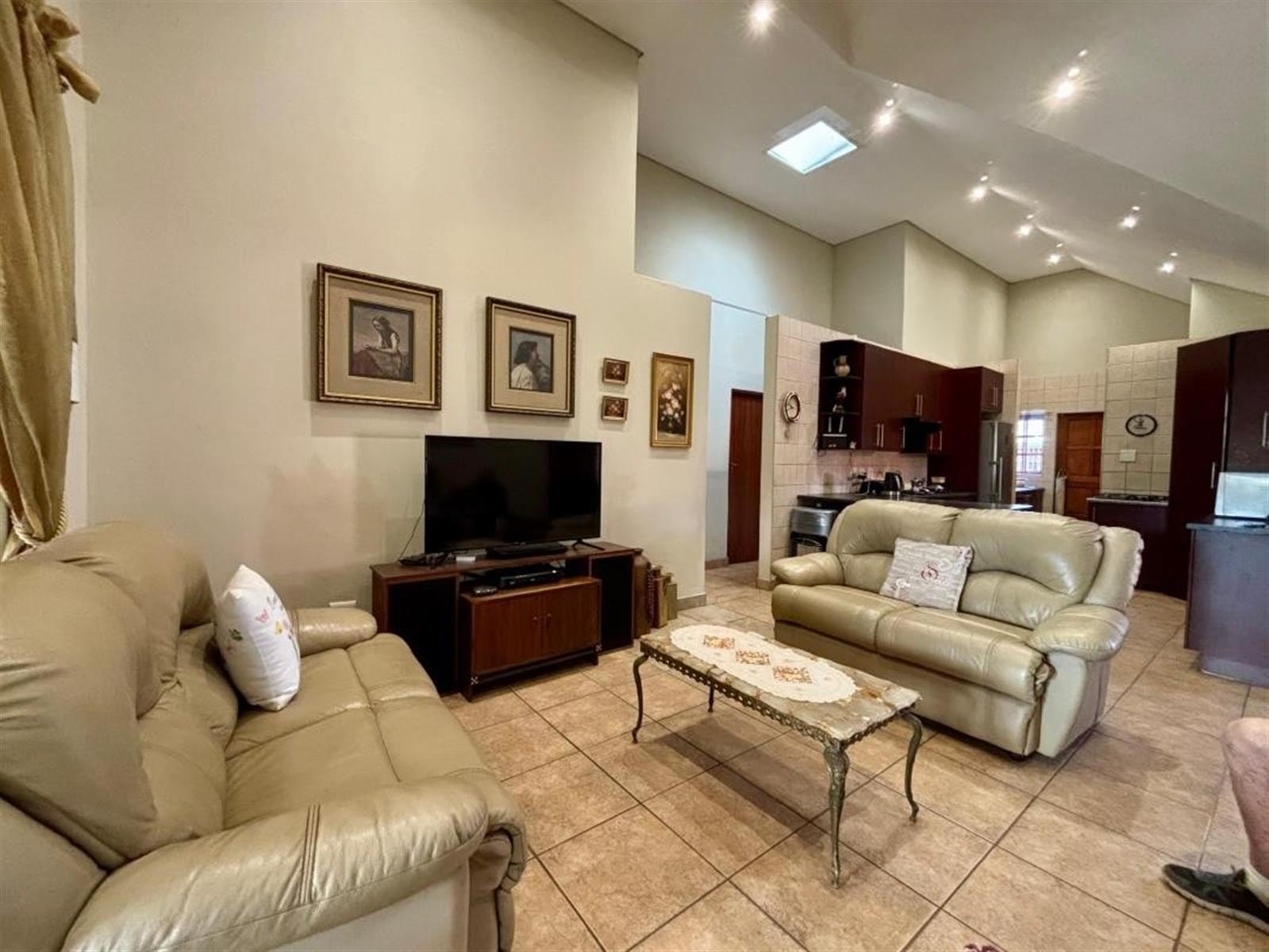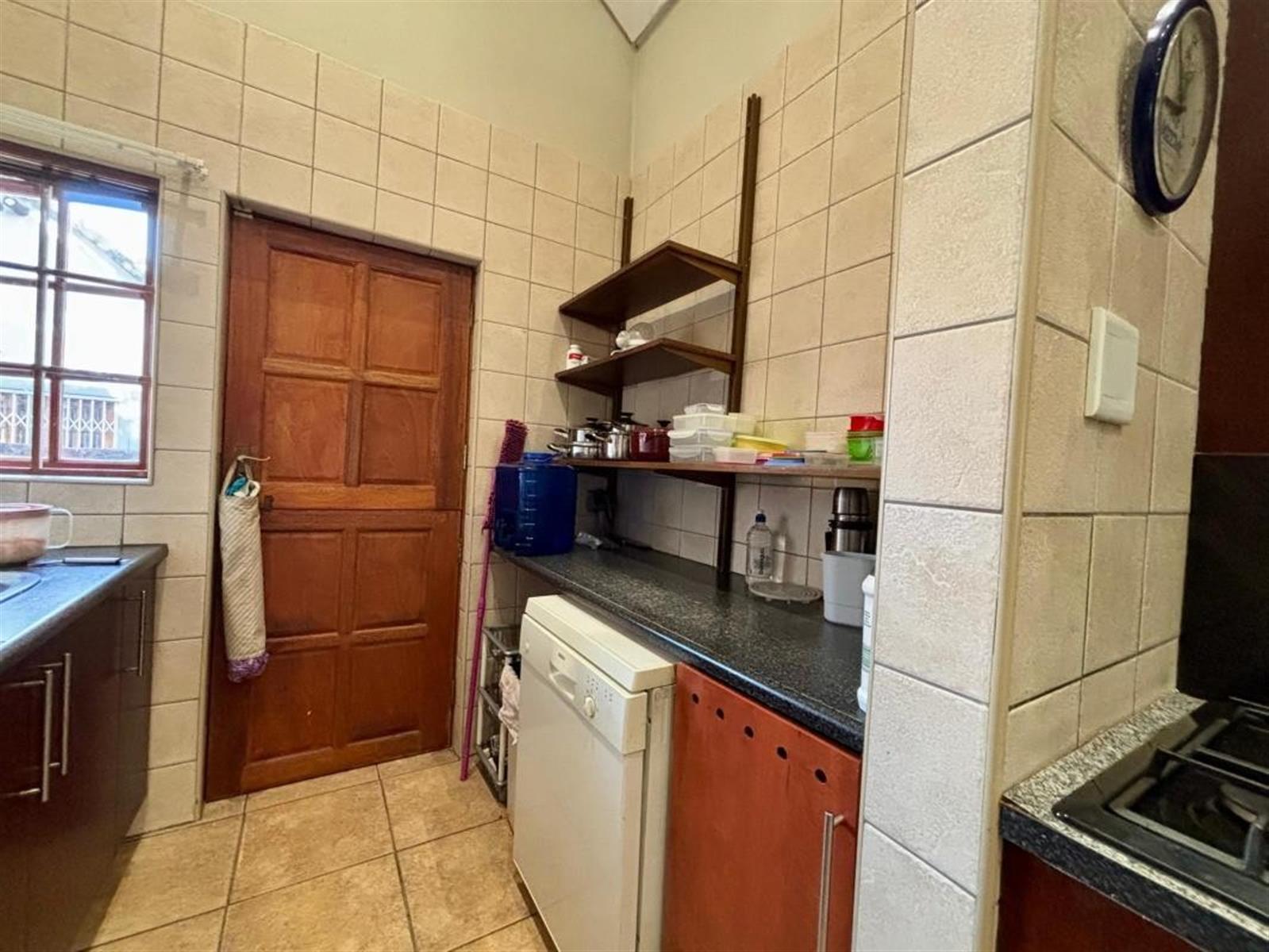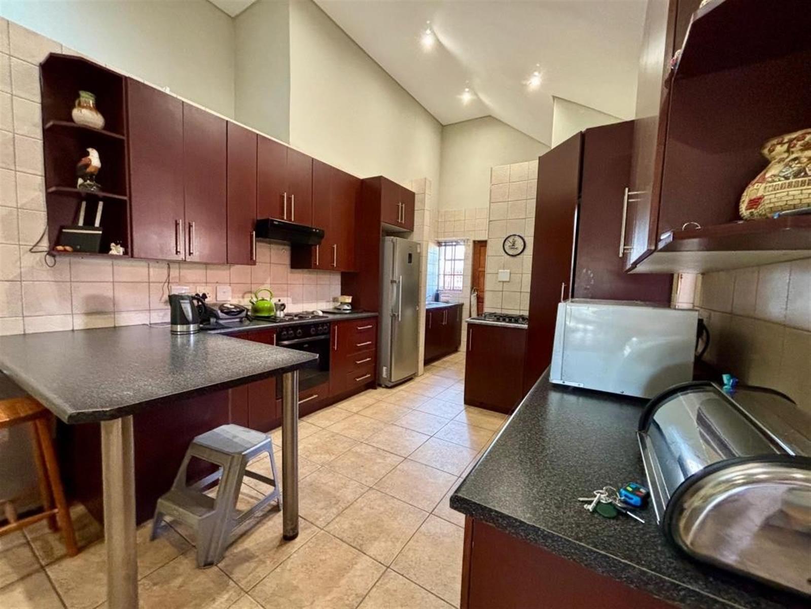 Inside, a generous open-plan design seamlessly connects the kitchen, dining, and living areas. The kitchen is both functional and stylish, boasting abundant cupboard space, a full undercounter oven, a hob, and an additional gas hob conveniently located near the pantry. A separate scullery allows for effortless access to the backyard. The air-conditioned living area opens through elegant French doors into a versatile dining zone or an enclosed, sunlit patio. This bright patio flows onto a thatch-covered stoop, leading to a private, pet-friendly garden complete with a built-in braai—perfect for relaxed outdoor gatherings.