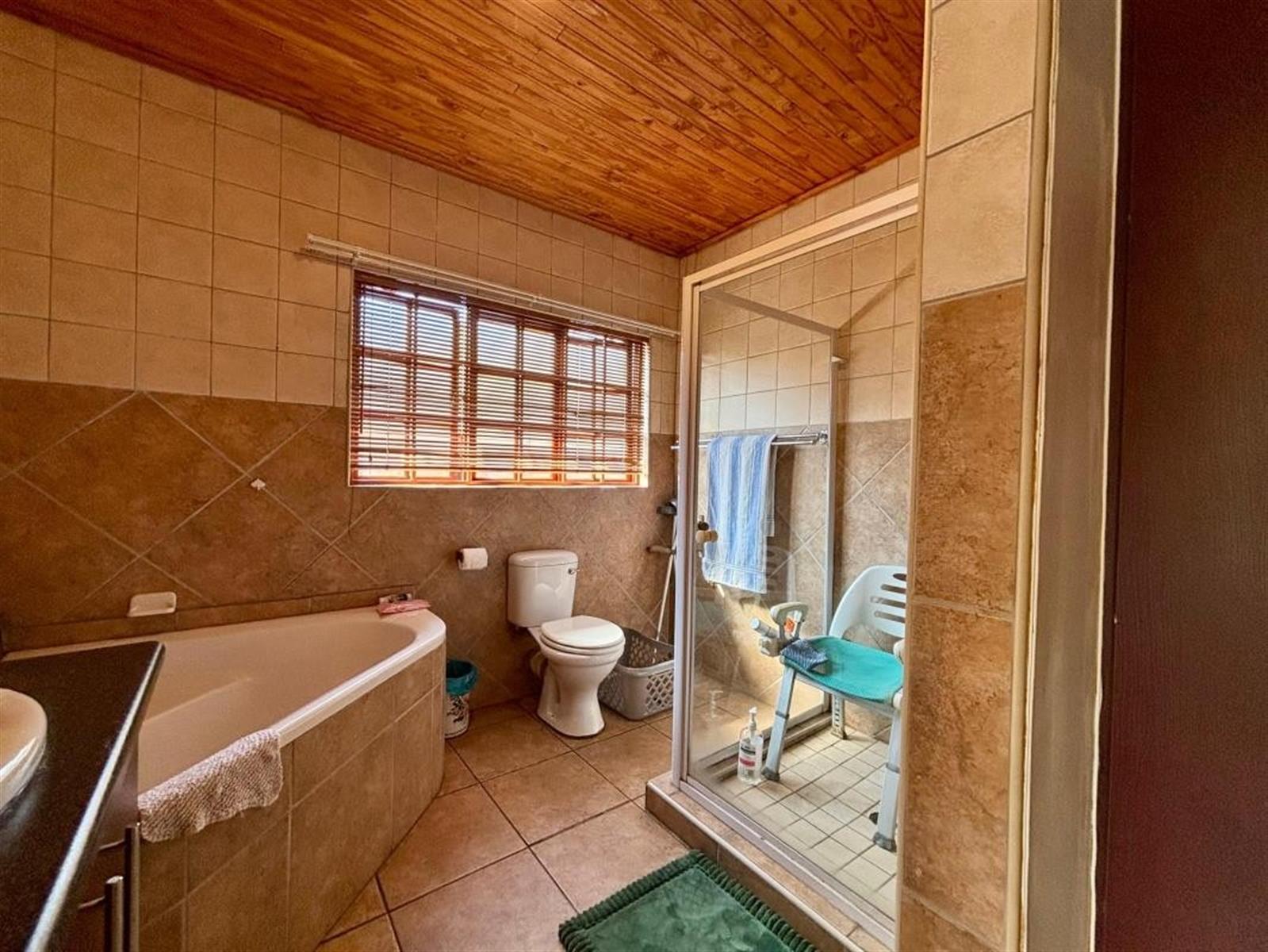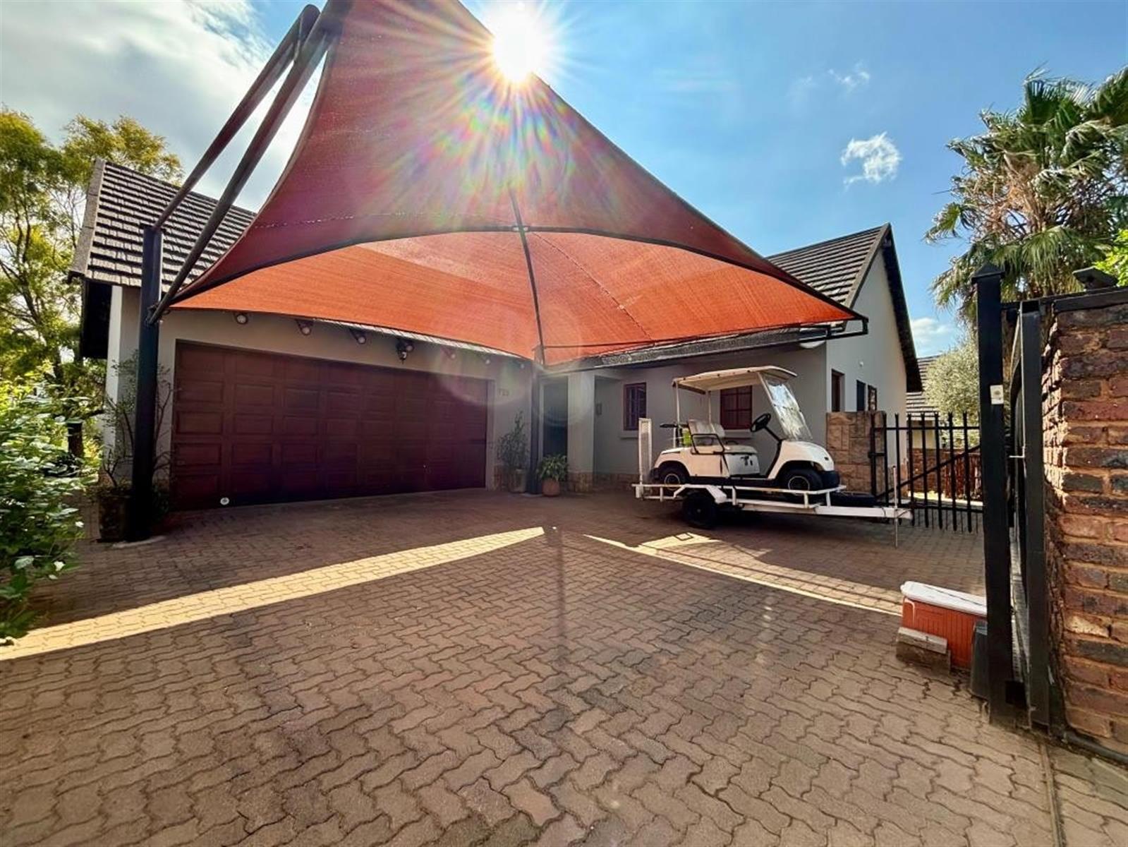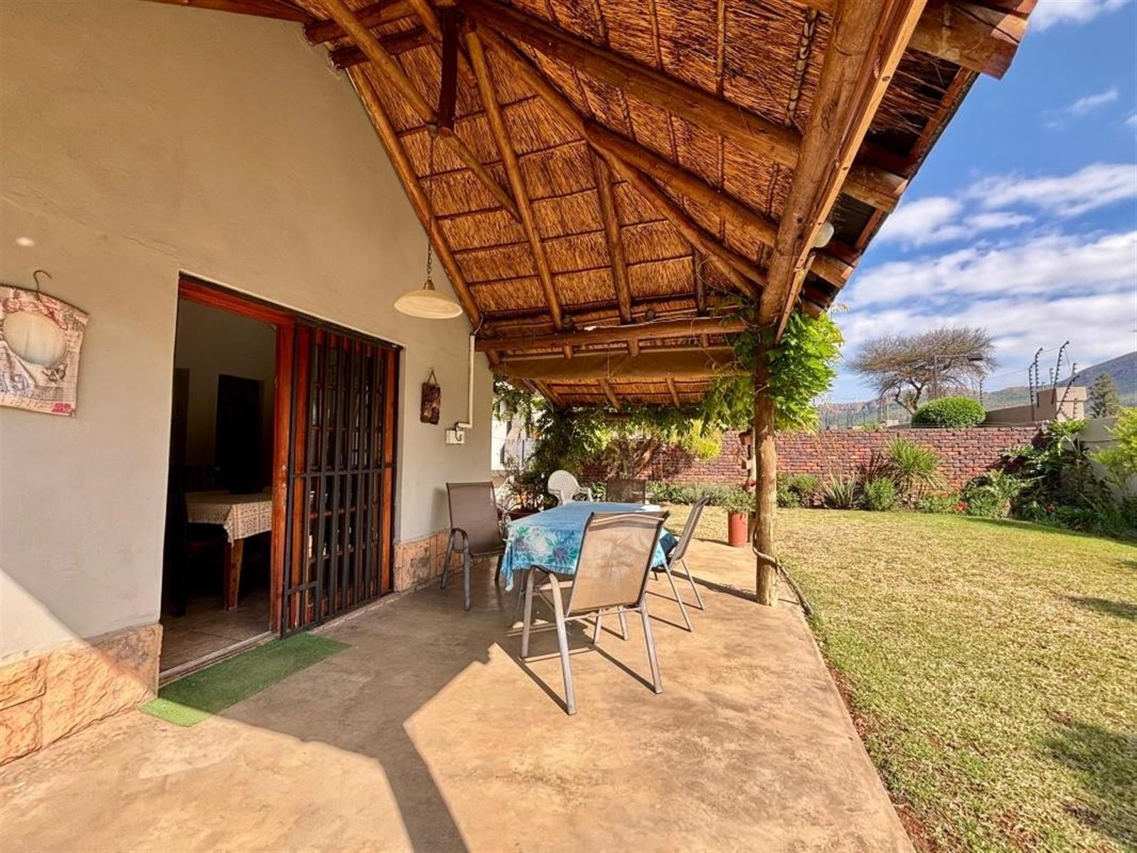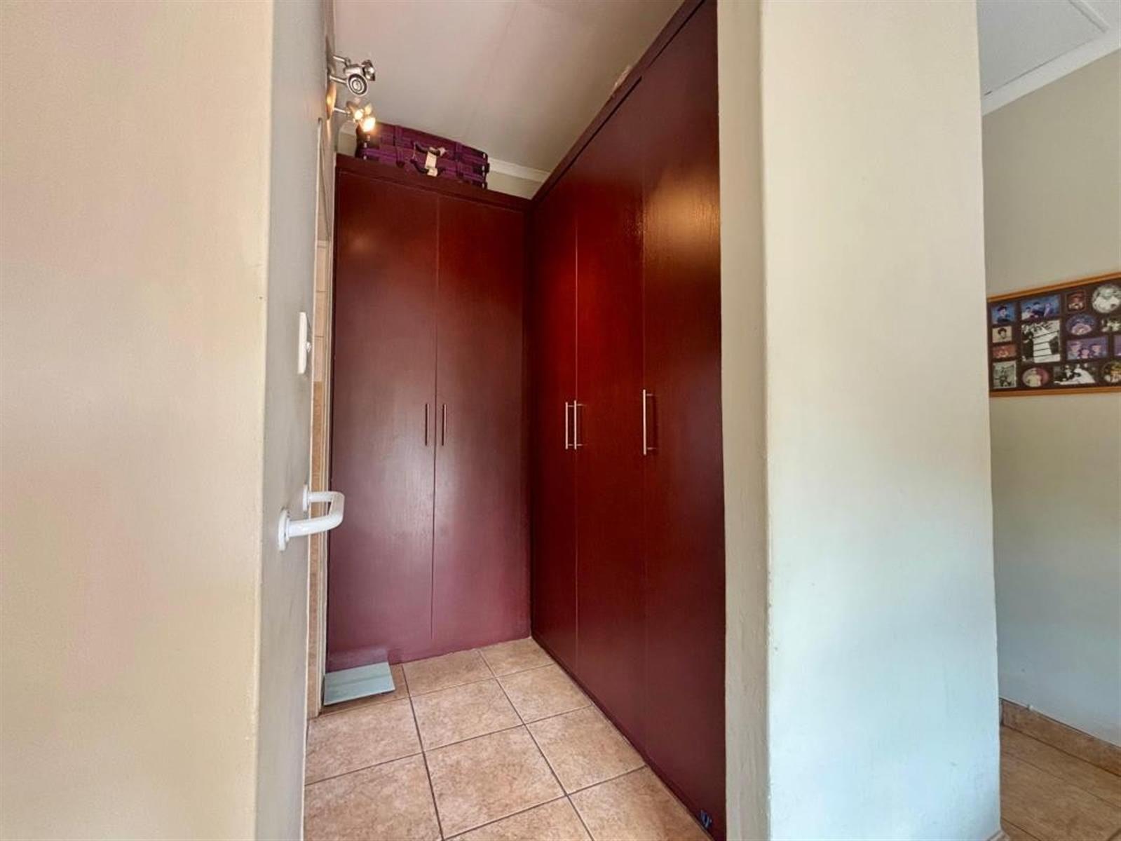 Inside, a generous open-plan design seamlessly connects the kitchen, dining, and living areas. The kitchen is both functional and stylish, boasting abundant cupboard space, a full undercounter oven, a hob, and an additional gas hob conveniently located near the pantry. A separate scullery allows for effortless access to the backyard. The air-conditioned living area opens through elegant French doors into a versatile dining zone or an enclosed, sunlit patio. This bright patio flows onto a thatch-covered stoop, leading to a private, pet-friendly garden complete with a built-in braai—perfect for relaxed outdoor gatherings.