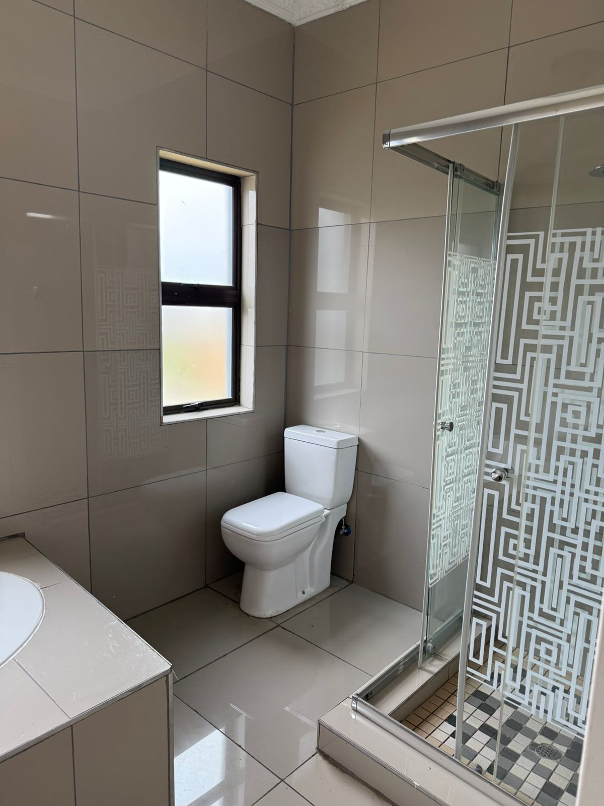 The open-plan kitchen is well-appointed with an electric stove and extractor fan, ample cupboard space, and a separate scullery for added convenience and functionality.