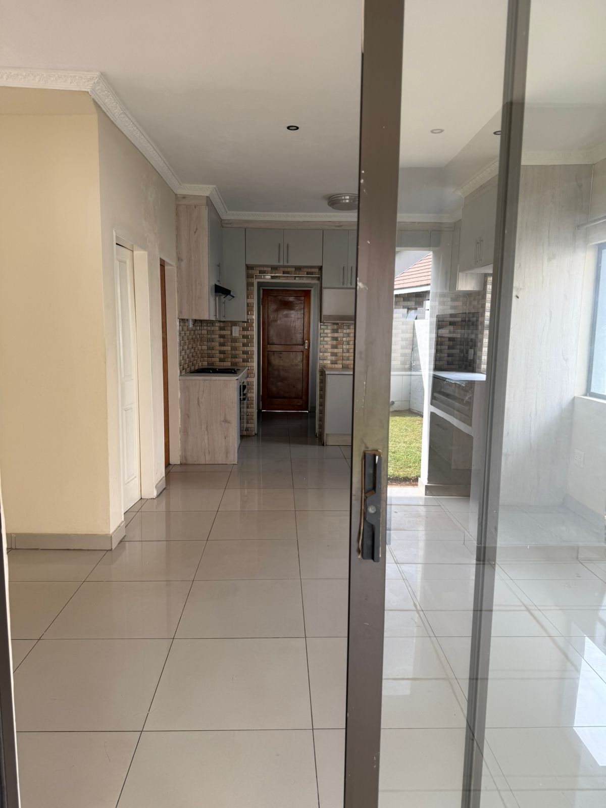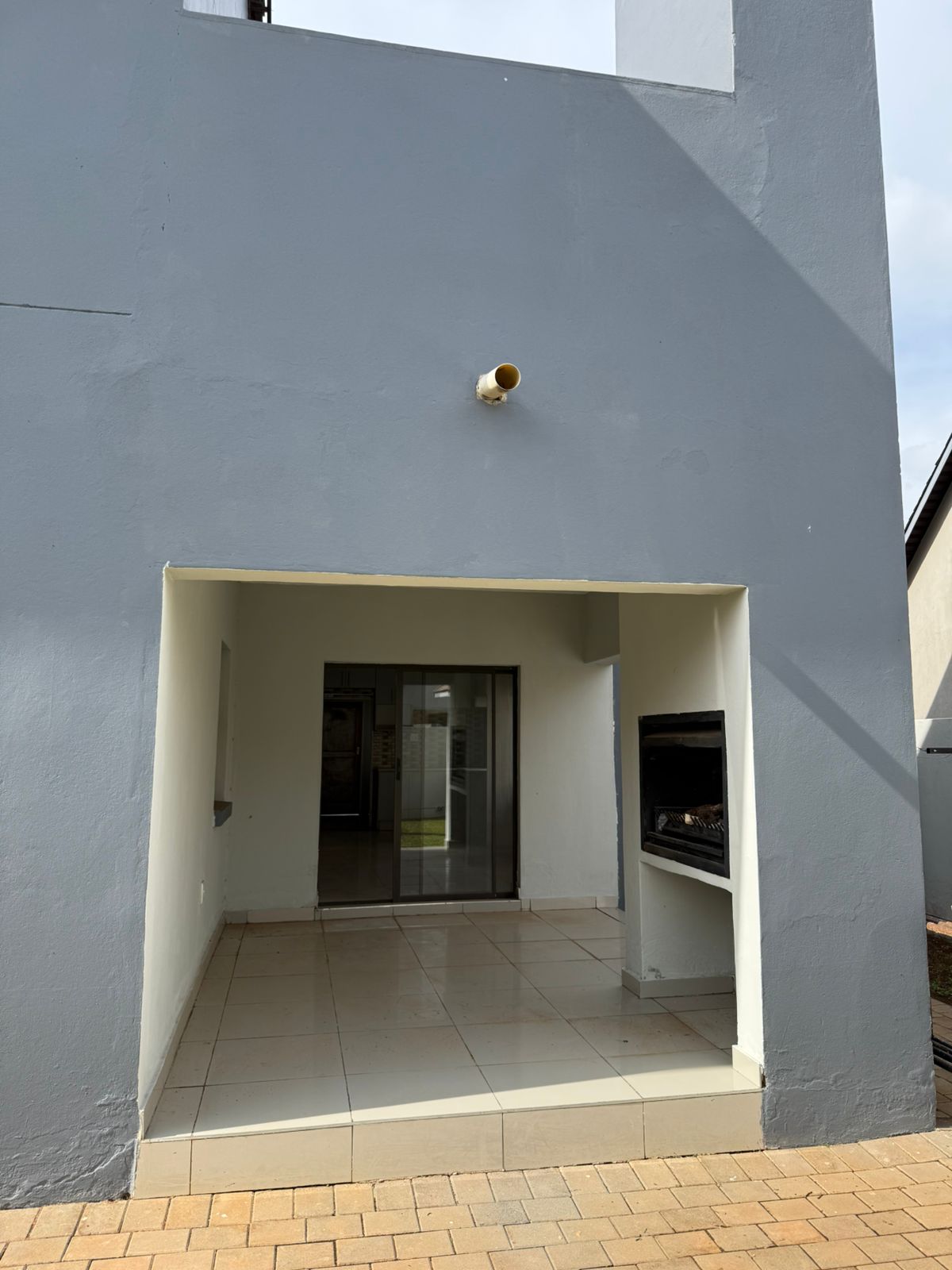 Downstairs living areas open seamlessly onto a covered patio with a built-in braai, creating the perfect space for entertaining friends and family.