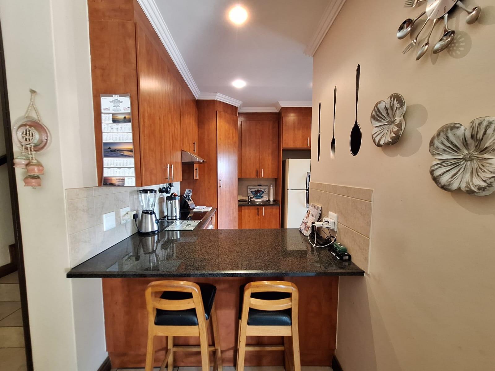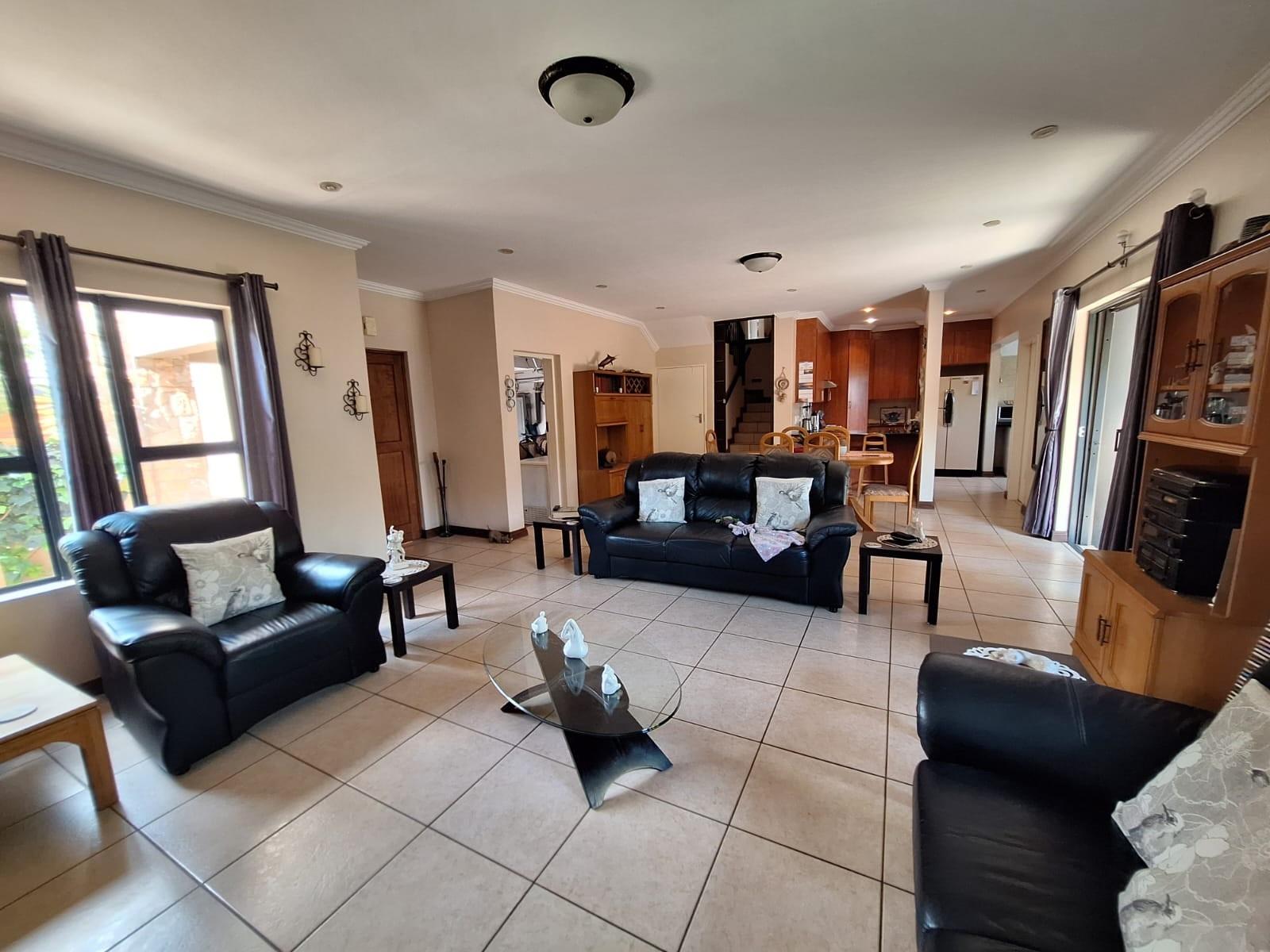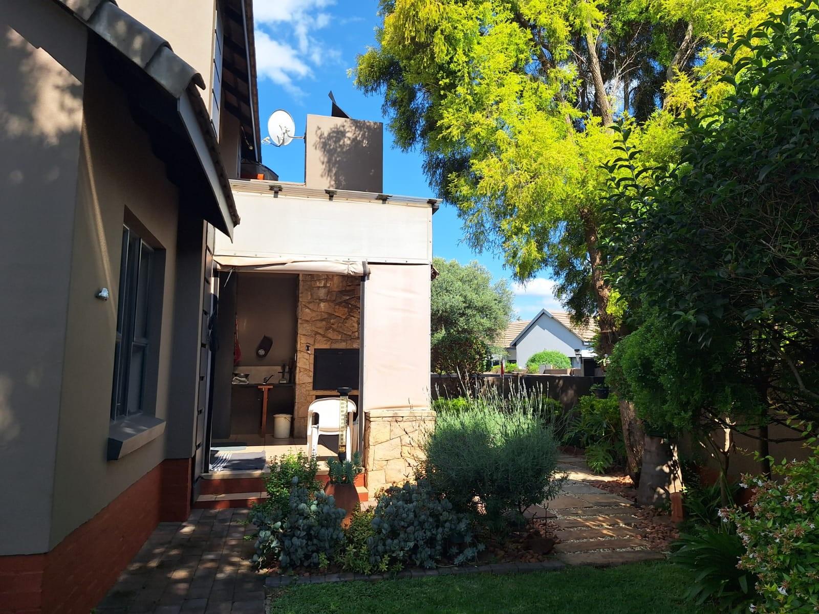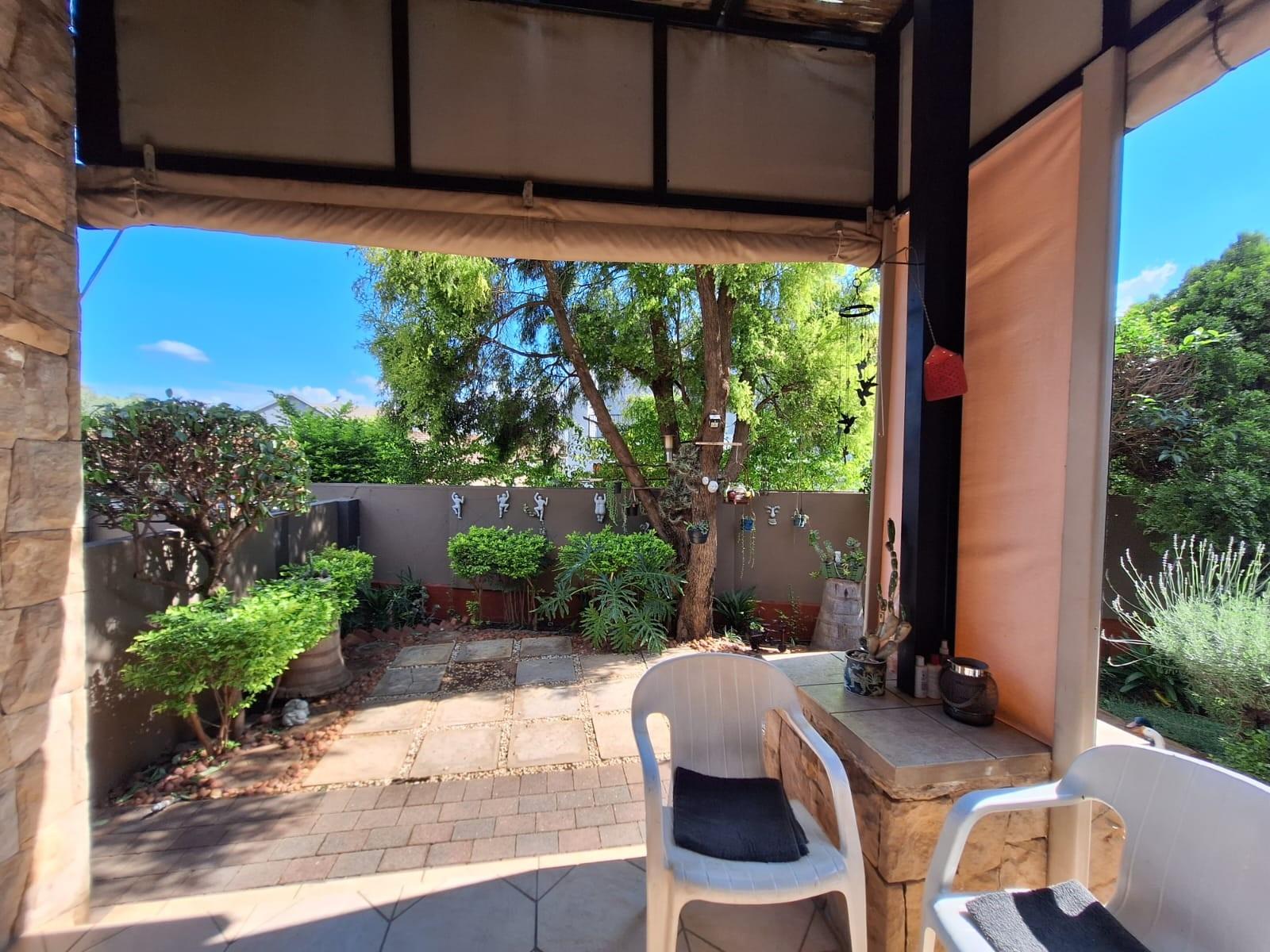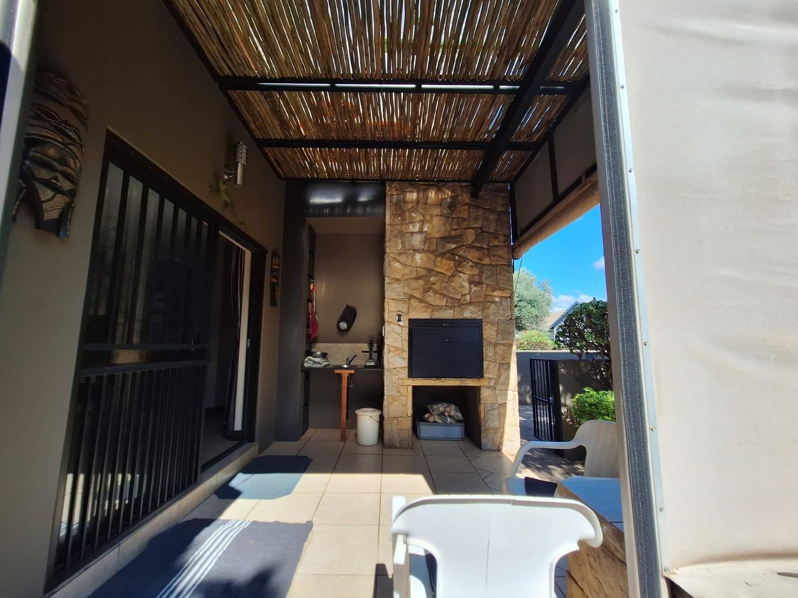 The living area opens onto a covered patio with a built-in braai, overlooking the well-maintained, irrigated garden — the perfect space for relaxing or entertaining.