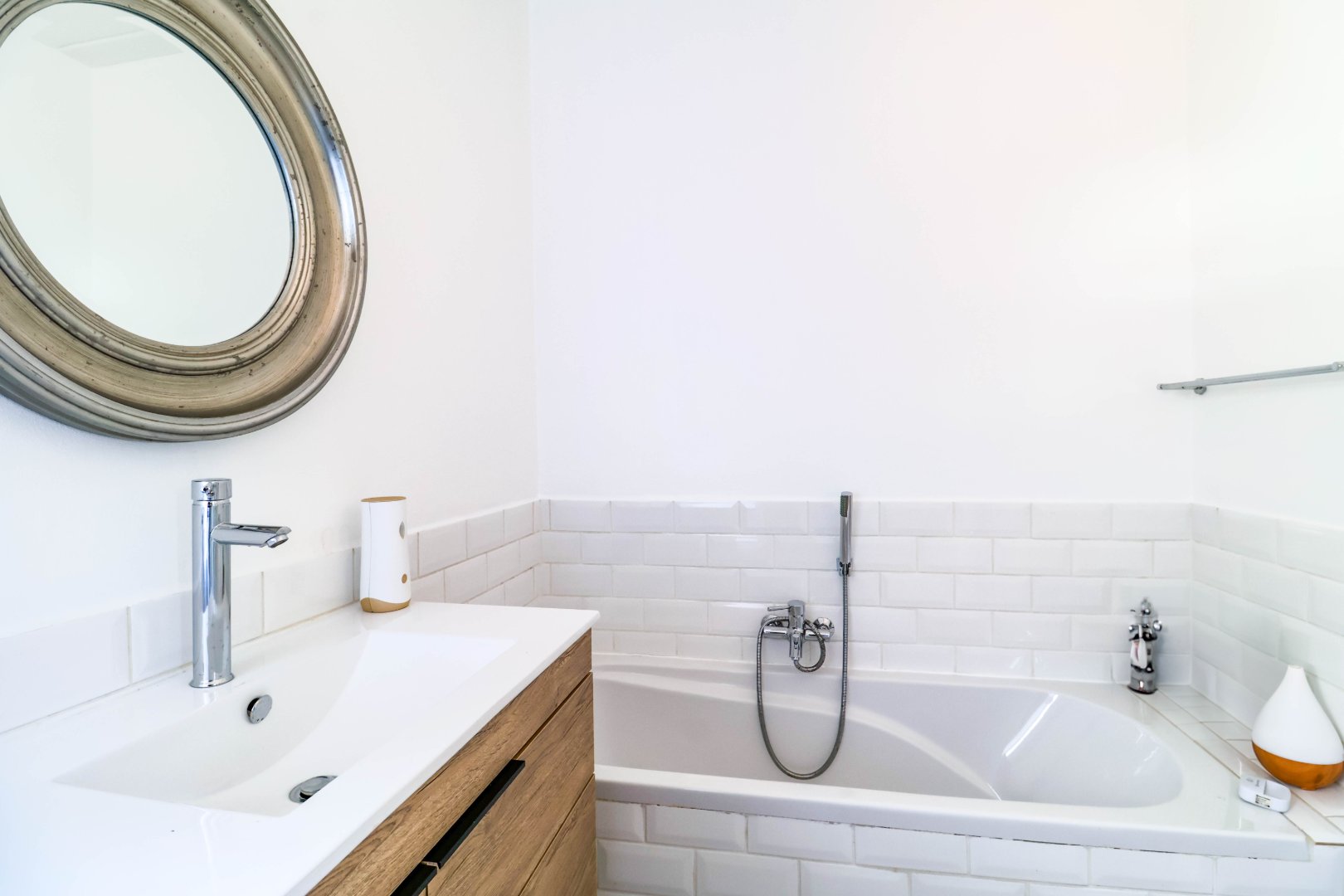 A full bathroom, newly tiled, services the apartment and boasts an amazing rain shower head and aluminum windows alongside the modern finish.