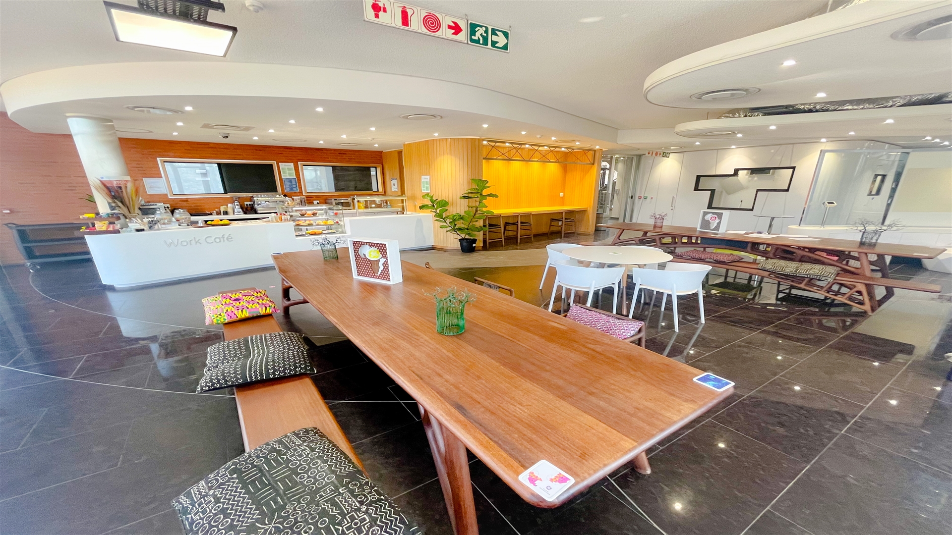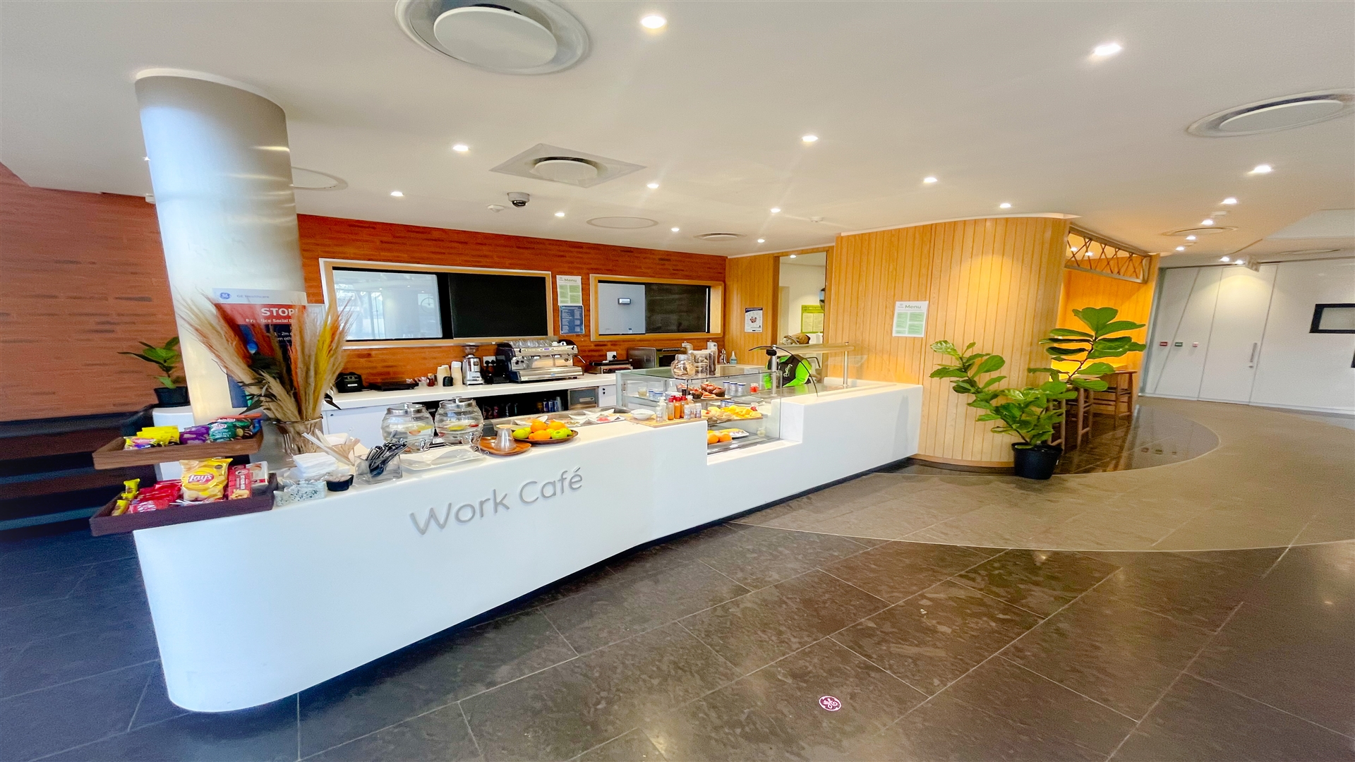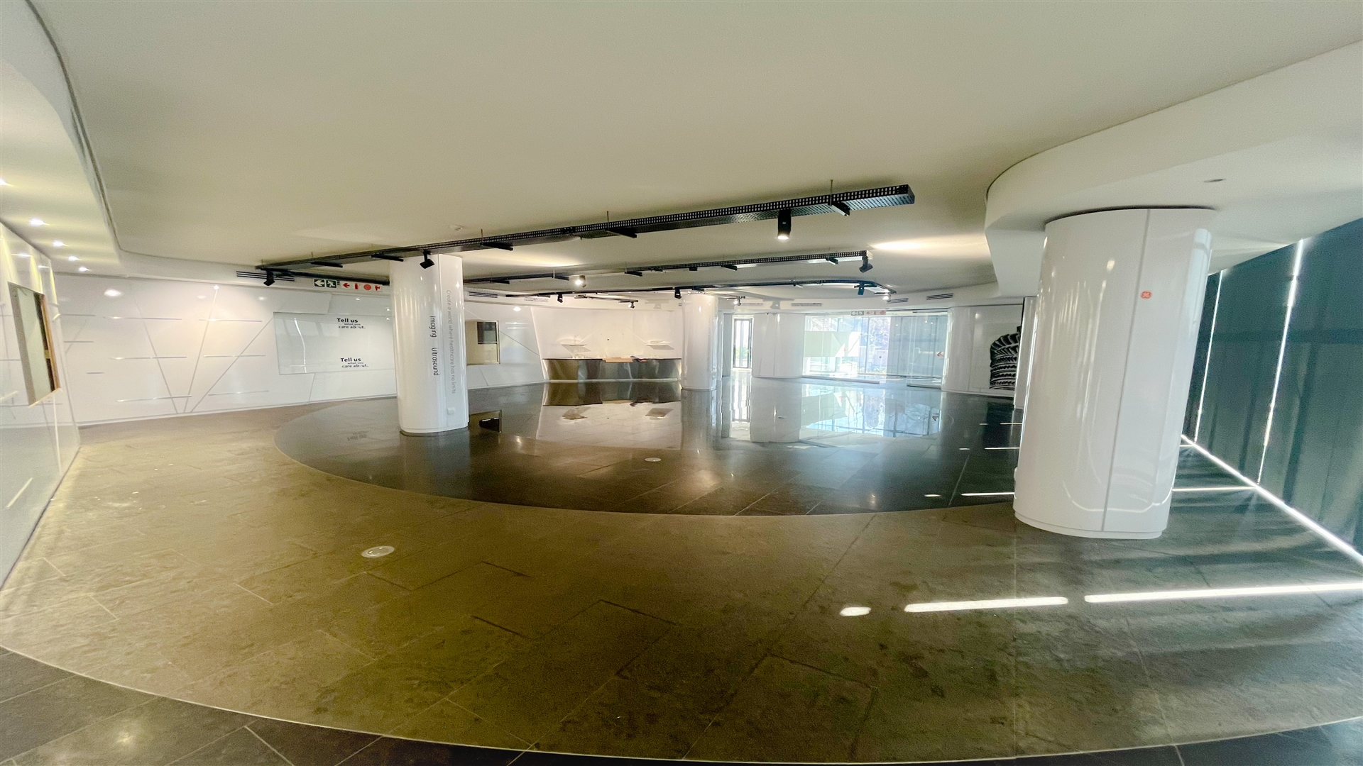 The available office space is situated on the ground floor and includes a cafeteria, a spacious balcony, open-plan areas, and three private offices.