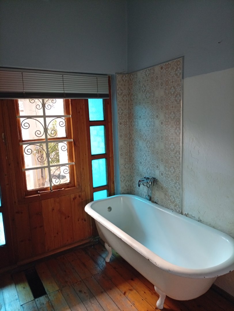 1) Main house north wing has lounge, kitchen and main bedroom ensuite- bathroom with tub, toilet and washing basin.