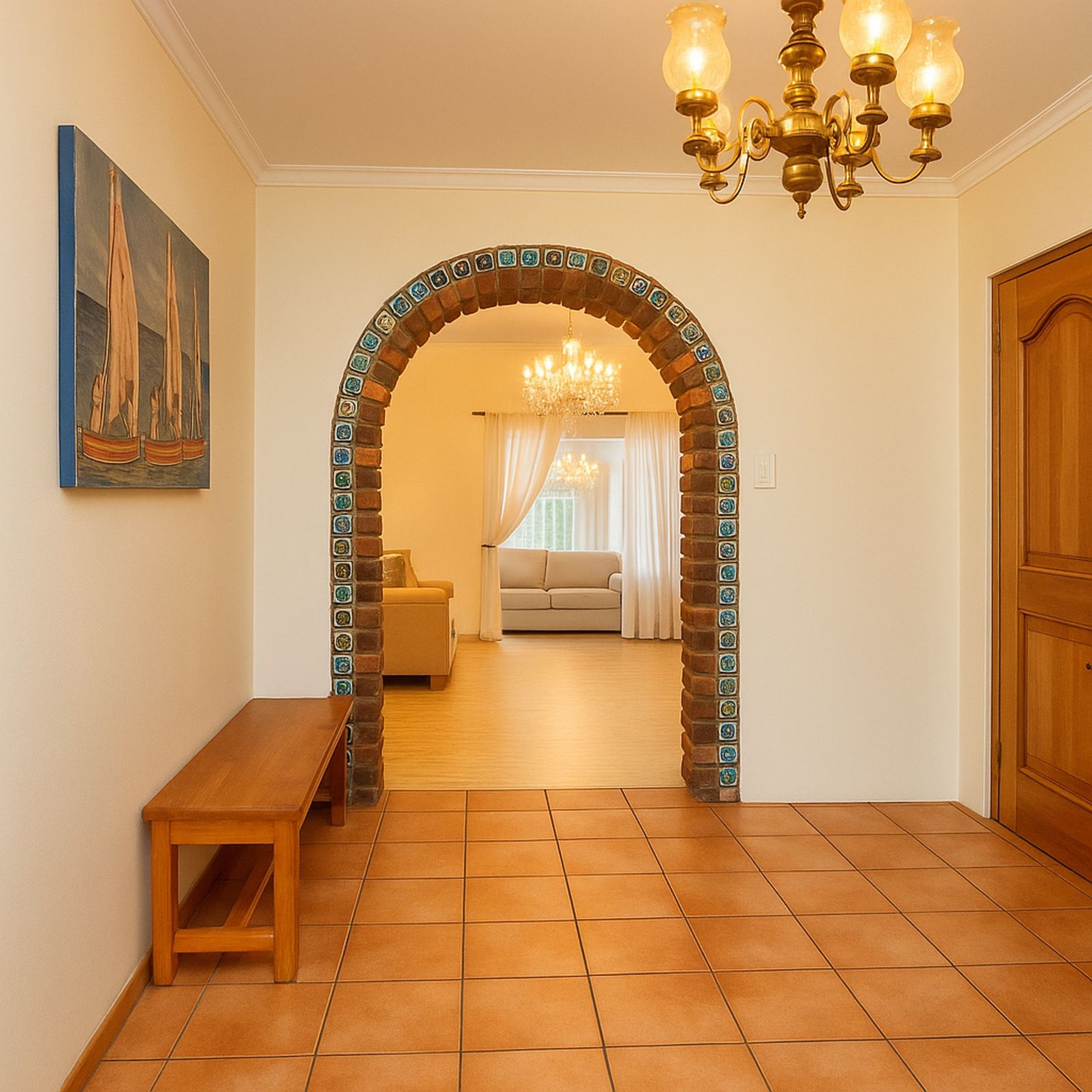 Enter through the welcoming archway into interiors featuring polished floors and a showpiece chandelier. Extras include a potential cellar and a private pool set in a tranquil garden.
