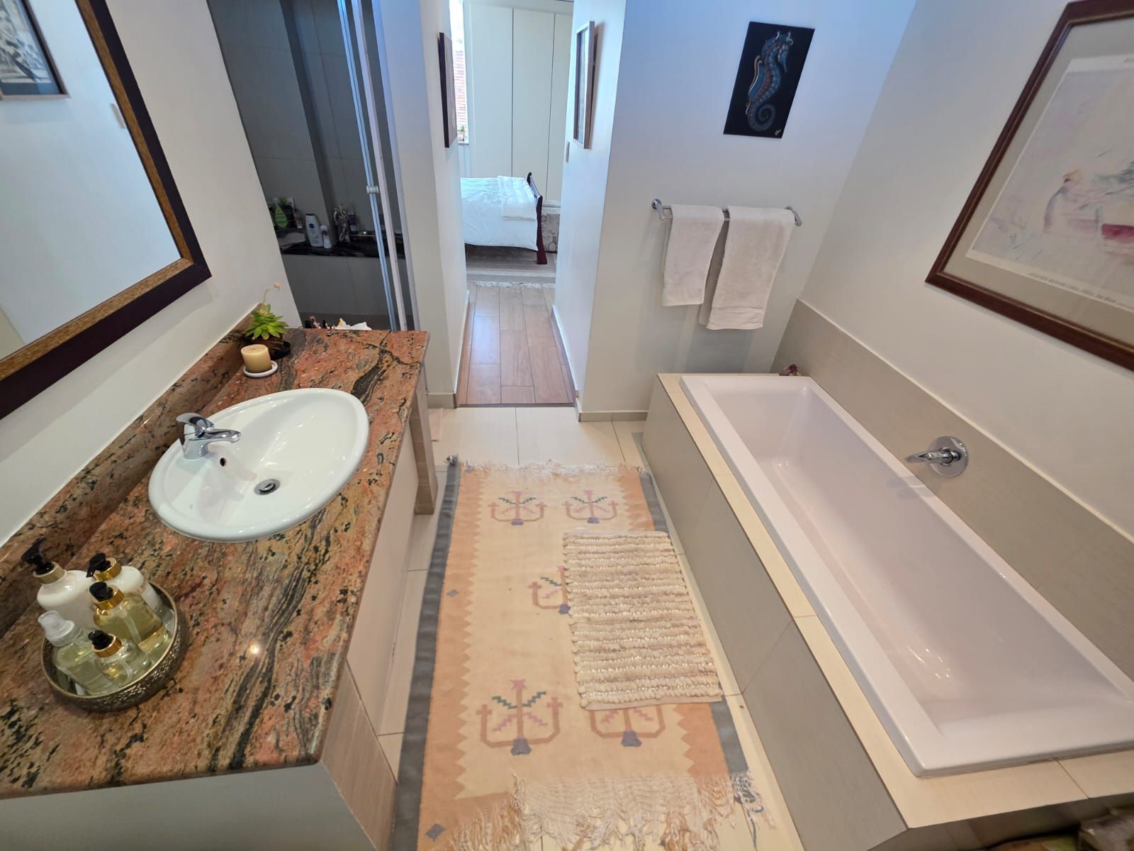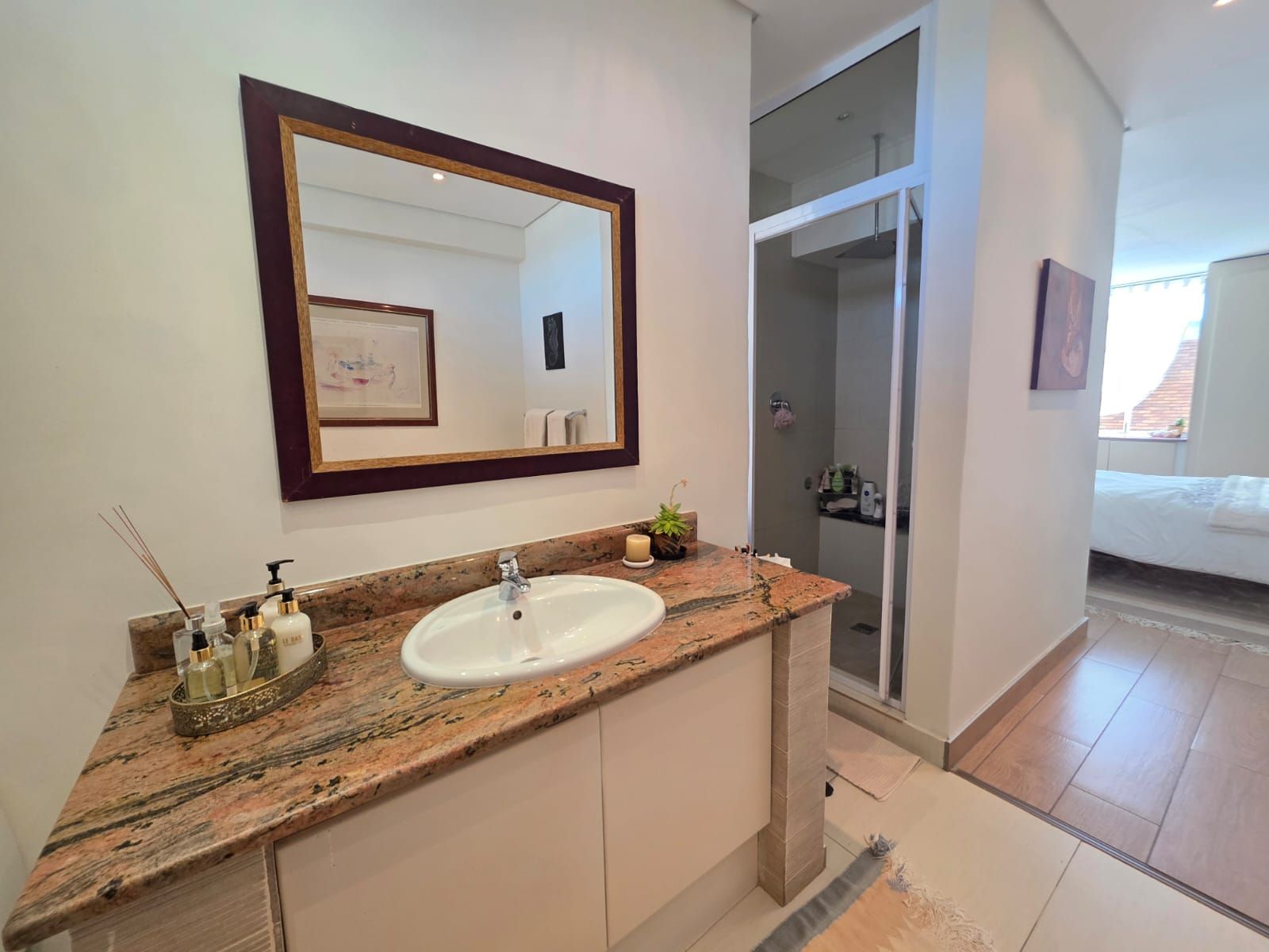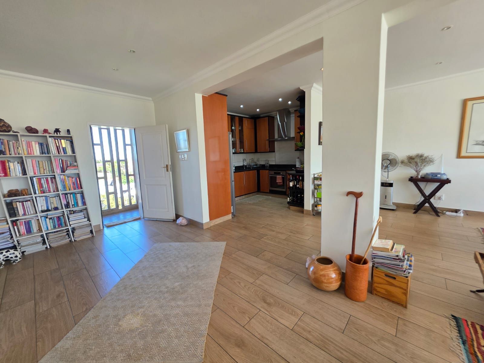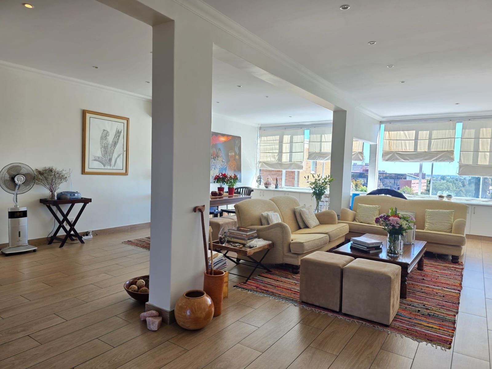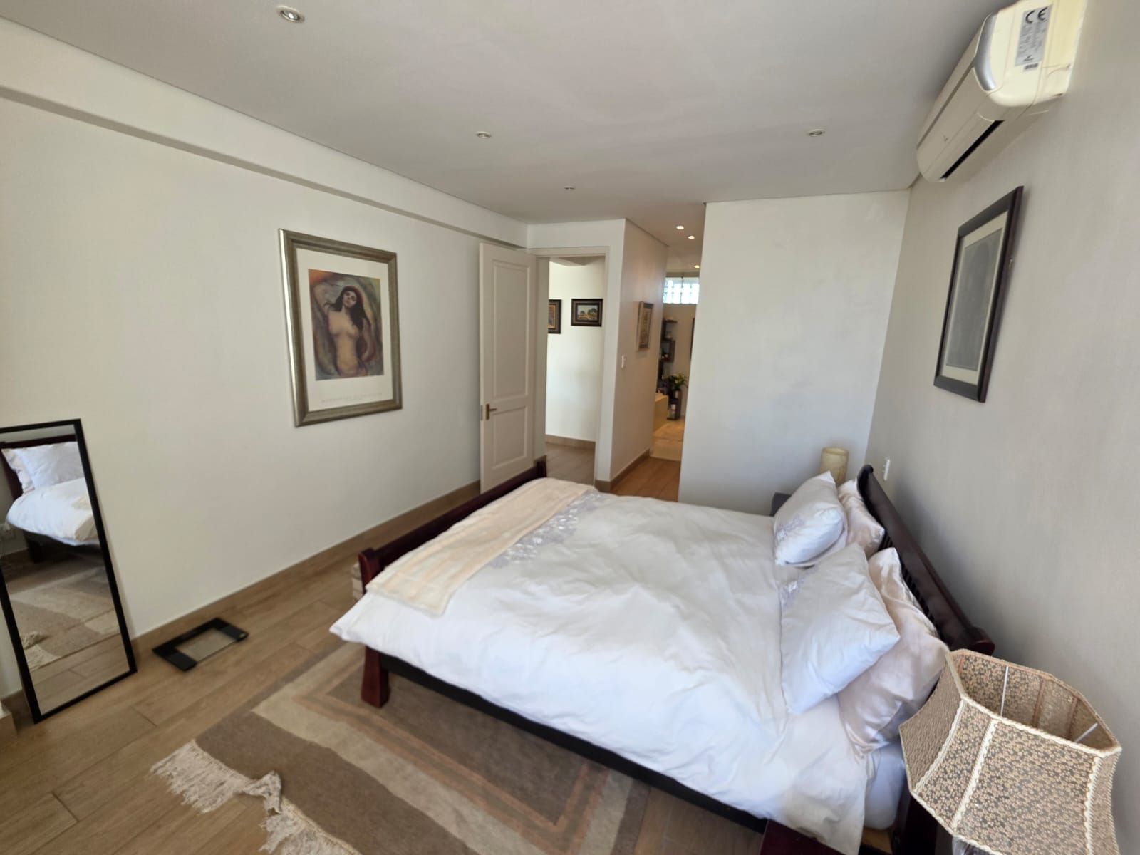The apartment offers two spacious bedrooms and two bathrooms. The open-plan living area includes a comfortable lounge, dining room, and a modern kitchen fitted with built-in cupboards, hob, extractor fan, and a scullery.