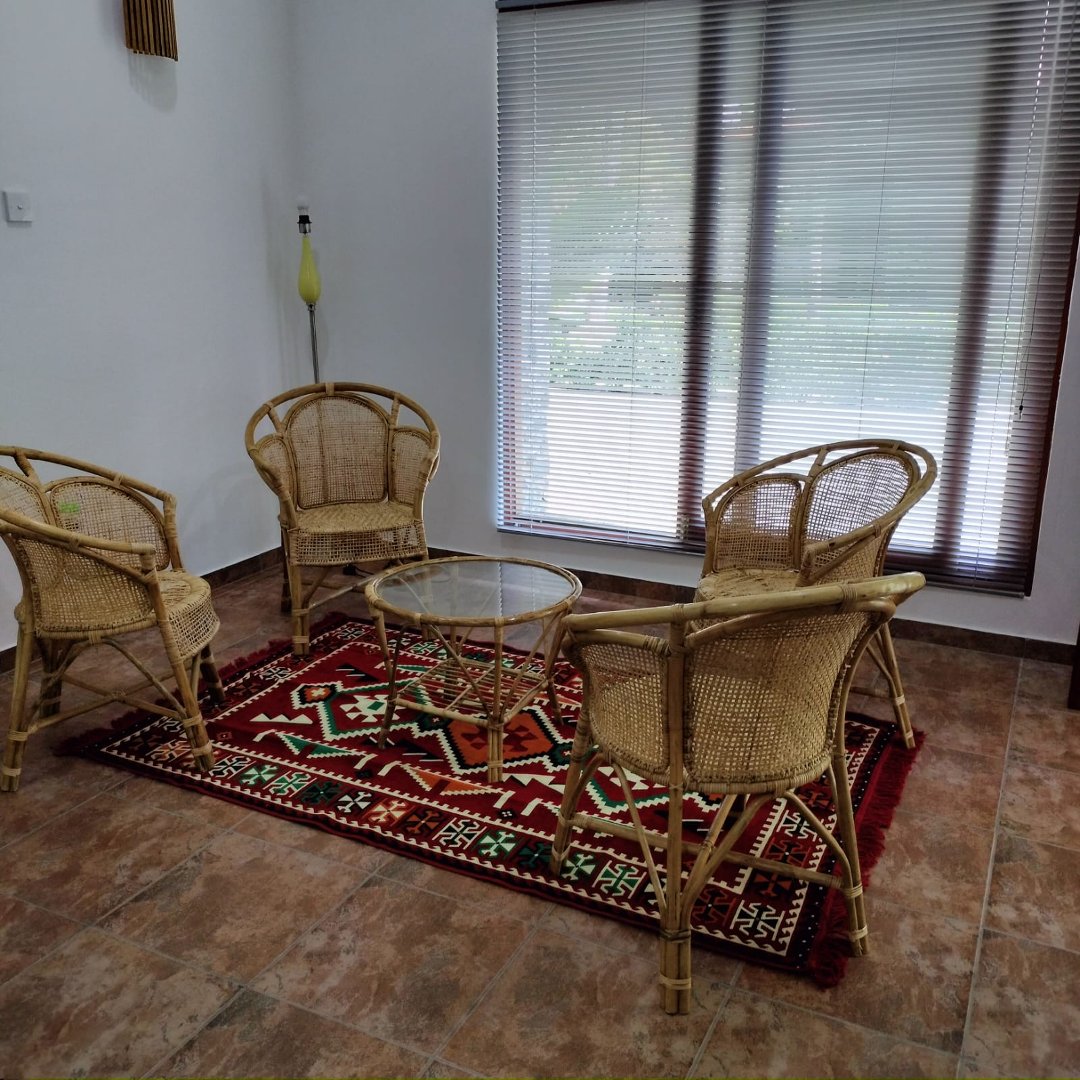- Open-Air Entertainment Area: Tables and chairs, relaxing lounge chairs, bar area, fans, with a view of paddy fields, water buffaloes, diverse birdlife, peacocks, and Adam’s Peak.