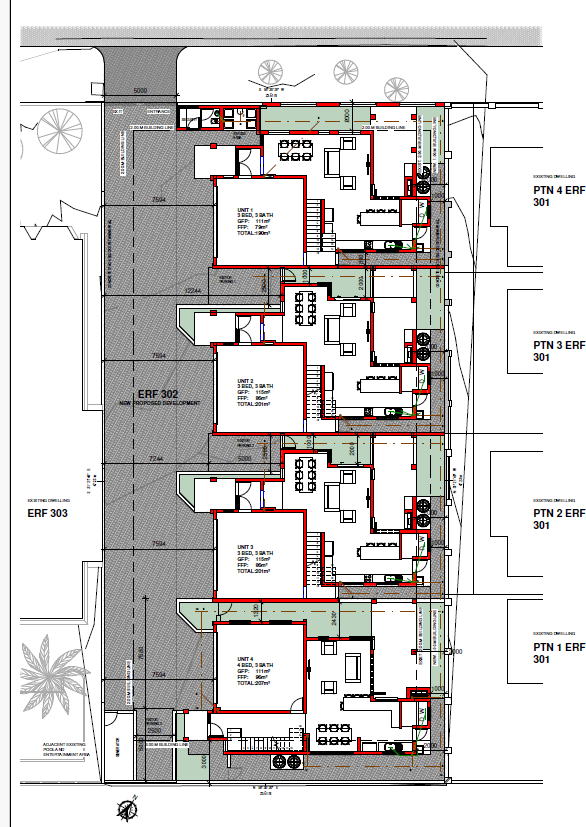 - Renovate the existing 267m2 dwelling and develop two additional units of approximately 180m2 each on the front portion of the erf.