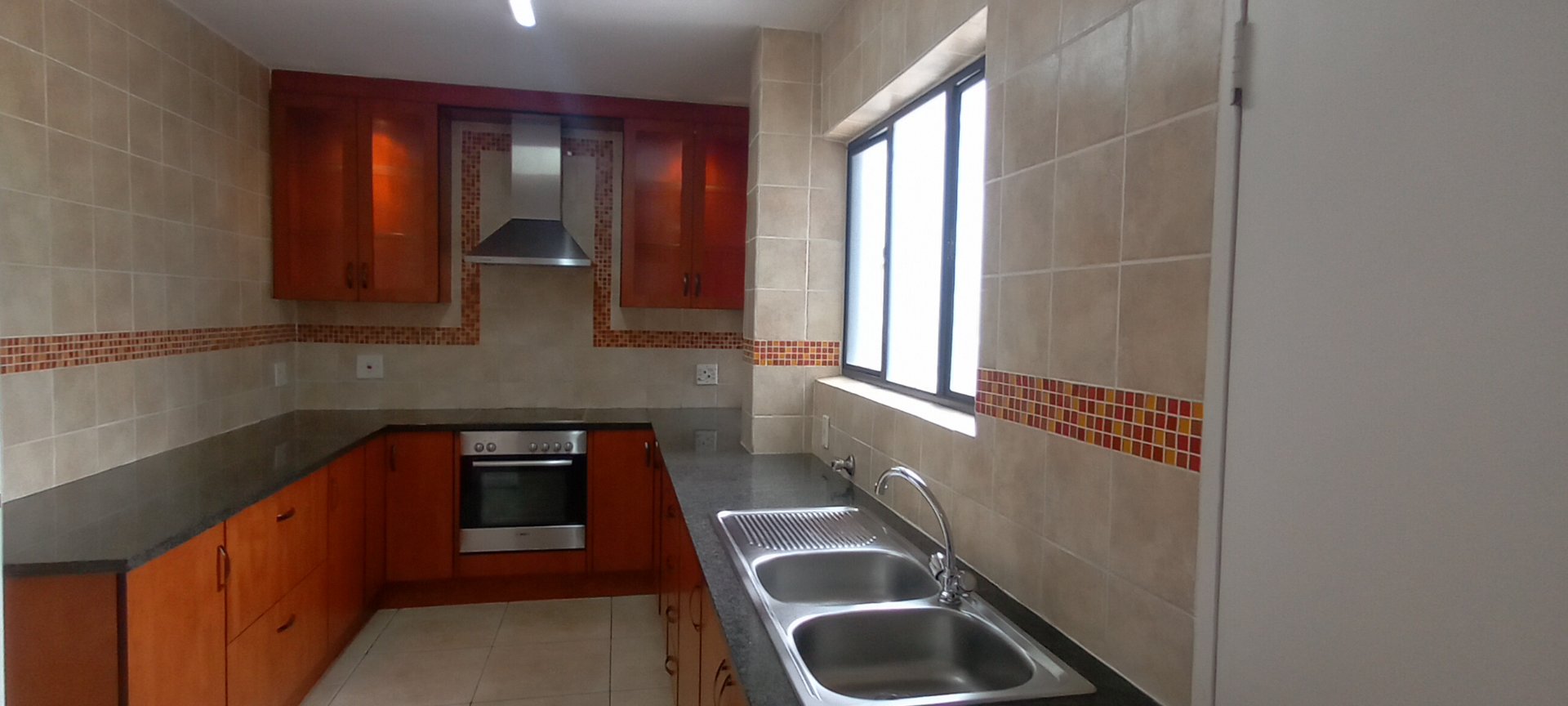 Enjoy an open-plan kitchen with granite countertops, ample cupboards, an oven, extractor fan, and a neat laundry nook. Aluminium windows, sliding doors, and tiled floors add a sleek modern touch.