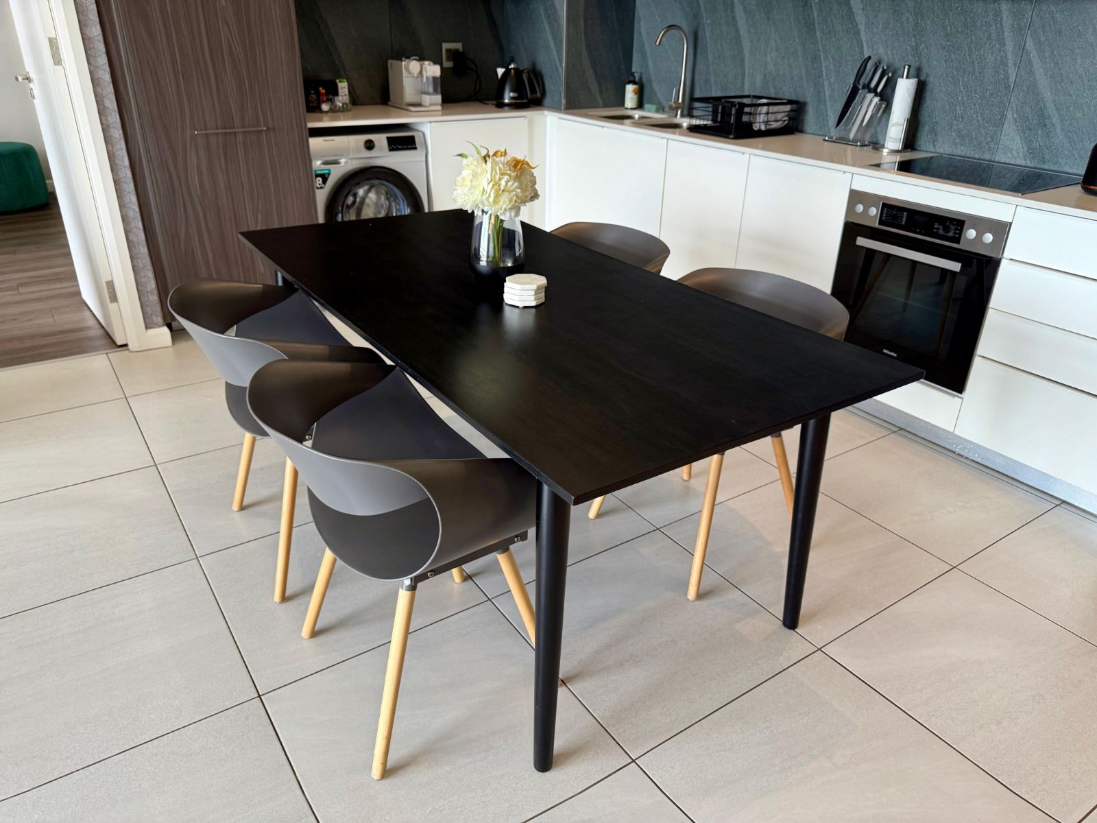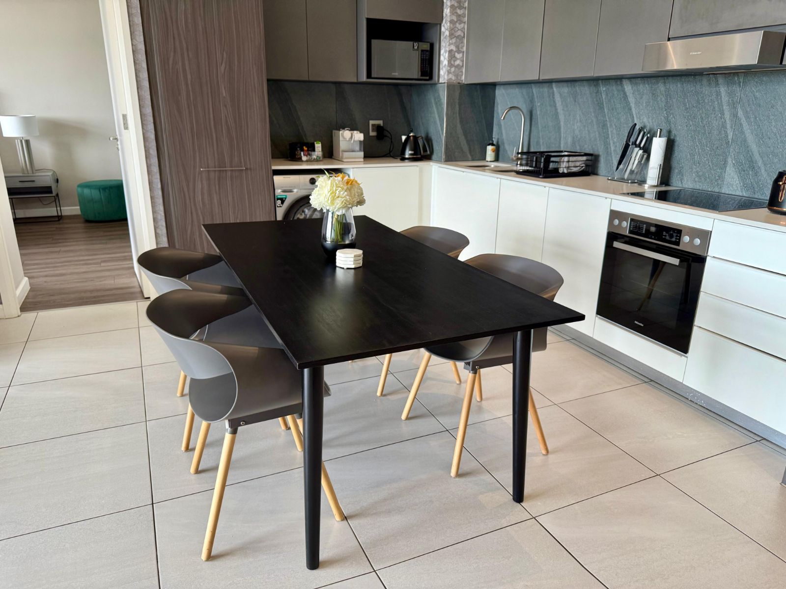 The modern kitchen is fitted with Technistone countertops and equipped with a Miele under-counter oven, electric hob, and extractor fan.