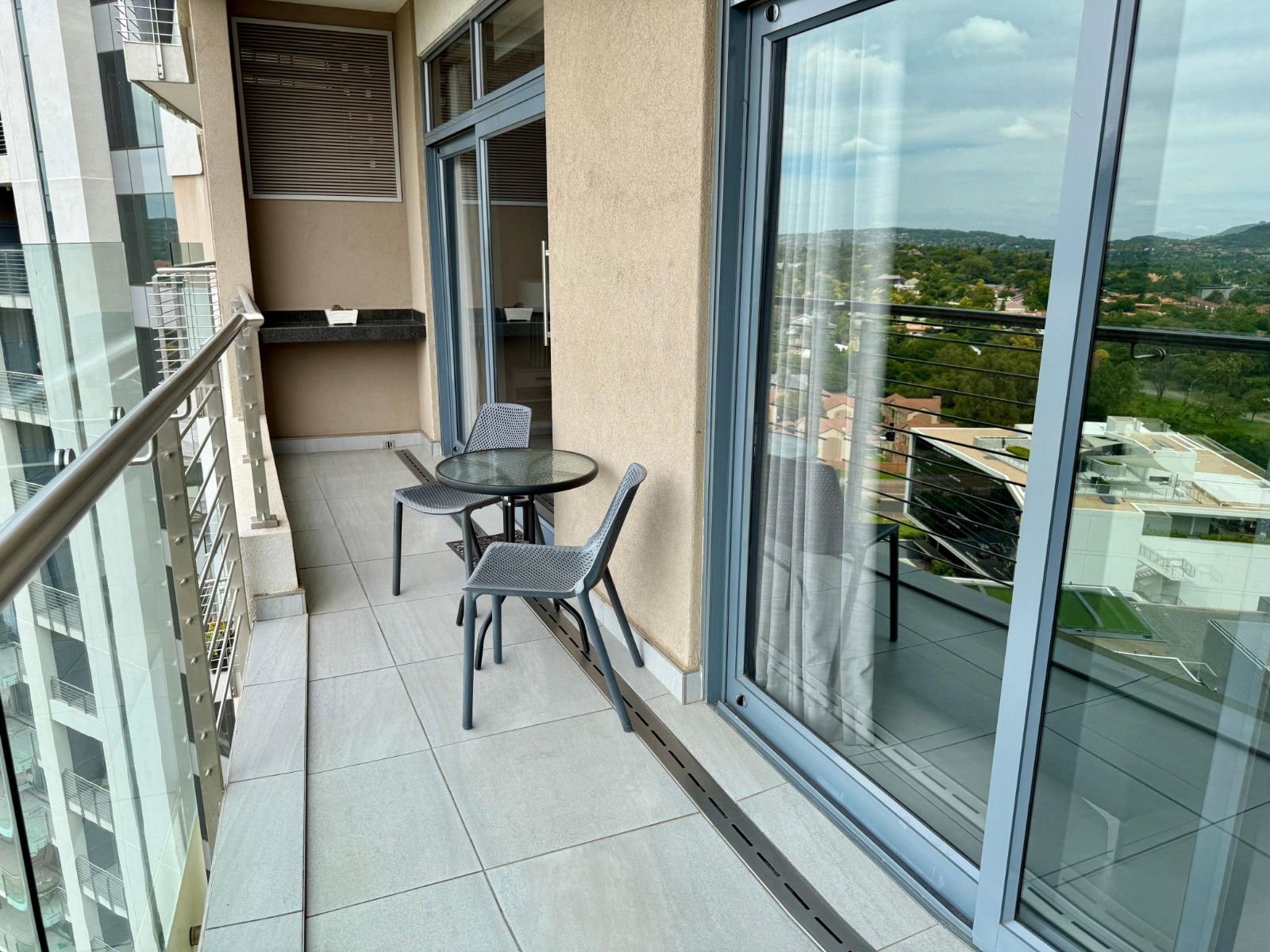 The apartment features a generous open-plan living, dining, and kitchen area, flanked by two en-suite bedrooms — one offering both a bath and a shower. Floor-to-ceiling sliding doors in the lounge and both bedrooms open onto a well-sized balcony, perfect for morning coffee or evening sundowners while overlooking the landscaped gardens and views towards Pretoria East.
