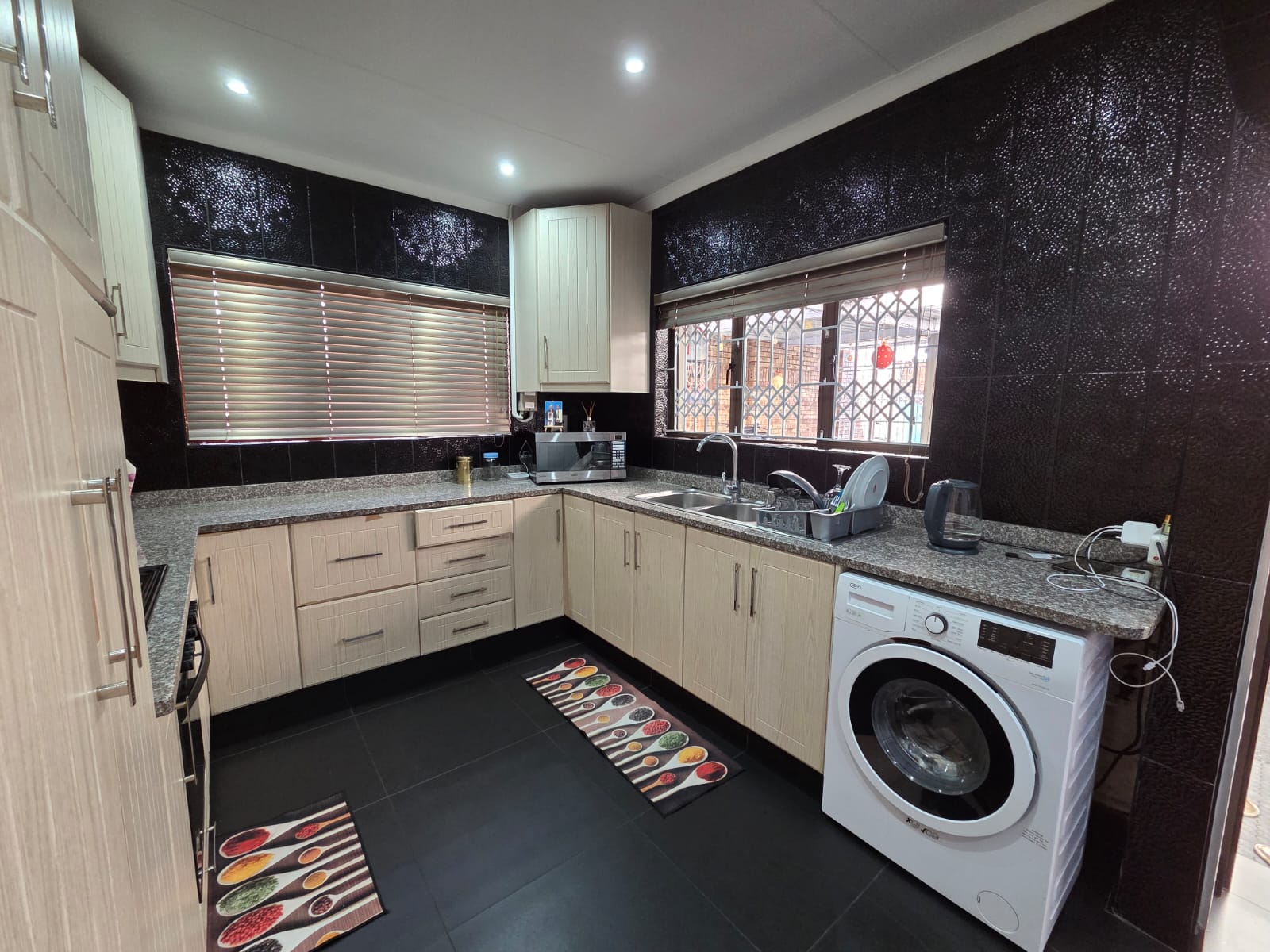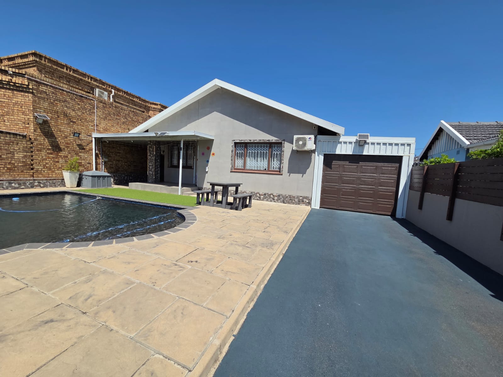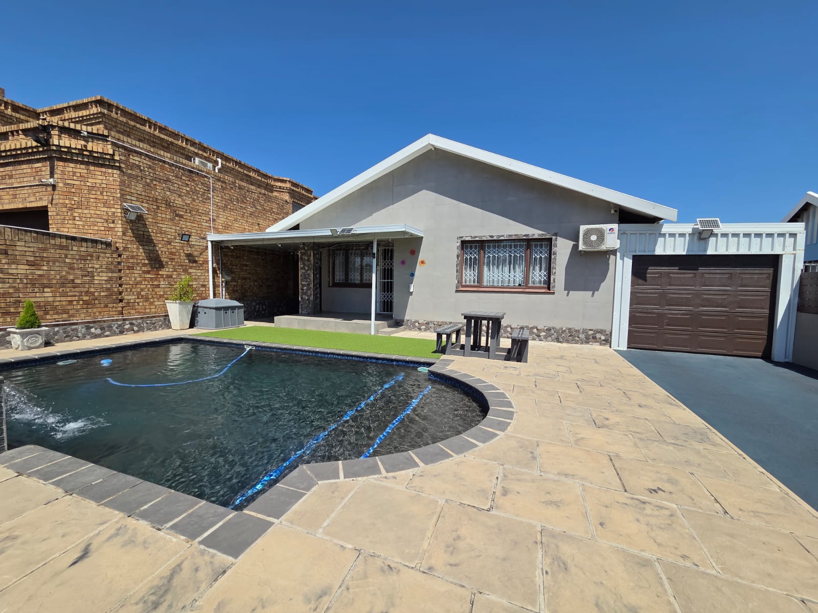 The property features a stunning ultra modern kitchen equipped with premium finishes- the true heart of the home. All three bedrooms feature sleek, contemporary built in cupboards and the entire house is elegantly tiled for a seamless, clean aesthetic. Step outside to your private retreat, featuring a sparkling blue pool perfect for summer entertaining or quiet relaxation.