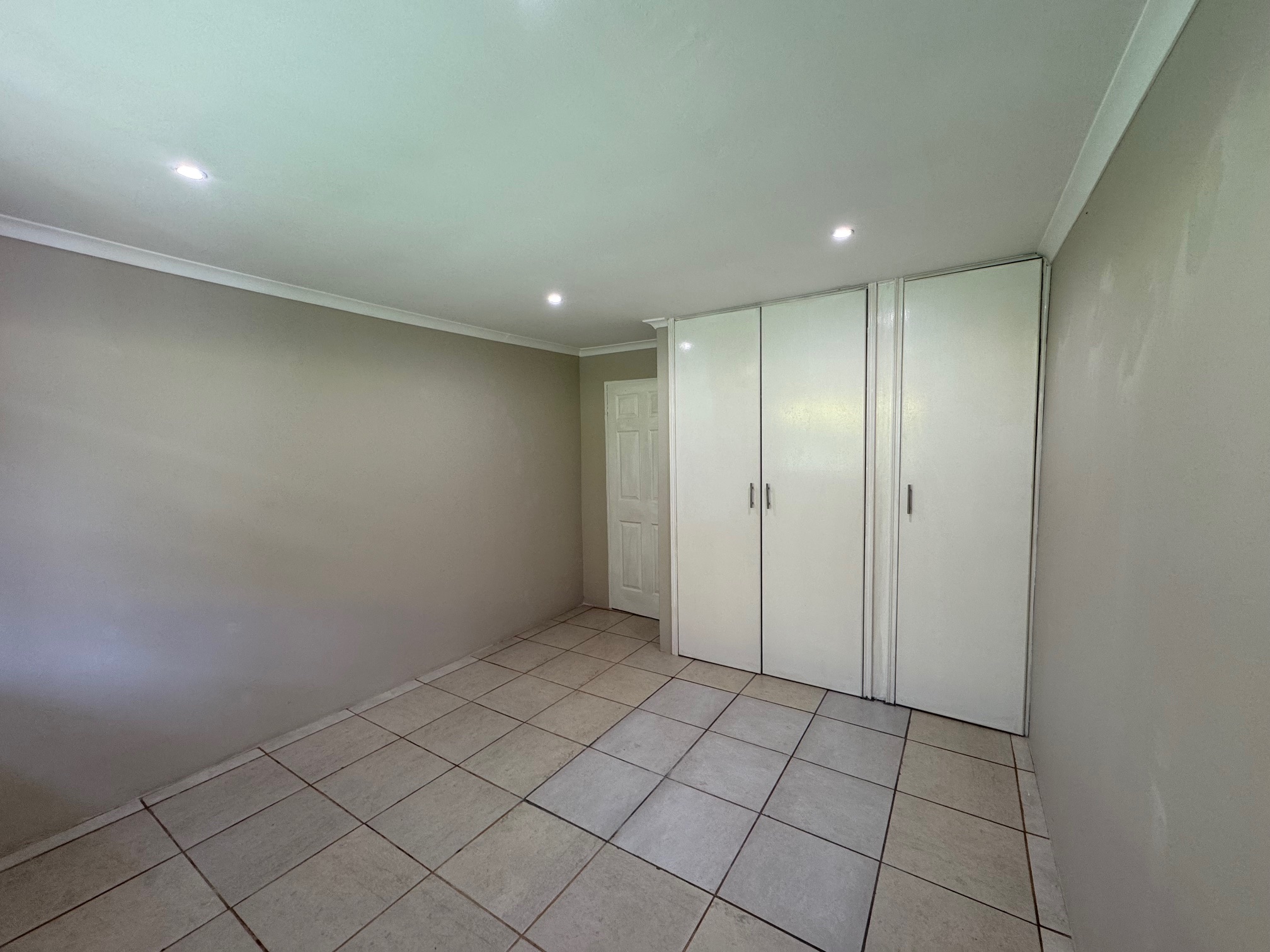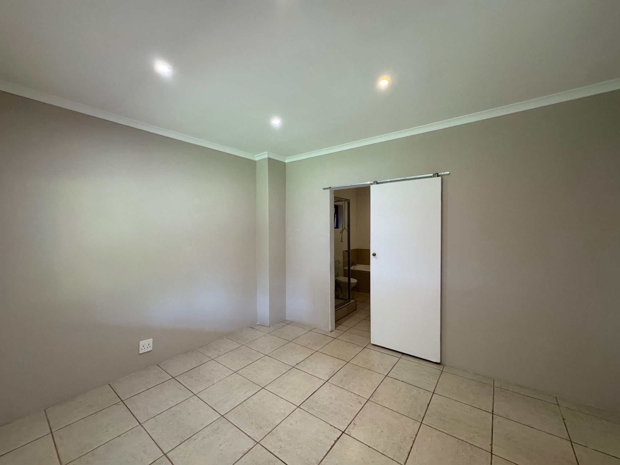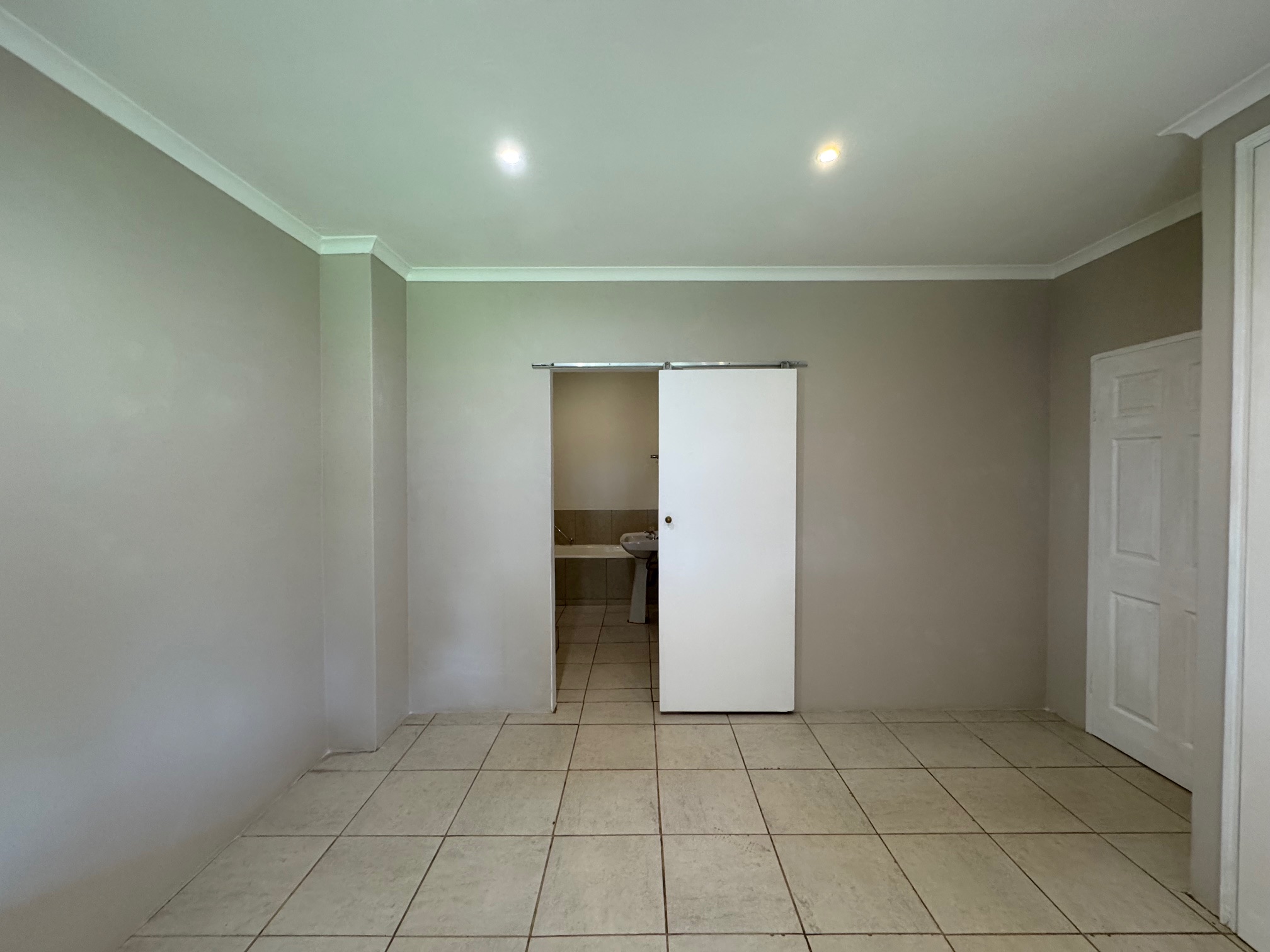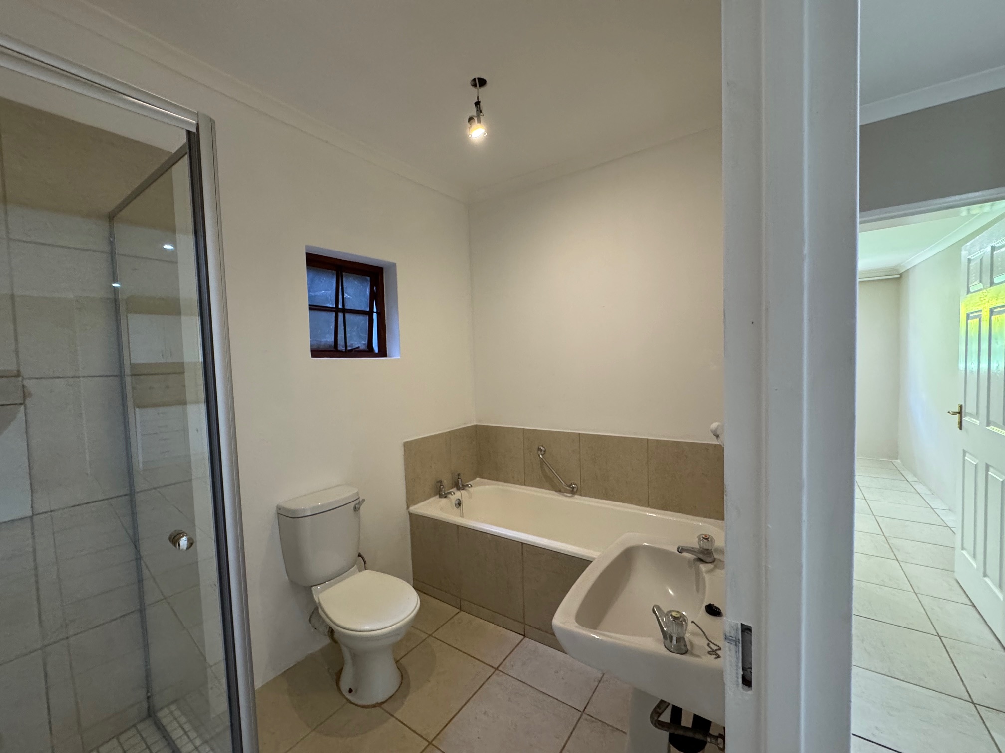 The main bedroom includes built-in cupboards and an en suite bathroom fitted with a shower, bath, basin, and toilet. This bathroom can also be accessed from the passage, making it convenient for guests.