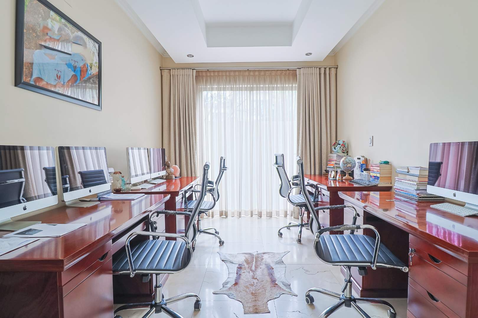 On the second floor, you will find four generously sized bedrooms, each adorned with laminated flooring, air conditioning, walk-in wardrobes, and en-suite bathrooms. This level also offers a pajama lounge, TV room, and a second study with a balcony that overlooks the garden. The main bedroom is particularly notable for its spaciousness and includes a pajama lounge or study area for added comfort.