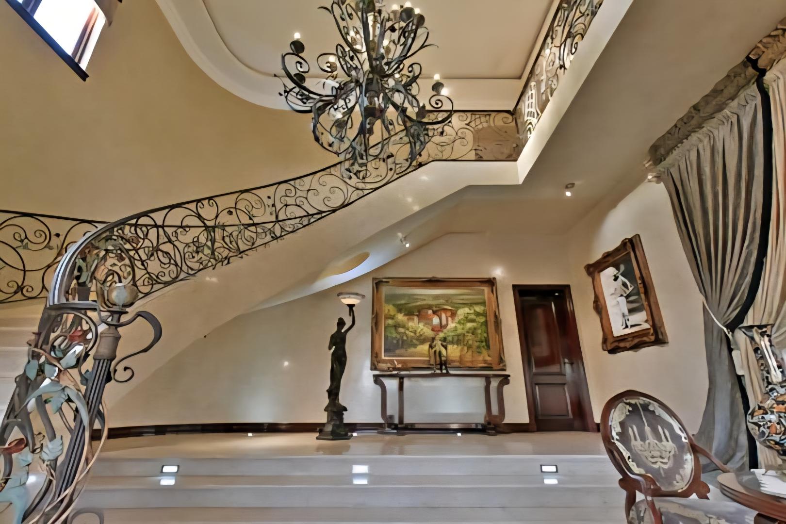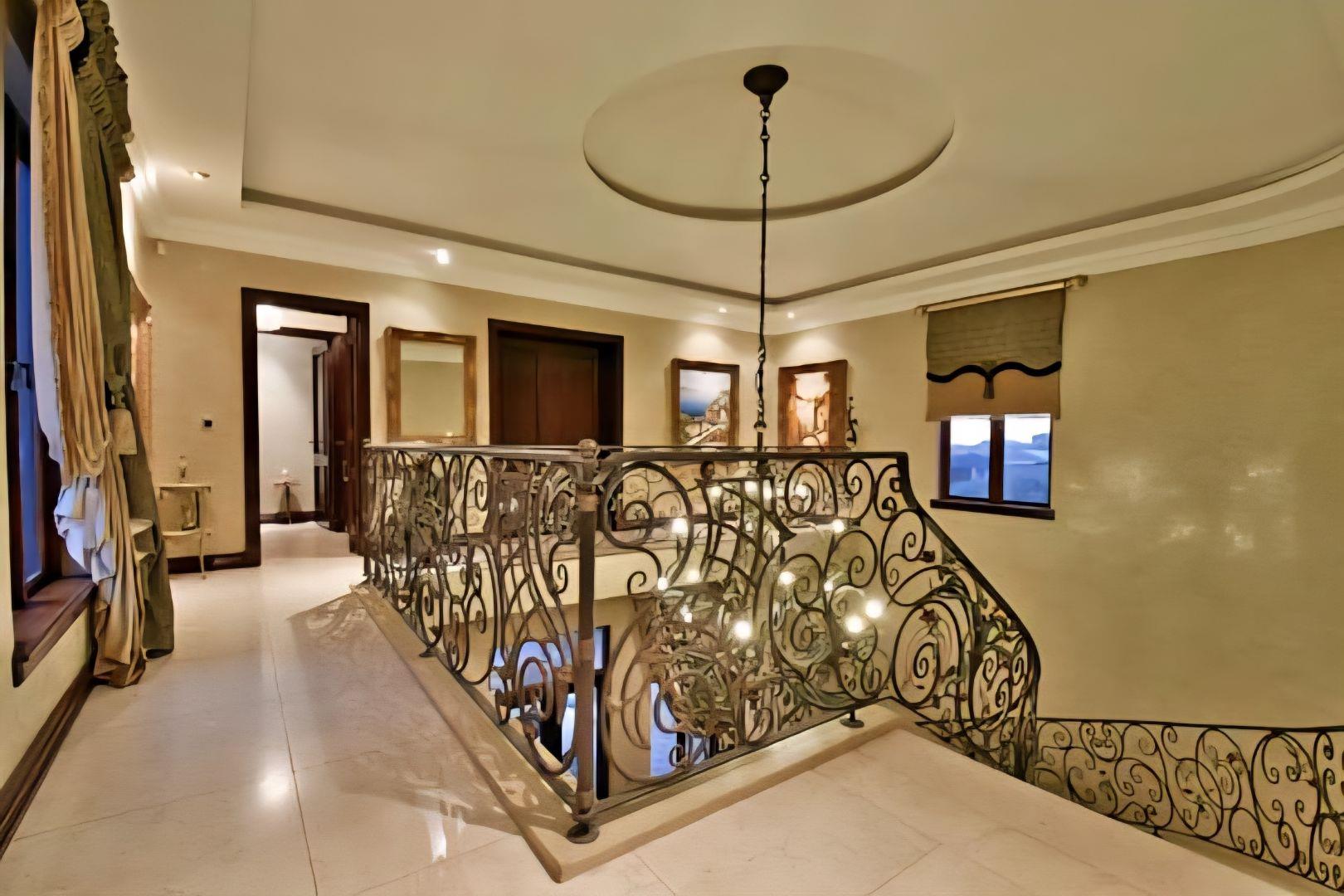 The home boasts Carrera marble flooring throughout, complemented by solid wooden doors and designer chandeliers. Underfloor heating ensures comfort in every corner. A gas fireplace, built-in central vacuum system, and comprehensive alarm system enhance the living experience.