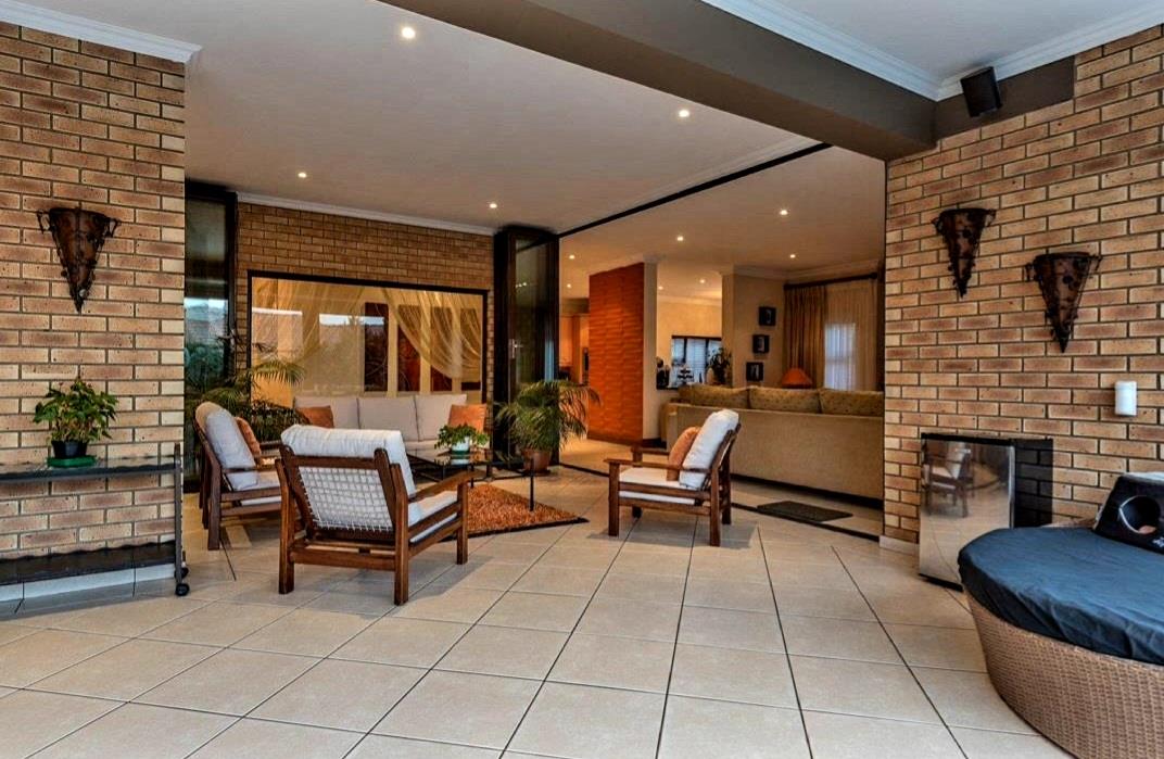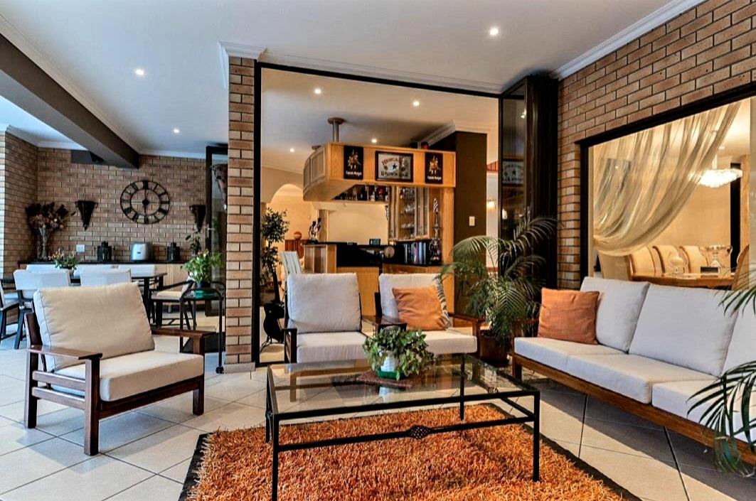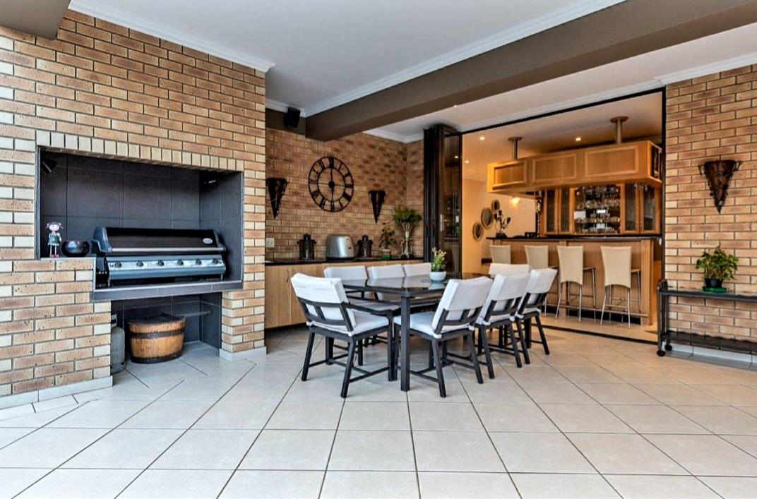 - Large semi-enclosed patio/entertainment area with built-in braai and wooden cabinets.