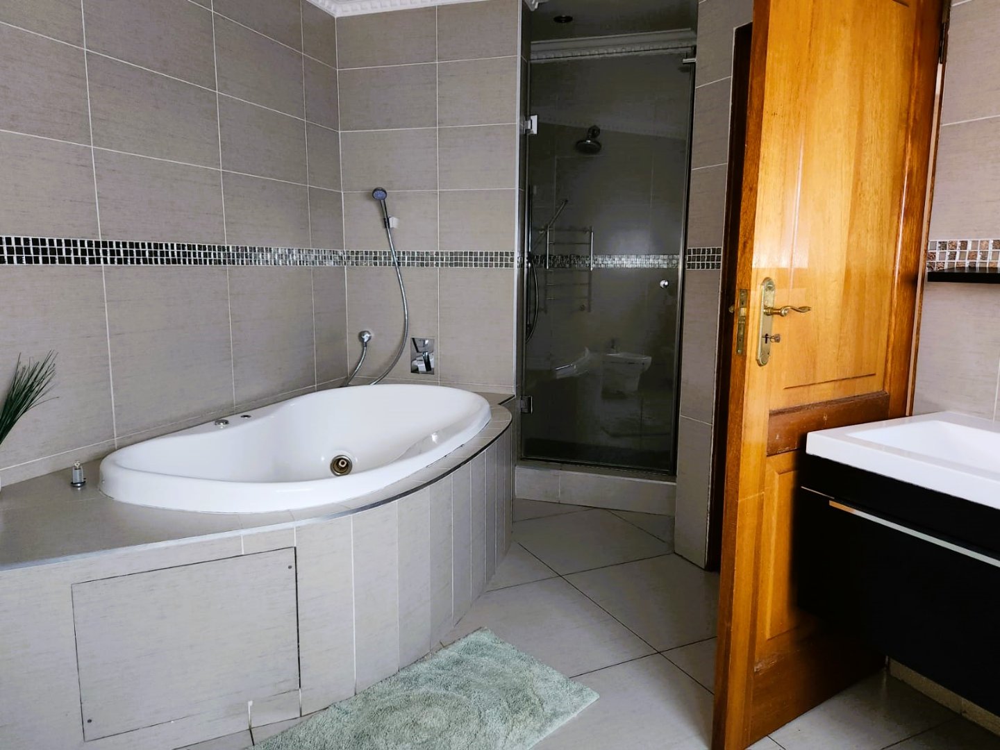 The kitchen is a chef’s delight, boasting a gas hob, eye-level oven, granite countertops, a cozy breakfast nook, and a separate laundry room for added convenience. The living areas include an elegant dining room, a spacious TV lounge, a second lounge for relaxed gatherings, and a dedicated study—ideal for those working from home.