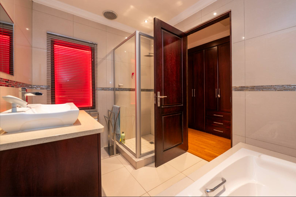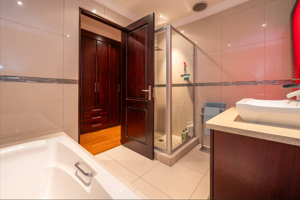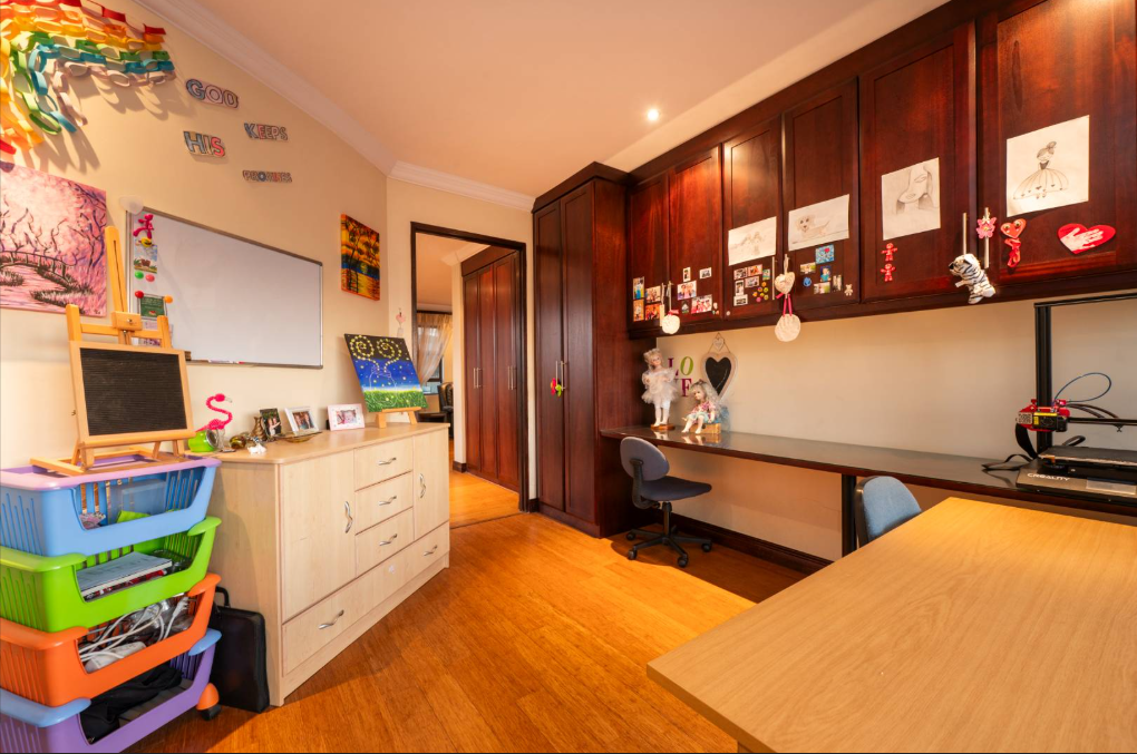 All four bedrooms are en-suite with built-in cupboards, offering privacy and comfort. The main suite is a luxurious haven with a spacious walk-in dressing room. A dedicated study and a large walk-in linen room add to the home’s thoughtful design.