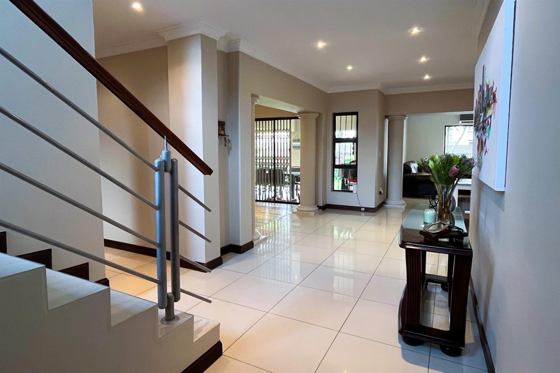 A dramatic double-volume entrance hall, framed by elegant columns and sleek tiled flooring, sets the tone for the quality and space that define this home. The layout offers excellent natural light throughout, enhancing the neutral palette and creating a warm, inviting atmosphere.