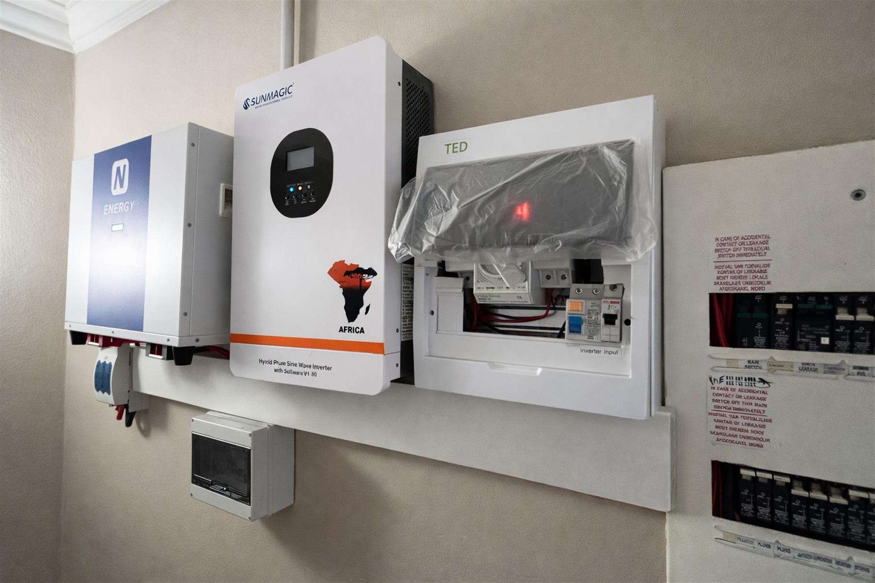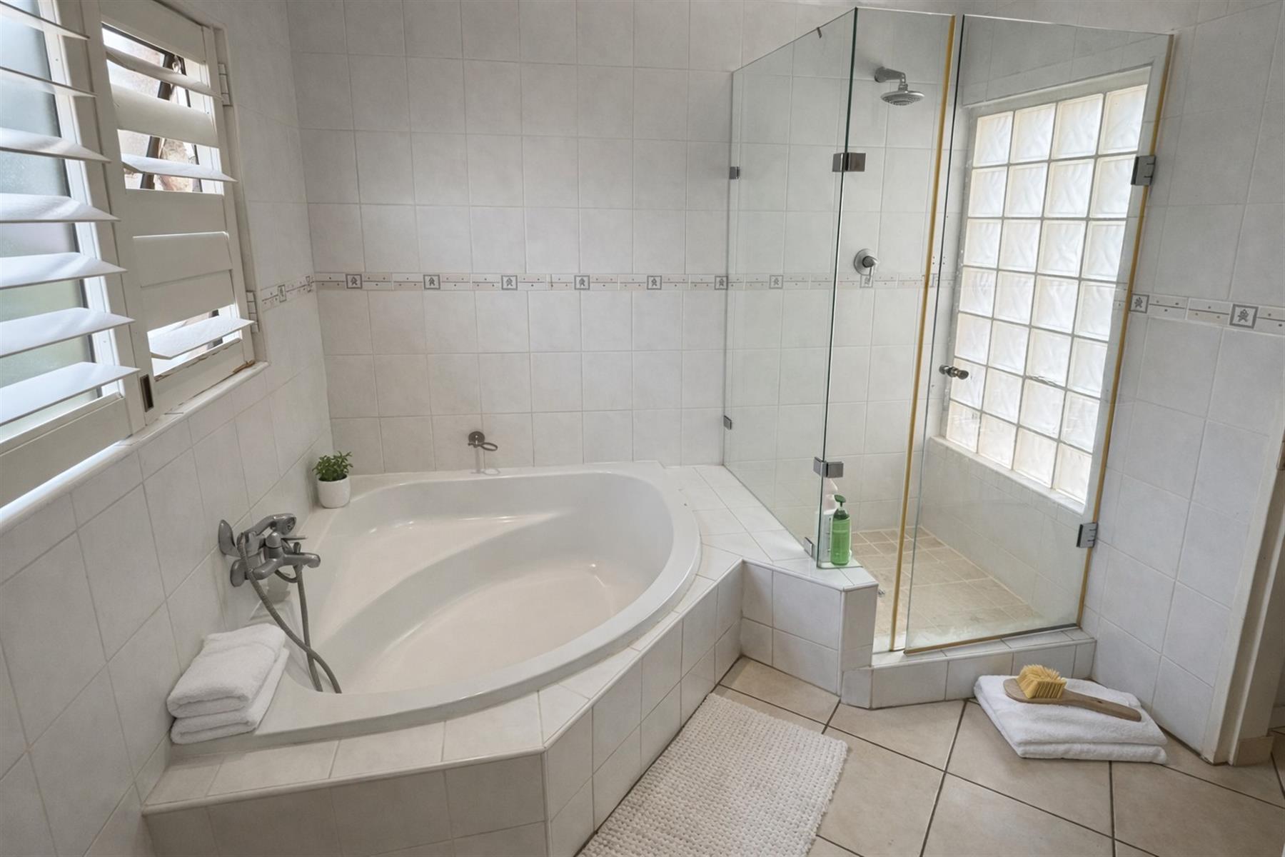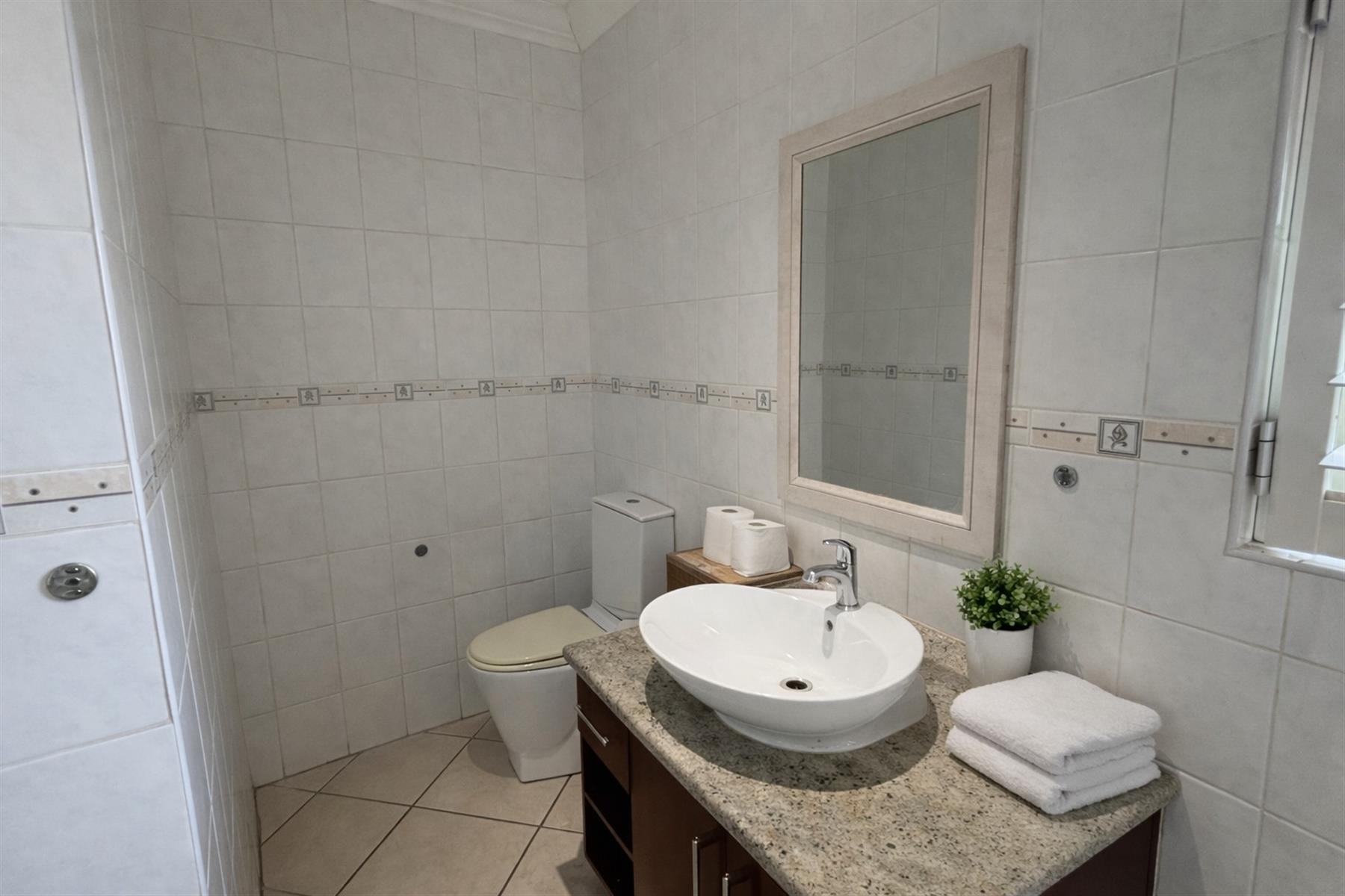 Accommodation is well planned with four bedrooms and two bathrooms. Downstairs, two generously sized bedrooms with built-in cupboards, ceiling fans, and aluminium windows share a full bathroom complete with a shower, spa bath, basin, and toilet. Upstairs, a cozy children’s bedroom and a spacious main bedroom create a private retreat, with the main suite enjoying its own full en-suite bathroom.