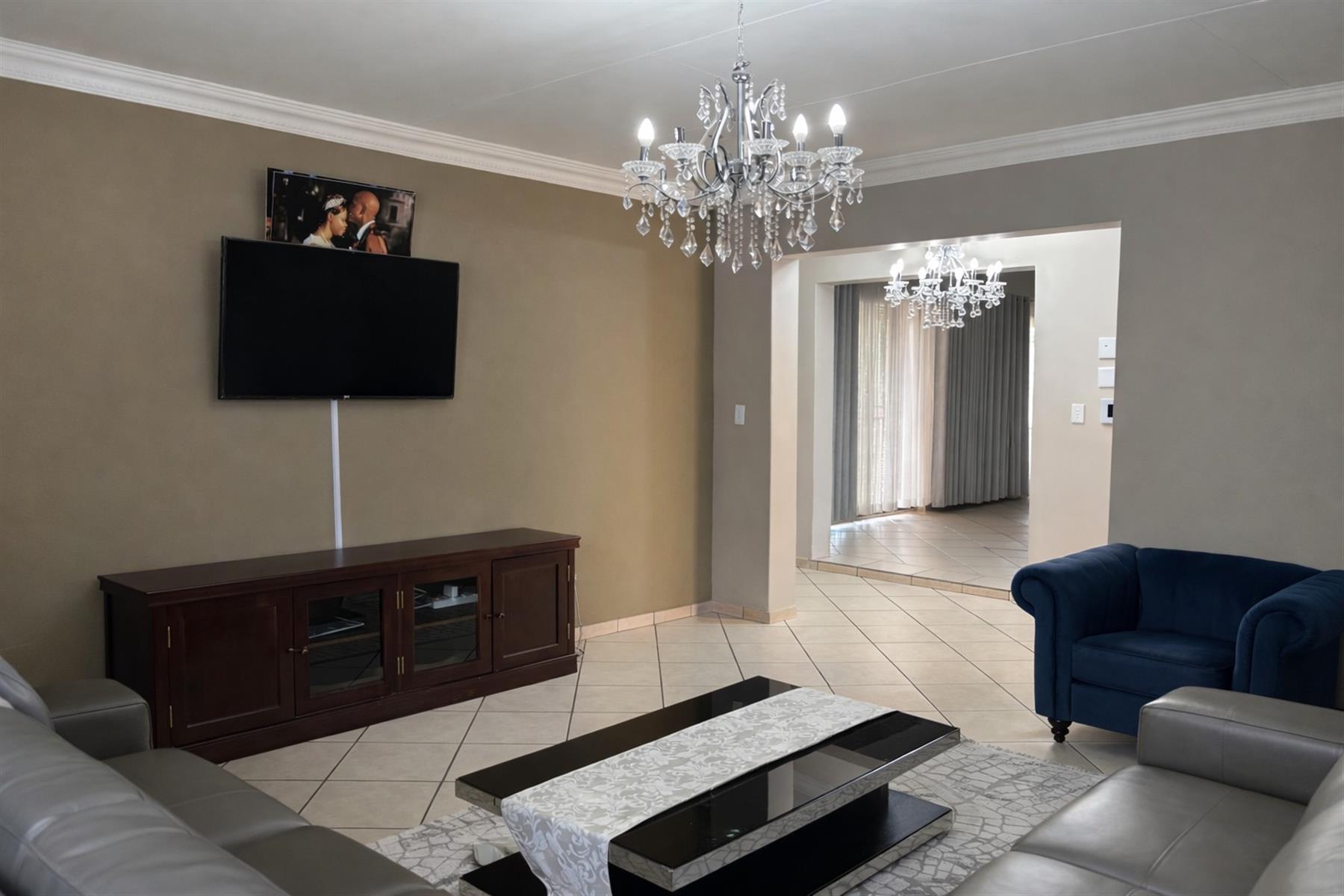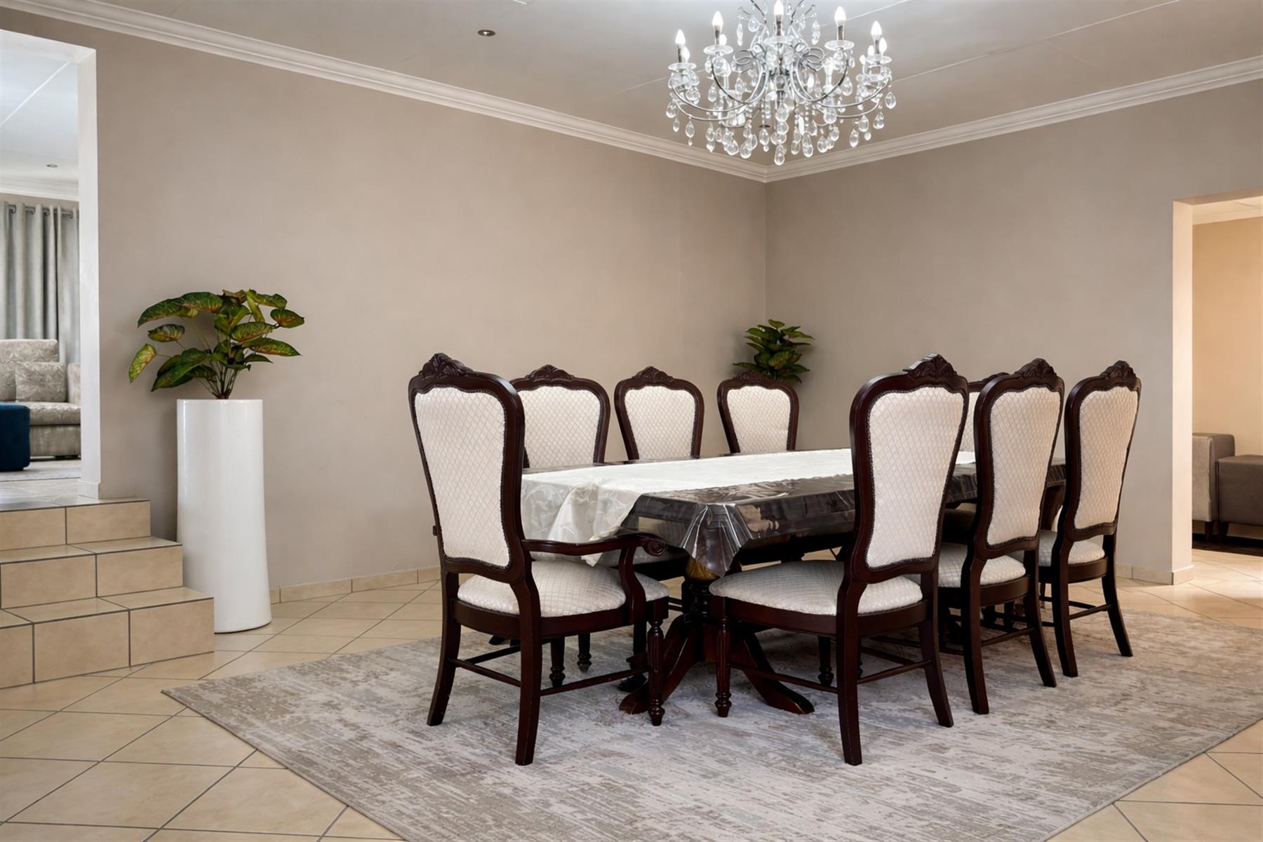 Step through the impressive front pivot door into a fully tiled entrance, where a striking chandelier sets the tone for the home’s warm elegance. To one side, a comfortable TV room invites relaxed family evenings, while opposite, a spacious dining room creates the perfect setting for memorable dinners and entertaining, with easy flow to the kitchen.