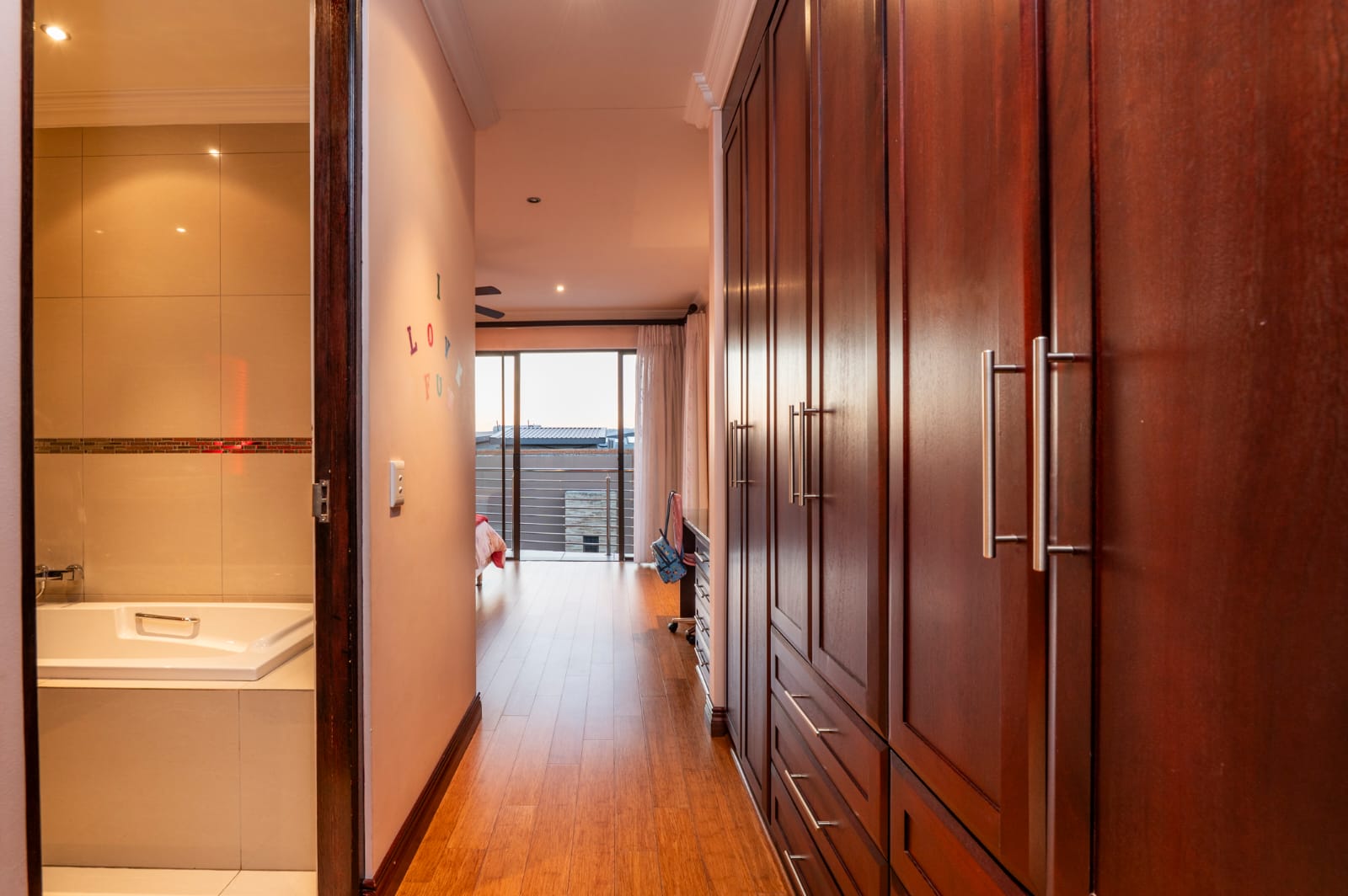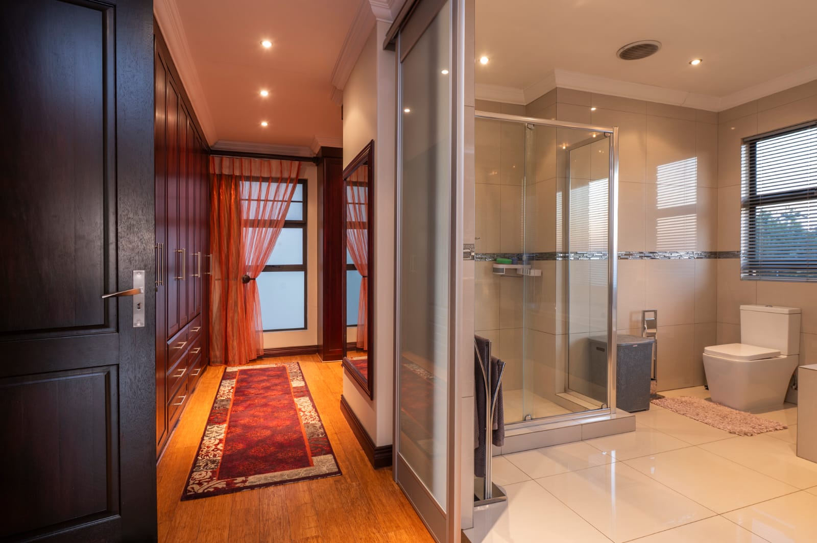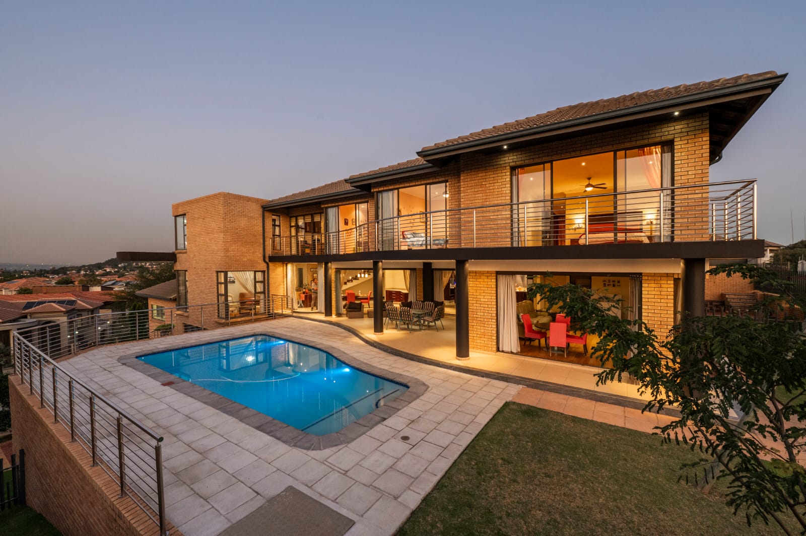 Nestled along the lush greenbelt of the nature reserve, this elegant face-brick four-bedroom home embodies luxury and serenity within this exclusive upmarket estate, offering breathtaking evening views. The ground floor welcomes you with an elegant entrance hall that sets the tone for the breathtaking luxury throughout this home. Enjoy multiple living areas, including a private lounge, an open-plan TV room, a cozy pajama lounge, and a formal dining room—perfect for hosting and entertaining. Versatile living spaces include a fully equipped teenage pad, granny flat, or home office complete with its own kitchenette, offering endless flexibility for your lifestyle needs. The chef-inspired kitchen features rich dark solid-wood cabinetry, a walk-in pantry, and a separate scullery and laundry for added convenience. This exceptional residence boasts four beautifully designed bedrooms, each with its own en-suite bathroom and built-in cupboards. The luxurious main suite, fit for a king and queen, offers a generous walk-in dressing room, a private study area, and a walk-in linen room for additional storage. Outdoor features include a sparkling swimming pool, a spacious garden, a large storeroom, three automated garages, a workshop, and ample parking space to accommodate guests with ease. For an exclusive and private viewing give me Melanie a call to set up the appointment