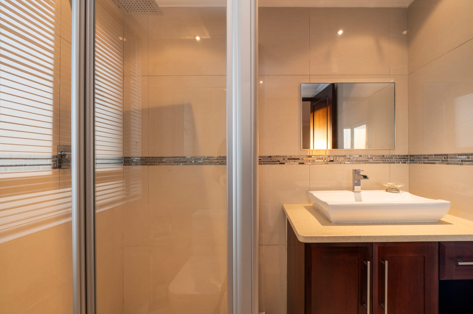 This exceptional residence boasts four beautifully designed bedrooms, each with its own en-suite bathroom and built-in cupboards. The luxurious main suite, fit for a king and queen, offers a generous walk-in dressing room, a private study area, and a walk-in linen room for additional storage.