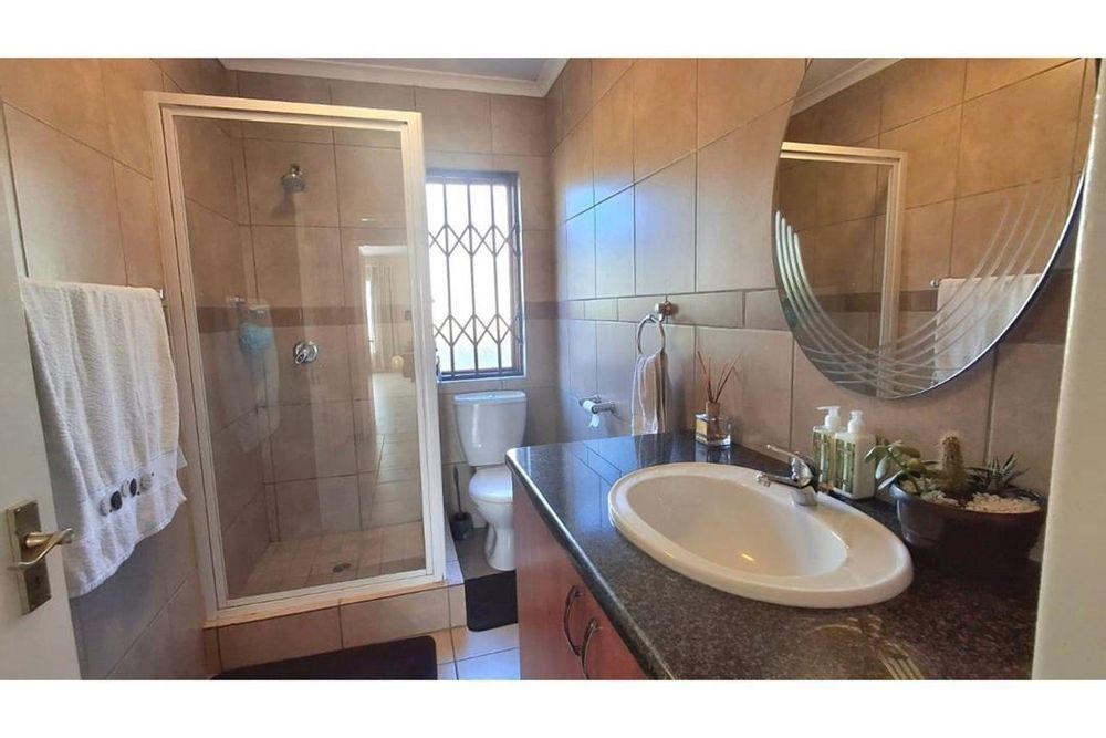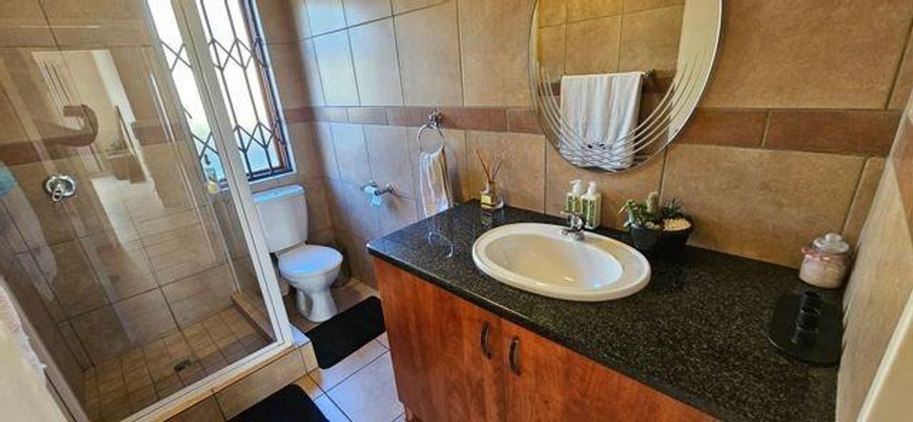 The main bedroom offers a generous en-suite with a bath, double vanity, under-counter storage, and a large built-in mirror, while the second bathroom is fitted with a shower, basin, and toilet. Both bedrooms feature built-in cupboards, excellent natural light, and timber-framed windows with matching burglar bars for style and security.