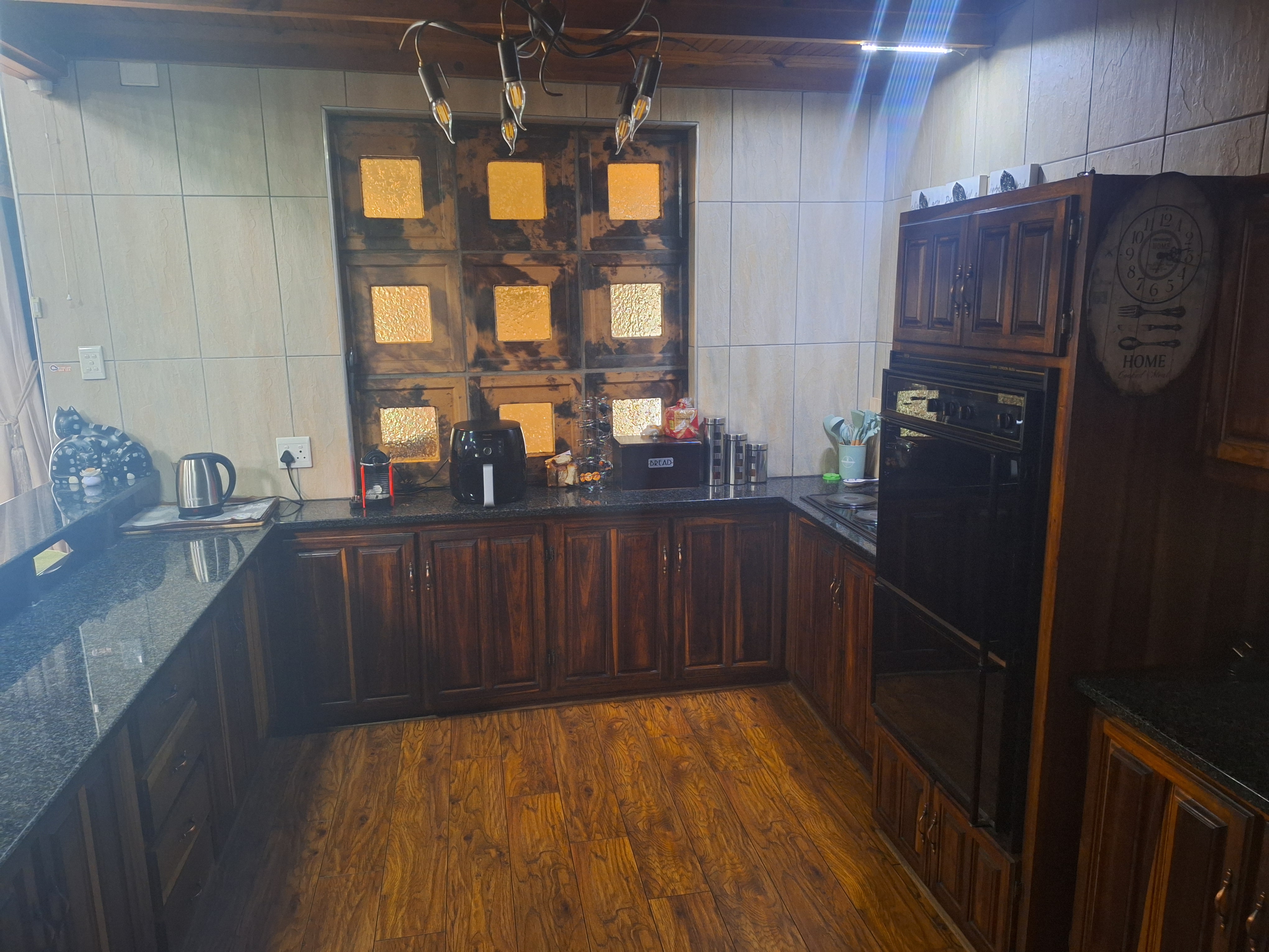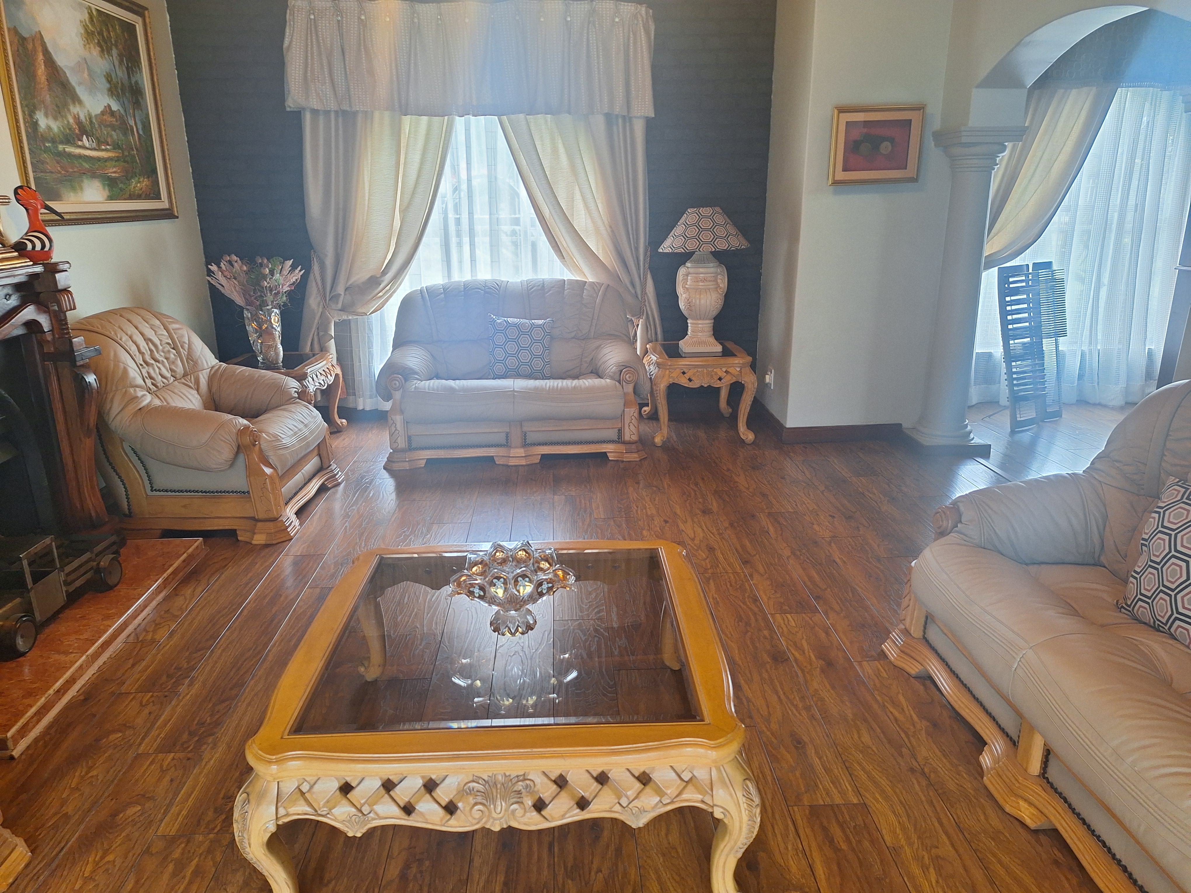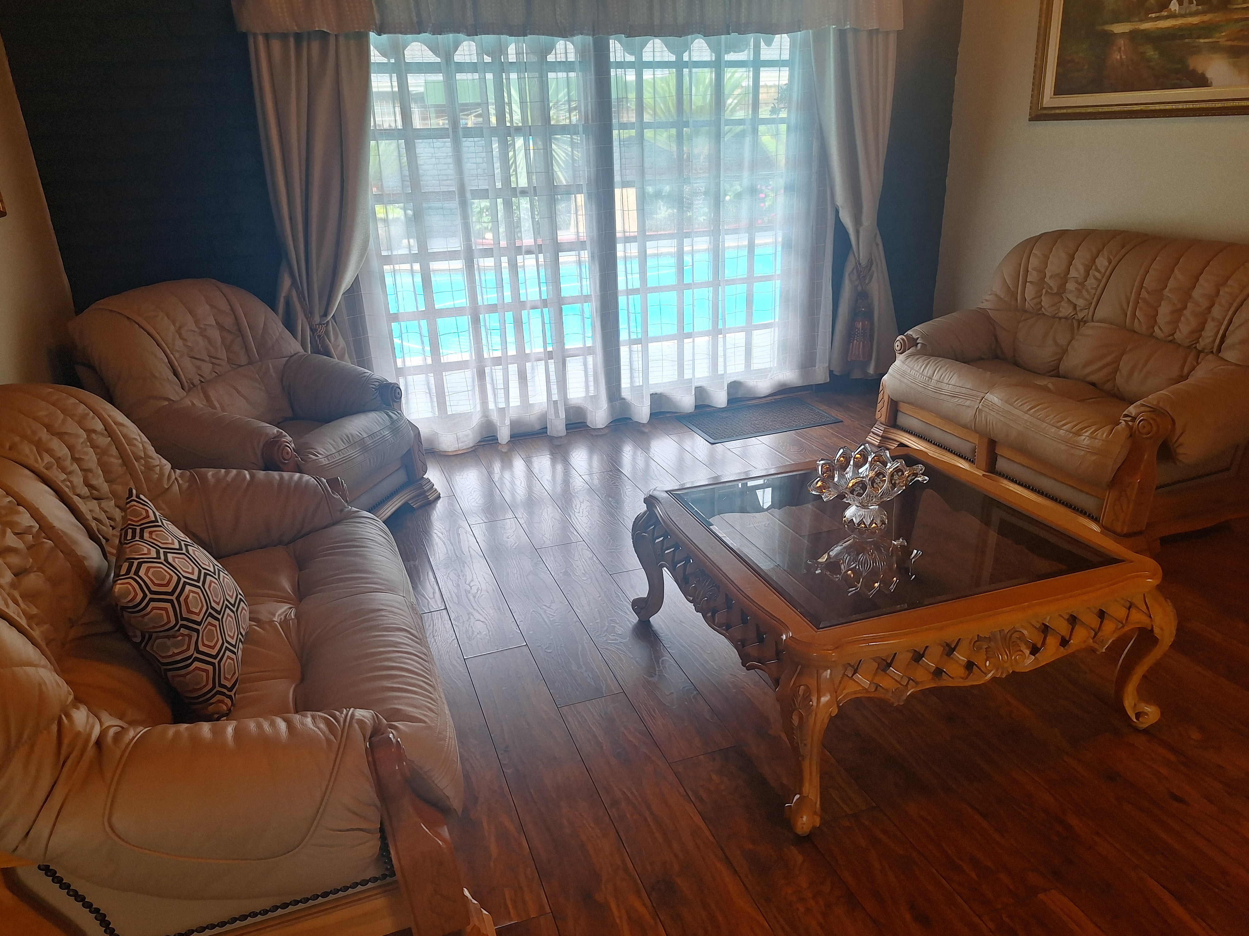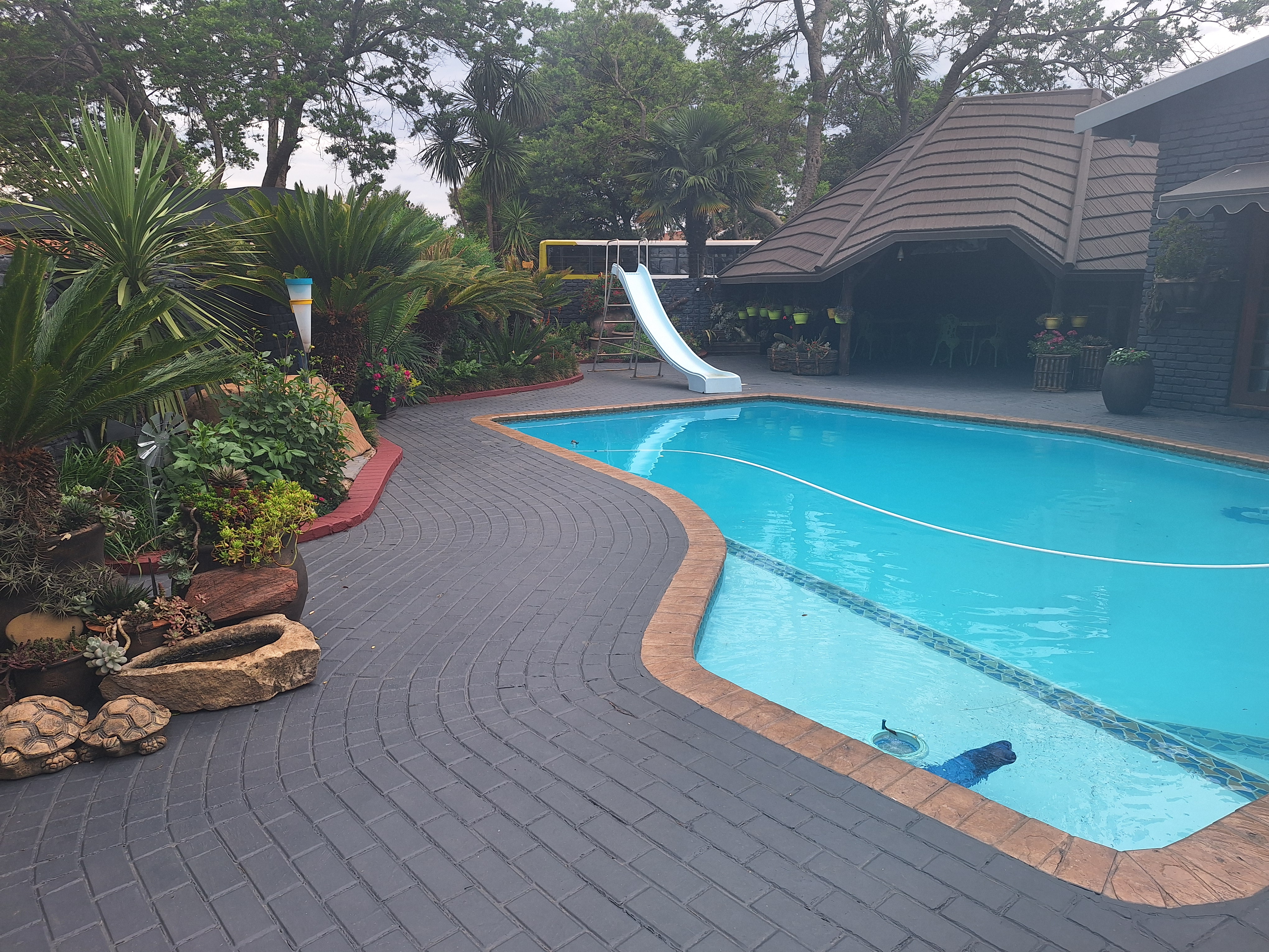Outside the property continues to impress with a double, tiled garage, a huge lapa with a built-in braai and a grass roof finished with Harvey tiles, and a sparkling swimming pool set in a well groomed garden.