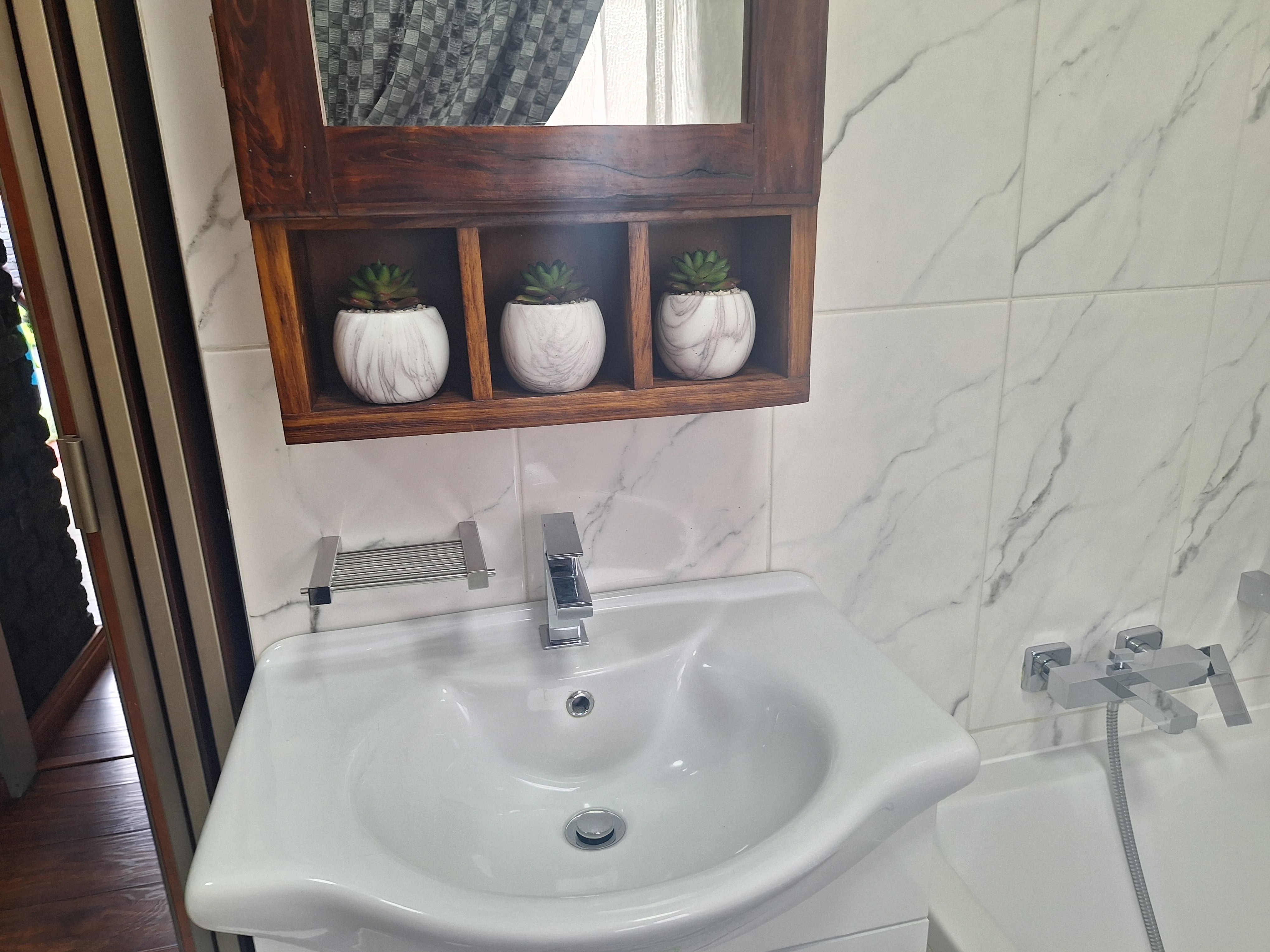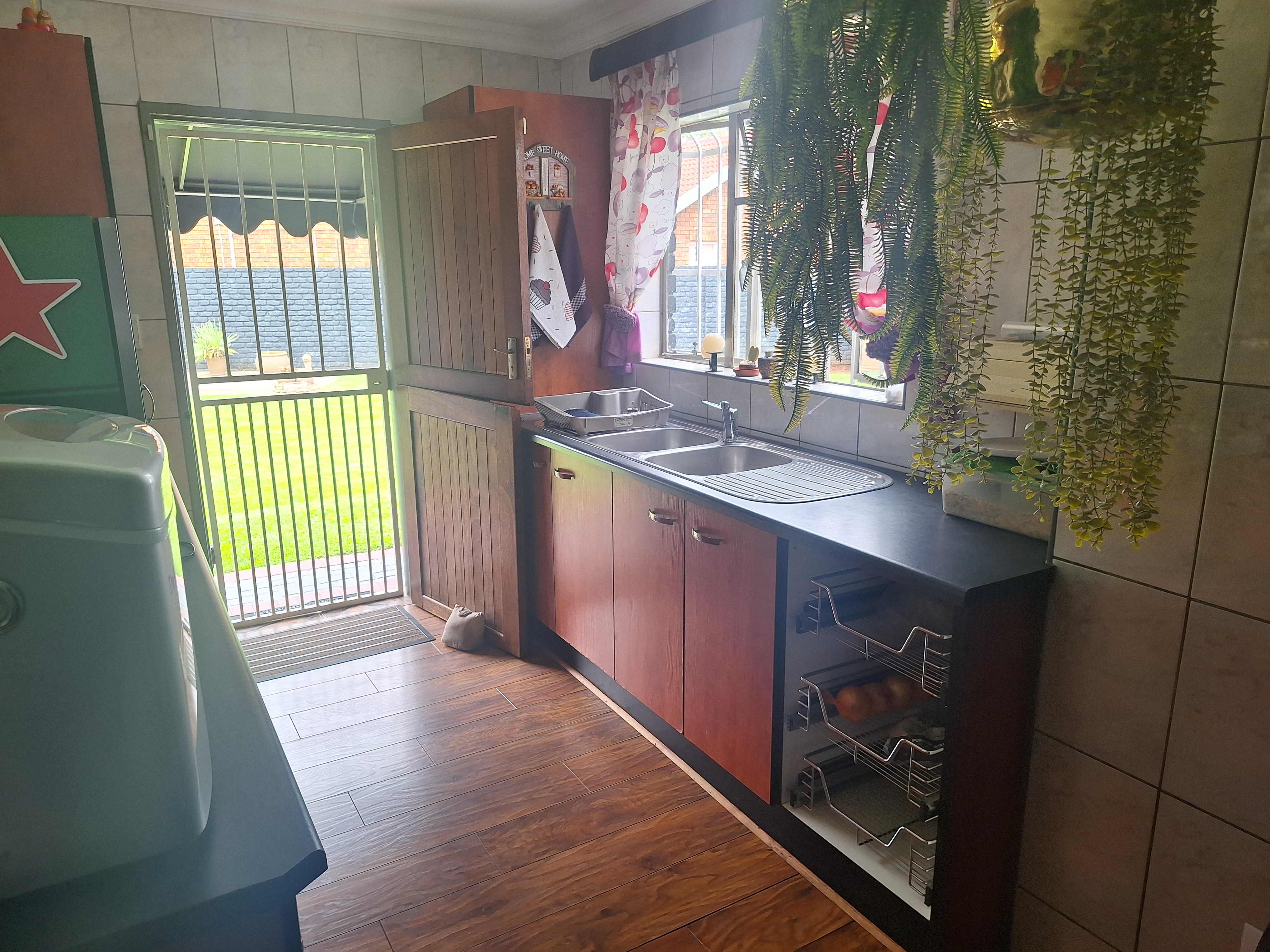The open plan lounge and dining room flow seamlessly into a wooden kitchen with ample cupboard space and a convenient breakfast nook. Separate laundry/scullery.